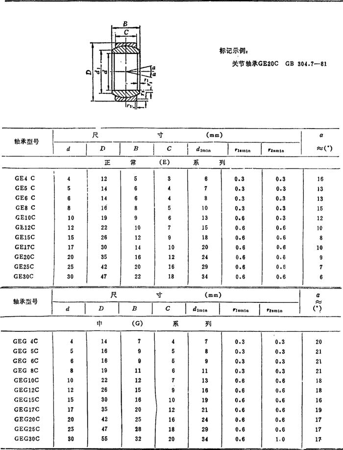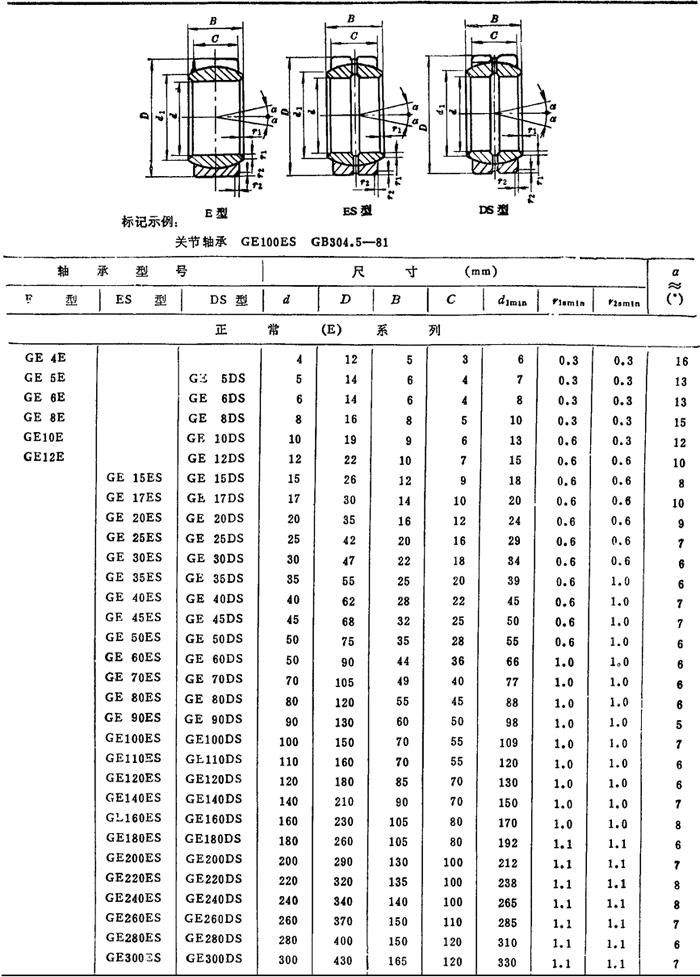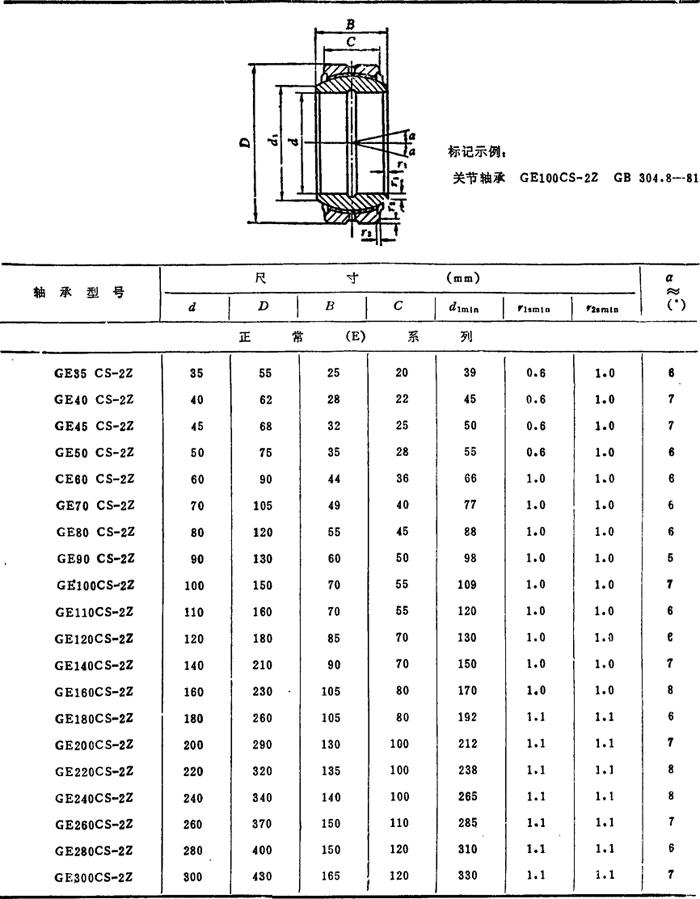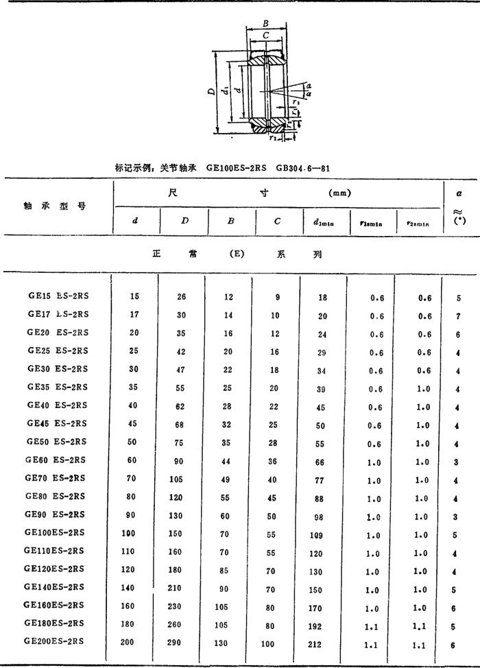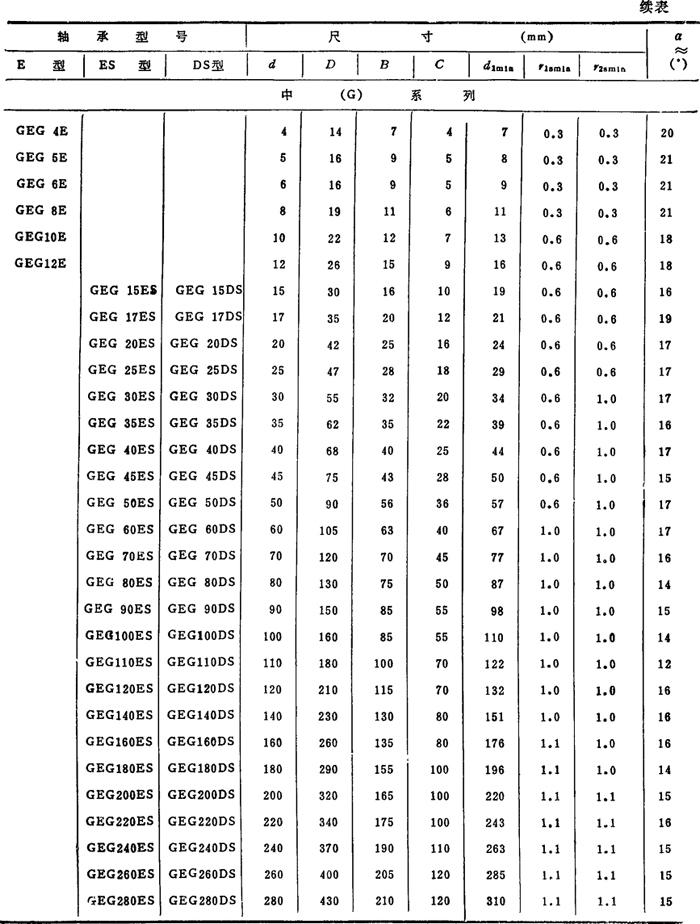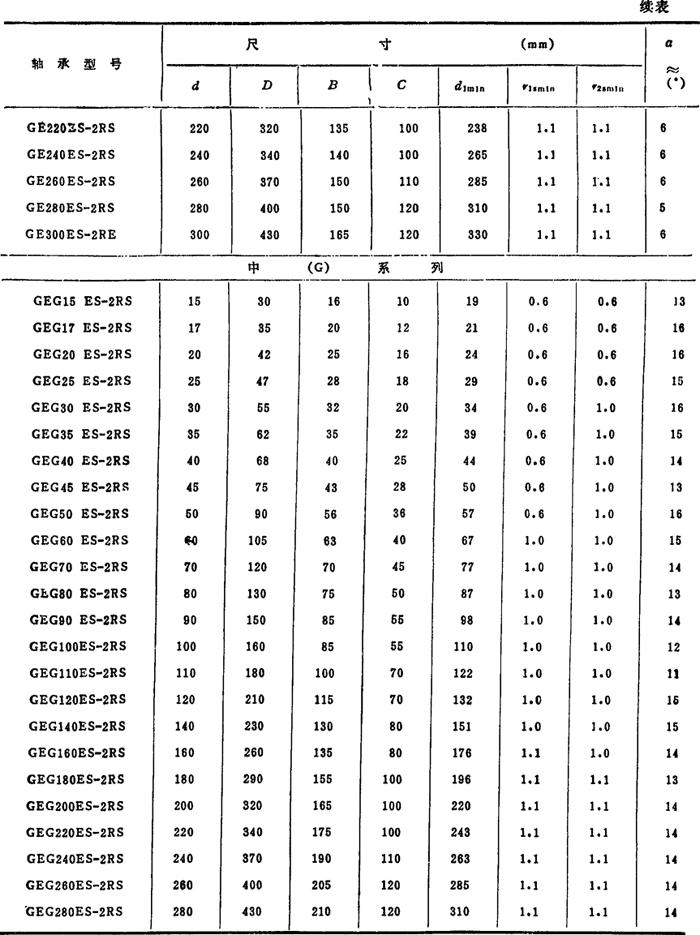 释义 | 关节轴承 关节轴承的内、外座圈之间为球面滑动结合,常用于轴颈角度变化范围大、速度很低的回转或摆动的支承或接头装置中。按照受力方向,可分为向心关节轴承、角接触关节轴承和推力关节轴承。表4.9-39~4.9-42列出几种常用的向心关节轴承的型号和尺寸。与关节轴承相配的轴颈、外壳孔及垫圈的表面粗糙度、尺寸和形位公差要求见表4.9-37和4.9-38。 表4.9-37 向心关节轴承相配轴、孔的表面粗糙度及配合要求 注: ❷ 表中规定的配合只适用于轴为实心或厚壁空心及工作温度不超过100℃的情况。 ❸ 内圈采用h配合时,轴颈需淬硬。 表4.9-38 关节轴承相配轴、孔的形位公差(不大于) μm 注: 表4.9-39 E、ES和DS型向心关节轴承(摘自GB304.5—81) 注: ❷ a系轴承的一个套圈对水平轴线的允许倾斜角。 ❸ 表中r1smin为r1的单向最小倒角,r2smin为r2的单向最小倒角。 表4.9-40 ES-2RS型向心关节轴承(摘自GB304.6—81) 注: ❷ a系轴承的一个套圈对水平轴线的允许倾斜角。 ❸ 表中r1smin为r1的单向最小倒角,r2smin为r2的单向最小倒角。 表4.9-41 C型自润滑向心关节轴承(摘自GB304.7—81) 注: ❷ a系轴承的一个套圈对水平轴线的允许倾斜角。 ❸ 表中r1smin为r1的单向最小倒角,r2smin为r2的单向最小倒角。 表4.9-42 CS-2Z型自润滑向心关节轴承(摘自GB304.8—81) 注: ❷ a系轴承的一个套圈对水平轴线的允许倾斜角。 ❸ 表中r1smin为r1的单向最小倒角,r2smin为r2的单向最小倒角。 |