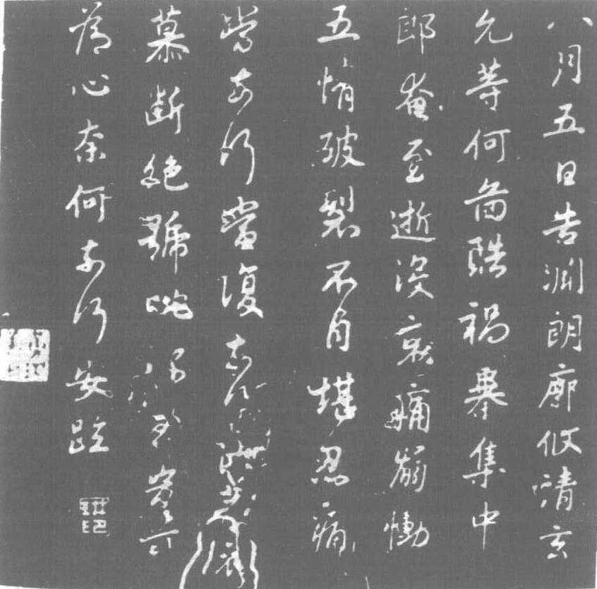 謝安·八月五日帖 (東晉·太輿三年——太元十年 320~385) 陳郡陽夏(今河南太康) 人。字安石。奕弟,萬兄,尚從弟,屬山陰之望族。少時神識沈敏,風宇條暢,時負盛名。寓居會稽,放情丘壑。時人每言安石不出,將如蒼生何?年逾不惑,始應桓徵為司馬,出為吴興太守遷吏部尚書。簡文帝 (司馬昱)崩,孝武 (司馬曜)親政,進中書監,封建昌縣公,進拜太保,卒贈太傅,謚文靖。以賢相負一世譽望。安文雅有德量,與王羲之交厚。工書,學草、正於右軍(王羲之),入其堂奥。右軍云:“卿是解書者,然知解書者尤難。”羲之第七子獻之每作好書,必謂被賞,安輒題後答之。清劉墉《論書絶句》評其書云:“咫尺波瀾有大觀,何須海陸與江潘,寥寥謝傅平生筆,數帖豐神學步難。” 其傳稱作 〈八月五日帖〉,為行書尺牘七行,向其甥告以弟萬卒世之訊。真迹嘗歸北宋米芾,而今只見《餘清齋帖》、《戲鴻堂帖》諸刻本。 |