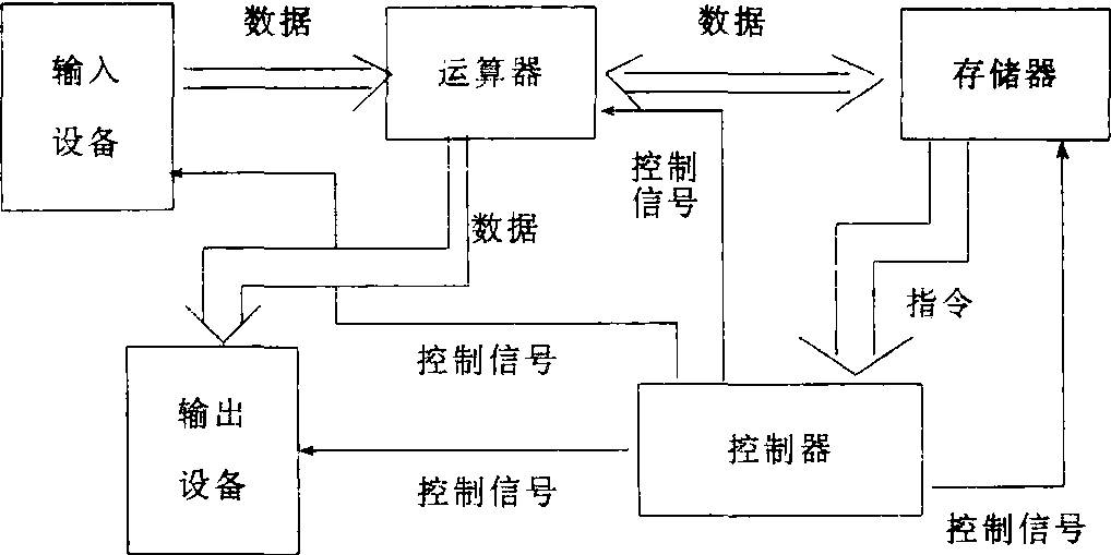 计算机一开始是作为一个计算工业出现的,显然,首先要有能代替算盘进行运算的部件,这就称之为运算器;其次要有能起到纸和笔的作用的器件,它能记忆原始题目、原始数据和中间结果, 以及为了使机器能自动进行运算而编制的各种命令。这种器件就称为存储器;再次,要有能代替人的控制作用的控制器, 它能根据事先给定的命令发出各种控制信息, 使整个计算过程能一步步地进行。但是光有这三部分还不够,原始的数据与命令要输入,所以,需要有输入设备;而计算的结果(或中间过程)需要输出,就要有输出设备,这样就构成了一个基本的计算机系统, 如图所示的计算机结构图。