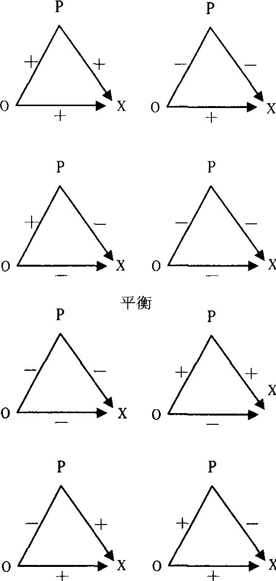 对于态度的形成,西方社会心理学家提出过三种不同的理论解释:(1)学习论,认为态度和其他习惯一样是通过后来学习而获得的。(2)诱因论,认为一个人采取的态度受他对收益多少的考虑决定。(3)认知一致论,这是目前影响较大的一种理论。认知一致论强调人在认识中总是寻求一种平衡的、一致的、协调的状态。一个人如果有几种信念或观点彼此不协调,他将感受到心理上的压力,进而引起认知结构的重新组合, 以便恢复认知结构的一致性状态。这一理论直接起源于心理学中格式塔学派的知觉完形观和勒温(Lewin,K.)的场论,它试图说明态度的不同成分之间有趋向一致的压力。认知一致论有三种变式。第一种变式是平衡论(balance theory),它是由海德(Heioler,F.)在1958年出版的《人际关系心理学》中提出。海德提出,在一个简单的认知系统里,存在着欲使这一系统达到一致和平衡的压力,如果出现了认知不平衡,趋向平衡的形式在于改变现存的认识之一,或添加一种新的认识,以校正不平衡。在这个系统中存在三项要素:P代表观察者,O代表另外一个人,X代表一个态度主题。这三项要素之间存在三项评估:P对O的评估、P对X的评估,以及O对X的评估(见图)。所谓平衡的系统是指,你和你所喜欢的人意见一致,或和你不喜欢的人意见不一致,不平衡的系统则指,你和你喜欢的人的意见不一致,或和你不喜欢的人意见一致;换言之,只有在这个系统的三项评估中,有一项或三项评估为正时,系统才能达到平衡。