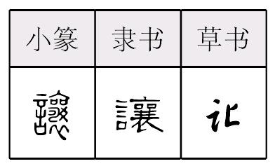 rànɡ讓,形声,从言,襄声,本义为以言语相责备,引申为避让、不争、把利益或好处先给别人、索取一定代价而把东西给人、请人接受招待、允许、介词(相当于“被”)等。近代俗字、《手头字》把音符改作上;《简化字表》又把意符类推简化,作“让”。让〈动〉(1)谦让;逊让;礼让。 《金》六: 西门庆道:“老九何故见外?且请坐。”二人~了一回坐下。又七: 送了两步,西门庆~回去了。 (2) 特指酒席上主人劝请客人吃喝。 《聊·墙》二: 张老自家一连吃了三碗,银匠又~,张老说:“饱极了。” <方>今山东、江苏徐州话有此义。 |