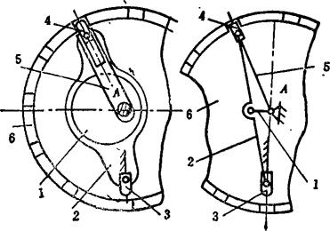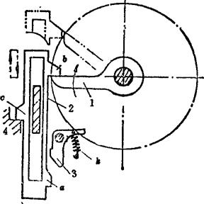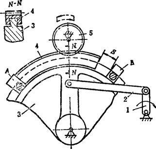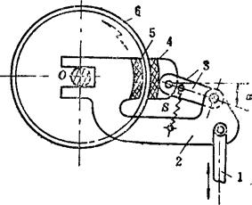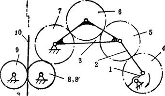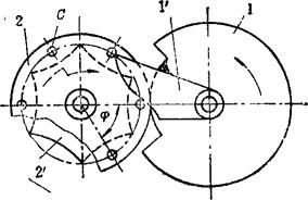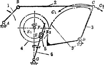 例5.2-104 偏心轮分度机构  端部有滑槽的杆5空套在轴A上,铰接于摆杆2上端部的滑销4可在滑槽内移动,而铰接于2下端部的滑销3可沿固定导轨移动。当主动偏心轮1作曲柄转动时,通过摆杆2使两滑销4、3交替拨动或锁住带有槽孔的分度盘6作单向间歇转动。该机构用在搓线机输送器上。 例5.2-105 齿轮连杆组合停歇机构  主动曲柄1与齿轮4固连,齿轮4、5、6、7的齿数均相同,因此曲柄1转一圈,轮7也转一圈,但轮7的角速度是非匀速的,有一段停歇时间。以此为基础附加送纸棍8、9,则被送进的纸张10也有片刻停歇,便于切纸刀作切纸作业。此机构在香烟包装机的送纸机构与软糖包装机的送糖机构中均有应用。 例5.2-106 瞬时停歇摆动机构  由ABCD组成的曲柄摇杆机构,其摇杆CD在两极限位置C1D、C2D时,角速度较小,且改变方向;由FEG组成的摆动导杆机构,其导杆EG在两极限位置E1G、E2G时,角速度也较小,且改变方向。当用齿轮4和扇形齿轮3′将它们联系起来,并使之同时到达极限位置,则导杆6在两极限位置附近实现近似停歇,且可停歇较长时间。 例5.2-107 摩擦式间歇转动机构  主动杆1通过摇臂2和推杆3使摩擦片4、5夹紧或松开轮6的内外轮缘,而使其绕轴O作定向间歇转动。当杆1向上推动摇臂2绕O点向上转动时,伴随有微量横向外移,使摩擦片5贴紧轮6内缘,而摩擦片4在摩擦力作用下使3向下摆动,并借助辅助弹簧S的拉力,使4紧贴轮6外缘,于是4、5夹紧轮6的轮缘,并推动其作逆时针转动;当主动杆1拉摇臂2向下转动时,4与6间的摩擦力使推杆3向上摆动而成浮动,这时轮6停歇。其特点是摩擦面积大,可用于大载荷。一般取a≤7°。 例5.2-108 针轮间歇转动机构  主动轮1与驱动齿1′固连,设有z个针齿C的针轮2与设有z个凹圆弧的星形锁止轮2′同轴固连。驱动齿1′与针齿啮合时,推动轮2转动;当1′与针齿脱离啮合时,靠轮1的外凸圆弧与轮2′的内凹圆弧配合,实现轮2的停歇。轮1每转1周,轮2的转角为 。 例5.2-109 重力急回式间歇移动机构  主动转臂1接触上凸耳b时,带动移动杆2上升;当2升至下凸耳a被摆动挡块3钩住时,1与b正好脱离,2停歇;当1继续转动到与挡块3接触时,使3与2脱钩,2以自身重力快速下落,直至凸耳c接触凸台4,2又进入停歇状态。其特点是:有快速下落的急回特点;一个循环过程的两次停歇时间不等。 例5.2-110 滑动齿圈式双侧停歇摆动机构  主动曲柄1通过连杆2带动扇轮3摆动,扇轮设有挡块A、B和滑动齿圈4。当扇轮顺时针摆动时,挡块A推动齿圈与齿轮5啮合,使5逆时针转动;当扇轮逆时针回摆时,齿圈4在扇轮的导轨上滑动,这时齿轮5停歇,直至挡块B接触到齿圈,齿轮5方可顺时针转动;扇轮再次变向摆动时,齿轮5同样也有一段停歇时间。其特点是:作双侧停歇;改变挡块B与齿圈的间距弧长S,可调整轮5的停歇时间。 |
