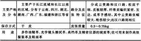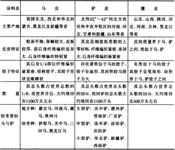 释义 | 其它皮 (一)马皮、驴皮和骡皮 我国马匹的总数占世界首位,约占世界马匹总数的1/6。我国也是世界主要产驴和骡的国家之一,其驴与骡的总数占世界总数的20%和25%,骡有“驴骡”和“马骡”之分,公马与母驴交配所产的骡称为“驴骡”,反之则为“马骡”。“马骡”是骡的主体。 我国马及驴的品种及分布见图1-31。 ( )马的地方品种:1-蒙古马 2-锡尼河马 3-鄂伦春马 4-河曲马 5-大通马 6-岔口驿马 7-哈萨克马 8-焉耆马 9-巴里坤马 10-云南马 11-建昌马 12贵州马 13-百色马 14-藏马 15-利川马 △马的培育品种:1-伊犁马 2-三河马 3-金州马 4-铁岭挽马 5-吉林马 6-黑龙江马 7-关中马 8-渤海马 9-黑河马 10-山丹马 11-伊吾马 〇驴的地方品种:1-关中驴 2-德州驴 3-晋南驴 4-广陵驴 5-泌阳驴 6佳米驴 7庆阳驴 8新疆驴 9华北驴 10-西南驴 马皮、驴皮及骡皮主要产地及其特征见表1-46。 表1-46 马皮、驴皮和骡皮的主要产地及其特征 (二)麂皮 麂皮的主要产地及其基本特征见表1-47。 表1-47 麂皮的主要产地及其基本特征 |