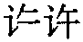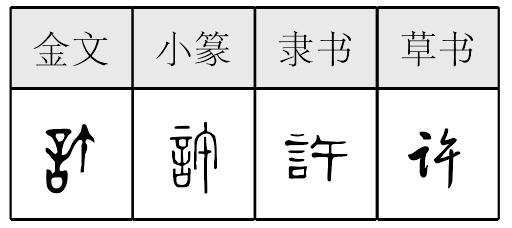 許,表意,从言从午,午为杵,指捣杵,本义读hǔ,捣杵舂米时呼喊以助劳,引申为集体劳作时共同发出的号子声(用以协调步伐,一齐出力);又读xǔ,引申为应允、答应给予、女方接受男方求亲、认可、称赞,假借为数词(表示约数,相当于“左右”“上下”)、姓等。《简化字表》类推简作“许”。 【辨析】 以“许”作音符构成的形声字一般读hǔ:浒。许〈代〉指示代词。这么;如此。 《金》十一: 爹~久怎的也不在里边走走?例又见〖许大〗❶。 |