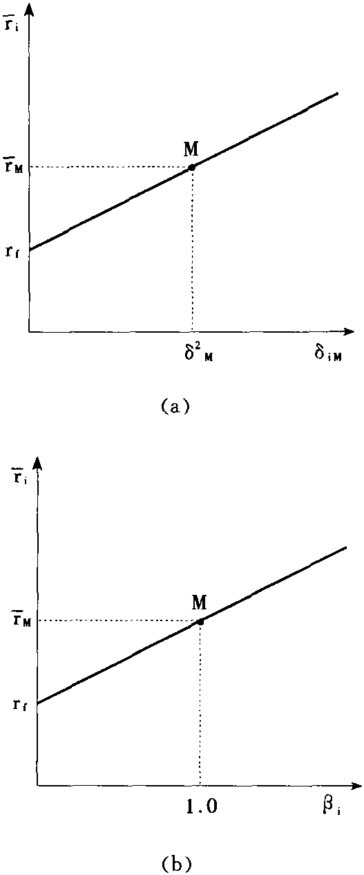 释义 | 证券市场线Securities Market Line (SML)资本资产定价模型的图示形式。揭示了风险资产的预期报酬率与其所承担的系统风险β系数之间呈线性关系,充分体现了高风险高收益的原则。方程式是:Ki=Rf+β(Km-Rf)。其中,Ki为个股要求收益率,Rf为无风险收益率,(Km-Rf)为平均股票要求的收益率。从证券市场线可以看出,投资者要求的收益率不仅取决于市场风险,而且还取决于无风险利率(证券市场线的截距)和市场风险补偿程度(证券市场线的斜率β)。一般来说,投资者对风险的厌恶感越强,证券市场线的斜率越大,对风险资产所要求的风险补偿越大,对风险资产的要求收益率越高。 证券市场线 证券市场线说明证券的预期收益与风险之间的关系,并用以度量证券风险的一种理论构架。它是“资本资产价格模型”理论的一个组成部分。根据该理论创造者夏普的分析,一种证券的预期收益与市场组合的收益之间的关系,可用“特性线”来概括,用公式表示如下: E(γi)-γf=αi+βim[E(γm)-γf]+ei 式中:E(γi)-γf=证券i的超额收益, γf=无风险证券收益, βim=特性线的坡度,表示证券价格对市场价格变动的敏感程度。 E(γm)-γf=市场组合的超额收益; αi=在市场组合超额收益为0时,证券i的预期收益; ei=随机误差,一般为0,可以略而不计。 上式等号右面βim[E(γm)-γf]代表证券i的预期收益中与市场无关的部分;[αi+ei]代表证券i的预期收益中与市场无关的部分。因此,上式可改为下式来表示: E(γi)-γf=βim[E (γm)-γf]+ [αi+ei]; 这个公式亦适用于证券组合。上式中ei一般为0,αi可以是正值或负值,也可以是0,如果αi或αp(组合)为正值,表示这种证券或这个组合的预期收益大于市场预期收益(平均);如为负值,则不及市场收益。如果市场是均衡的,则αi和αp都是零。说明正负互相抵消。证券分散化之所以能减少风险,就是证券数量增加可把不受市场影响的风险(α)减为零。但分散化对于与市场有关的风险(β),则不发生作用。 按照资本资产价格模型,度量证券的适当指标,是它与市场组合的协方差(Covim)。协方差较大的证券,将相对地具有较高预期收益;协方差较小的证券,则情况相反。前者引起投资者乐于购买,后者令人出卖。经过市场上供需调节,价格变动,使证券在市场上处于均衡状态,即每种证券在当时的市价下,其所需要的数量等于其所供给的数量。因此,所谓证券市场线,就是在均衡状态下所有证券的协方差(风险)与预期收益的关系,如下式: 这可由图6—29说明如下: 图6—29 图中γf是无风险证券收益,所以位于β的零点。从这点开始通过M点的直线,是一条等比的线,其坡度由β的大小来决定。根据“资本市场线”理论,市场组合的βm总是等于1.0,其他各证券(或组合)各有其个别的β值。如果它比市场的大,即大于1.0,表示其风险较大;如果它比市场小,即小于1.0,表示其风险较小。所谓风险大小的意义,是指市场上所有证券(例如股票)的预期收益提高或减低1%,则某种证券(或组合)的预期收益提高的程度超过1%,或降低的程度不到1%,就是说,风险大小亦即各种证券预期收益对市场预期收益的变动的敏感性的大小。举例说明。假定无风险证券的收益率(γf)为5%,市场组合的预期收益E(γm)为12%,则E(γi)=5%+1.0(12%-5%)=12%,意思是说,在市场均衡的情况下,某种证券的预期收益与市场的一样为12%,其中减去无风险收益5%,超额收益为7%。这7%作为有风险证券的市场风险的补偿,表示每单位风险等于补偿7%的收益。再假设证券甲的β为1.2,证券乙的β为0.8,则甲的预期收益应为5%+1.2(12%-5%)=13.4%;乙的预期收益为5%+0.8(12%-5%)=10.6%.甲的预期收益比乙的高,这是因为,证券甲对市场预期收益变动的敏感性高,从β上可以看出,在市场收益提高1%时甲的收益要升高到1.2%。同理,乙的β比较低,当市场收益升高1%,它只升高0.8%,不及1%。因而,以市场的β(1.0)为标准,凡是β超过1.0的证券是一种高收益的证券,因为其收益可以超过市场的平均水平。可是,这种证券的风险也较大,因为当市场预期收益不是升高而是降低时,则它要降低的程度比较大。以甲来说,市场收益减低10%,它的收益要降低12%,而乙的收益只降低8%。因其风险比甲的小,因而它的收益要比甲的降低得少一点。可是,它们收益的高低,与其风险相对比,仍是等比的。以甲而论,其比例是(13.4%-5%)/1.2=7%,以乙而论,其比例是(10.6%-5%)/0.8=7%。因此,它们同位于一条证券市场线上。如果证券甲的预期收益不是13.4%,而是15%,这表示甲的价值是被低估了(或估低价格),使它变成为一种吸引力较大的证券,投资者踊跃购买,形成求过于供,提高价格,从而使供给增加。经过供求力量频繁较量,促使供需相等,价格仍为回落到其原来的水平。如果证券乙的预期收益不是10.9%而是9.4%,表示它被高估了,当然谁都想出卖。但由于供给一多,导致价格下落,,价格下落又引起买者增加购买,致使供需关系又经几番调正,达到供需相等,价格仍升到原来水平。这样,所有证券的市场价值等于其在市场上交易的数量,市场就处于均衡状态。 (参见条目“资本资产价格模型”、“资本市场线”) ☚ 资本市场线 第七篇 证券财务会计审计 ☛ 证券市场线 证券市场线security market line,SML如图1,以证券组合的预期收益率 图1 推导证券市场线 首先在(1)中,求rp对Xi的导数:![]() ![]() ![]()