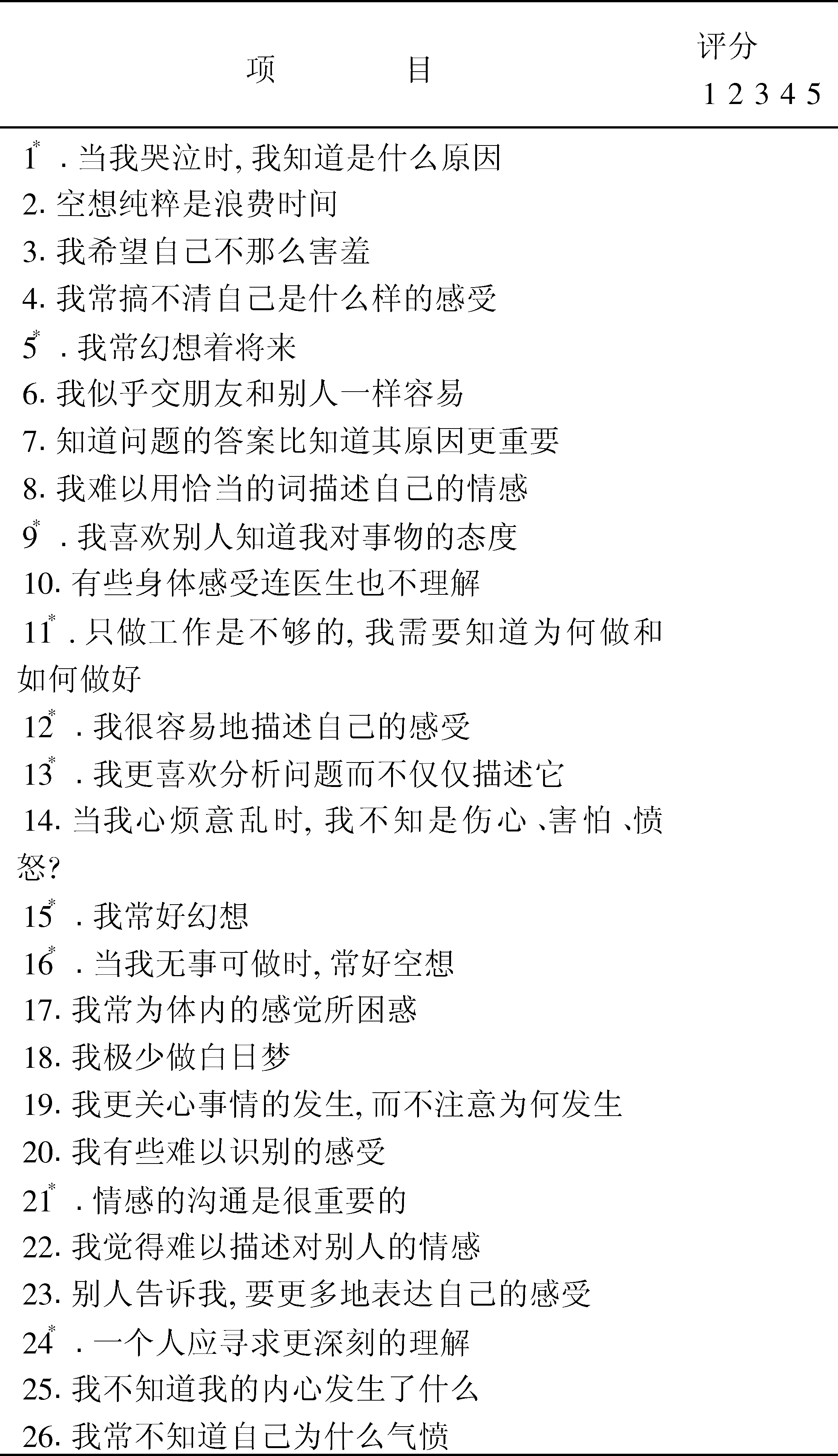 姓名 性别 年龄 编号 日期 指导语:下面一些问题是关于您最近1个月的睡眠状况,请选择或填写最符合您近1个月实际情况的答案。请回答下列问题!- 1.近1个月,晚上上床睡觉通常是 点钟。 2.近1个月,从上床到入睡通常需要 分钟。 3.近1个月,通常早上 点起床。 4.近1个月,每夜通常实际睡眠 小时(不等于卧床时间)。 对下列问题请选择1个最适合您的答案。 5.近1个月,因下列情况影响睡眠而烦恼: a.入睡困难 (30分钟内不能入睡) (1)无 (2)<1次/周 (3)1~2次/周 (4)≥3次/周; b.夜间易醒或早醒 (1)无 (2)<1次/周 (3)1~2次/周 (4)≥3次/周; c.夜间去厕所 (1)无 (2)<1次/周 (3)1~2次/周 (4)≥3次/周; d.呼吸不畅 (1)无 (2)<1次/周 (3)1~2次/周 (4)≥3次/周; e.咳嗽或鼾声高 (1)无 (2)<1次/周 (3)1~2次/周 (4)≥3次/周; f.感觉冷 (1)无 (2)<1次/周 (3)1~2次/周 (4)≥3次/周; g.感觉热 (1)无 (2)<1次/周 (3)1~2次/周 (4)≥3次/周; h.做恶梦 (1)无 (2)<1次/周 (3)1~2次/周 (4)≥3次/周; i.疼痛不适 (1)无 (2)<1次/周 (3)1~2次/周 (4)≥3次/周; j.其他影响睡眠的事情 (1)无 (2)<1次/周 (3)1~2次/周 (4)≥3次/周; 如有:请说明: 6.近1个月,总的来说,您认为自己的睡眠质量 (1)很好 (2)较好 (3)较差 (4)很差; 7.近1个月,您用药物催眠的情况 (1)无 (2)<1次/周 (3)1~2次/周 (4)≥3次/周; 8.近1个月,您常感到困倦吗 (1)无 (2)<1次/周 (3)1~2次/周 (4)≥3次/周; 9.近1个月,您做事情的精力不足吗 (1)没有 (2)偶尔有 (3)有时有 (4)经常有。三、多伦多述情障碍量表 多伦多述情障碍量表(toronto alexithymia scale,TAS) 述情障碍,又称“情感难言症”或“情感表达不能”,首先由Sifneos阐述并命名,以不能适当地表达情绪、缺少幻想实用性思维为其特征。它并非一种独立的精神疾病,而可理解为一种人格特征,也可为某些躯体或精神疾病时较易发生的心理特点,或为其继发症状,并与某些疾病的预后和治疗有关,因此对其评估有一定的临床实用意义。对述情障碍的评估比较困难,国外已有若干种量表使用于此,但信度多不够理想,品质较差。如:①Sifneos(1972)制订Beth Israel医院心身问卷,开始时认为其内部信度尚好[Apfel等(1979)和Kleiger等(1980)]但以后经Lesser等(1983)和Taylor等(1981)进一步验证,认为其信度颇差,Lolas(1980)也认为易受其他因素影响。②Schalling Sifneos人格量表(1979),其品质也较差。③Garner等(1983)报告Interoceptive Awareness Subscale,认为其信度和效度均较好,但仅能使用于神经性厌食贪食症。④MMPI述情障碍量表,由Kleiger提出(1980),其信效度也不够好。因此对述情障碍的评定量表常在研究制订和改进。Taylor等(1984)制订多伦多述情障碍量表(以下简称TAS),经测试,具有较高的信度和效度,可以较全面而正确地评估述情障碍的存在和严重程度,并可用于临床,达到帮助治疗某些疾病的目的,因此应用较广,由张建平首先引进国内。 【适用范围】 TAS的适应范围为可能发生各种述情障碍的各种疾病者,主要有以下几种: 一、心身疾病述情障碍与心身疾病有着特殊的病因学联系,开始时甚至认为仅在心身疾病时才会有述情障碍。有报告认为主要有冠心病、类风湿性关节炎、偏头痛、与心理因素有关的消化道疾病、皮肤病、背痛、牛皮癣和哮喘等。 二、其他躯体疾病如肺结核等。 三、精神障碍对神经症、物质依赖、躯体化障碍、精神性疼痛、精神创伤后应激障碍、隐匿性抑郁、性变态、神经性呕吐和人格障碍等。 【项目和评定标准】 TAS使用较简便易行。它是一种自评量表,受评者应能正确理解量表中各项目的含义,因此需有初中以上文化程度,对评估能合作,在受评者不受环境因素干扰下一次完成。评估前先向受评者说明目的和答题方法,对病人则有助于疾病的诊治,负责为其保守评估秘密,要求其实事求是地答复每一个问题。各题回答按程度分为1~5级:1代表完全不同意;2代表基本不同意;3代表不同意也不反对;4代表基本同意;5代表完全同意。共26题,其中有11题为反向计分。分为4个因子:因子Ⅰ表示描述情感的能力;因子Ⅱ表示认识和区别情绪和躯体感受的能力;因子Ⅲ表示缺乏幻想;因子Ⅳ表示外向型思维缺乏透露内在的态度、感受、愿望和欲念的能力,执着于外界事物的细枝末节。对评估结果的解释,以含计分数与常模比较,经统计分析,较常模显著为高者表示有述情障碍,得分越高表示述情障碍越严重,对各因子分亦然,男女的常模分不同,应分别对照。 【应用与评价】 TAS的评估可帮助了解受评者有无述情障碍的情况,对疾病患者可采取不同的治疗措施,使之更为有效。述情障碍者对传统的心理治疗会产生阻抗。可能为精神动力性心理治疗和领悟治疗不能成功的重要原因,有报告认为因此在疗程中途脱落者较多。由于这些病人常把精神痛苦表达为躯体不适,导致病人在精神科以外反复就诊和检查,难有结果,甚至引起医源性疾病。有些病人不能正确表达躯体症状,也可导致躯体疾病的误诊,因此在诊断躯体疾病,尤其是心身疾病时,应考虑是否存在述情障碍。述情障碍者缺乏幻想和想像力,很少作梦,对梦的回忆很差,少象征性意义,思维又过于具体而僵化,因此不宜使用分析性心理治疗,而对行为治疗、松弛治疗、自我训练和暗示治疗等则可能见效。必要时也可使用抗抑郁剂和抗焦虑剂,也可让患者自己了解述情障碍的性质,懂得自己的情绪体验,能区别躯体症状和情绪反应,可能也有助于治疗。多伦多述情障碍量表(TAS)  