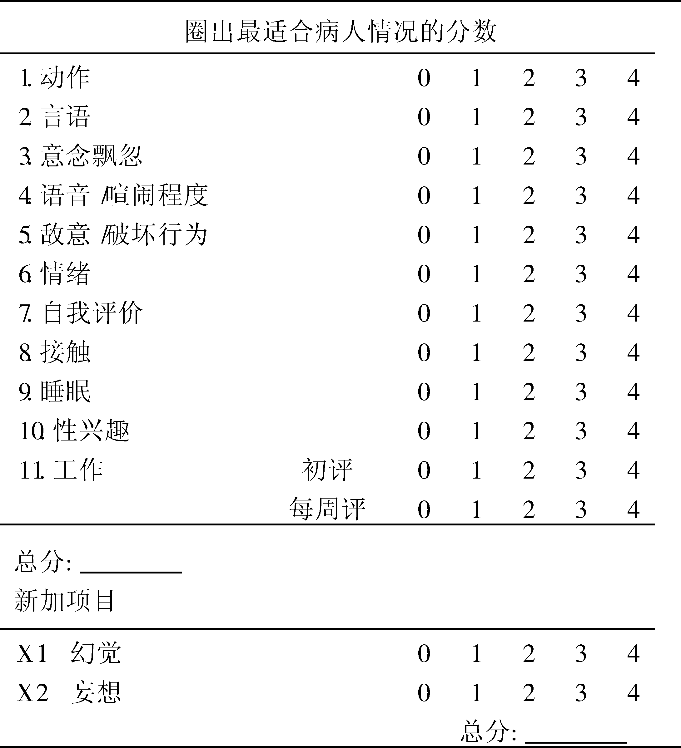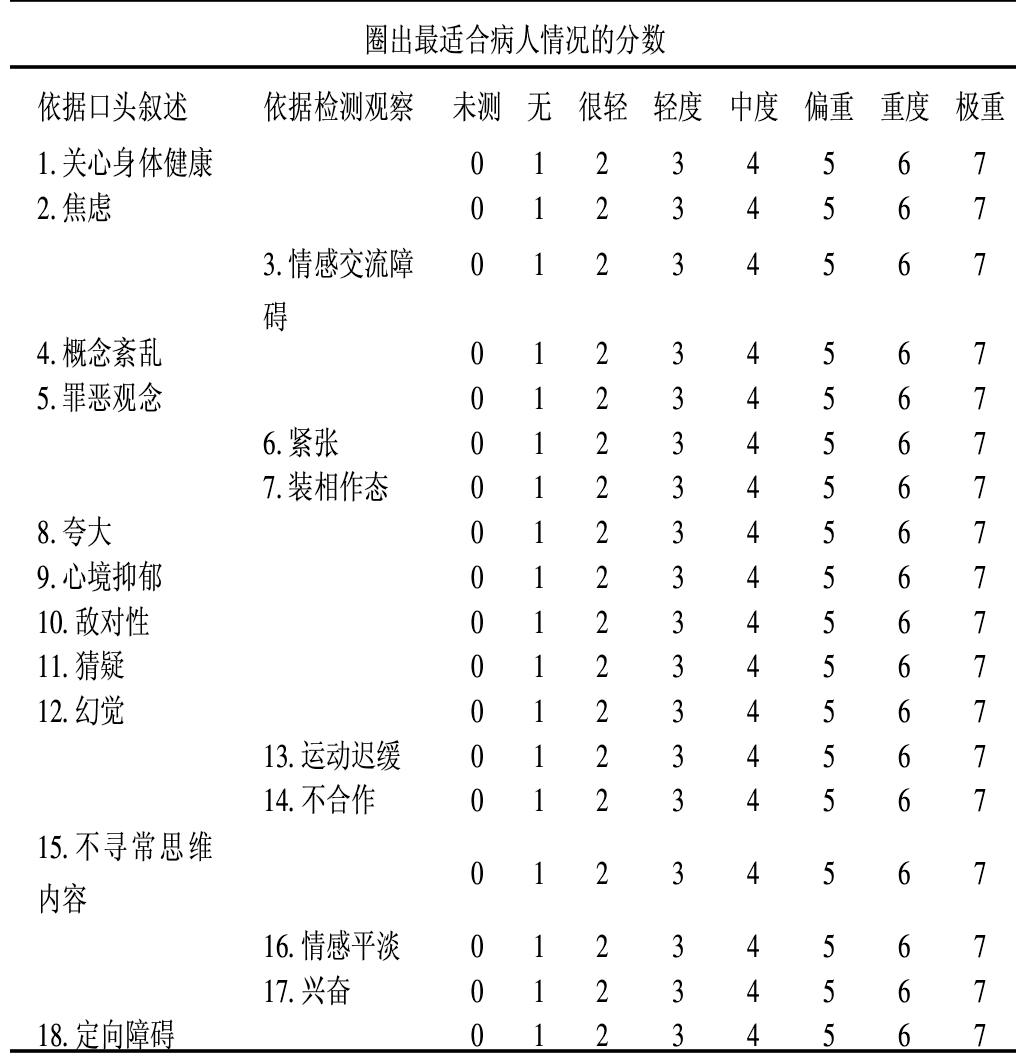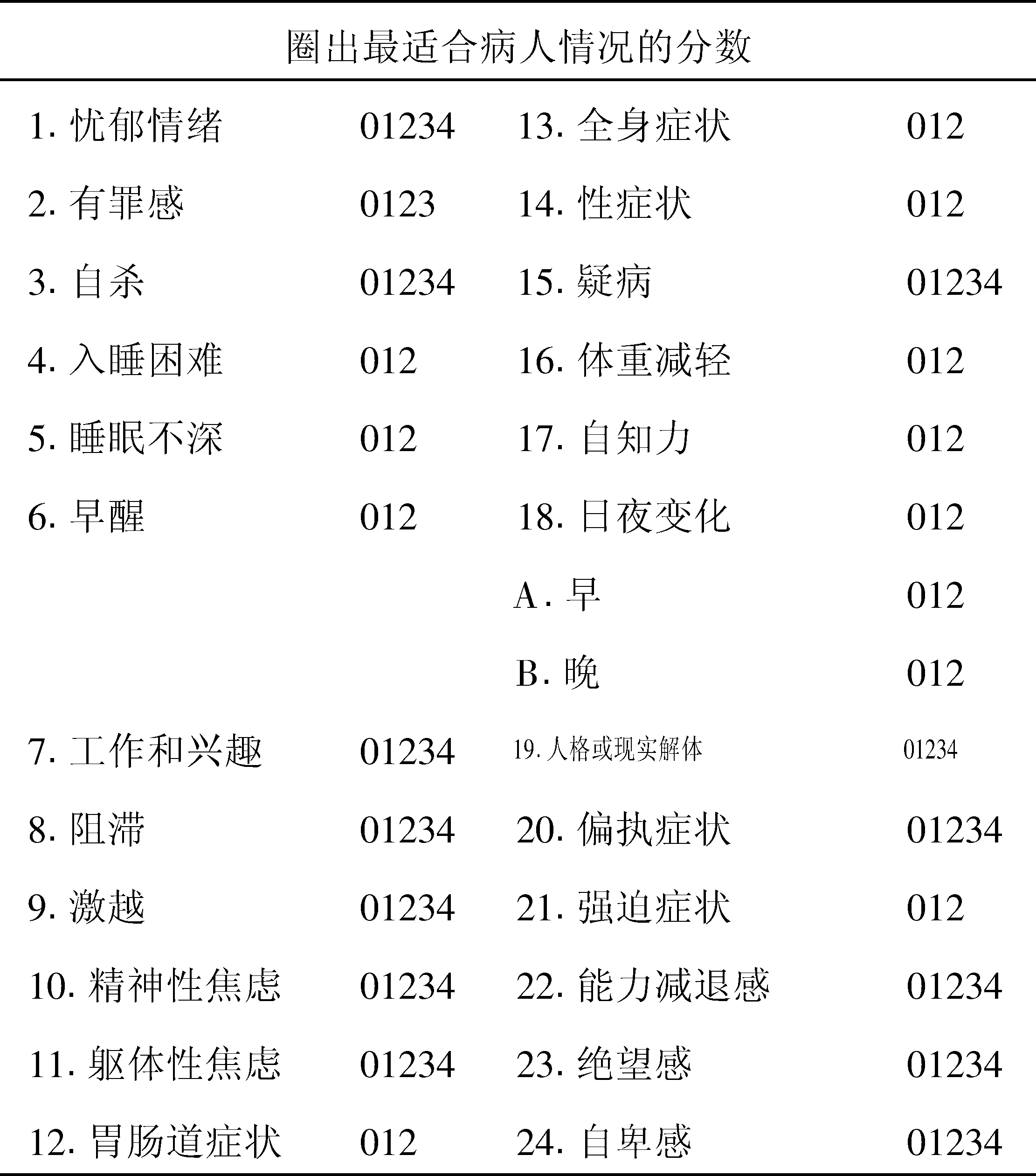 总分:因子1 因子4 因子2 因子5 因子3五、Bech-Rafaelsen 躁狂量表(BRMS) 倍克-拉范森躁狂量表(Bech-Rafaelsen Mania Rating Scale BRMS) 由Bech和Rafaelsen于1978年编制。本量表共11项。 【项目和评定标准】 BRMS中,各项目采用0~4分的5级评分法。各级的标准为:(0)无该项症状或与患者正常时的水平相仿;(1)症状轻微;(2)中度症状,(3)症状明显;(4)症状严重。 对每一项症状,都规定有具体的工作用评分标准。 1.动作:(1)动作稍多,表情活跃;(2)动作多,姿势活跃;(3)动作极多,会谈时曾起立活动;(4)动个不停,虽予劝说仍坐不安宁。 2.言语:(1)话较多;(2)话多,几无自动停顿;(3)很难打断;(4)无法打断。 3.意念飘忽,(1)描述、修饰或解释的词句过多:(2)内容稍散漫或离题,有意联,音联或双关语:(3)思维散漫无序;(4)思维不连贯,内容无法理解。 4.言语/喧闹程度:(1)说话声音高;(2)大声说话,隔开一段距离仍能听到;(3)语音极高,夹带歌声或噪音;(4)呼喊或尖叫。 5.敌意/破坏行为:(1)稍急躁或易激惹,能控制;(2)明显急躁,易激惹或易怒;(3)有威胁性行为,但能被安抚;(4)狂暴,冲动和破坏行为。 6.情绪:(1)略高涨,乐观;(2)高涨,爱开玩笑,易笑;(3)明显高涨,洋洋自得,(4)极高涨,和环境不协调。 7.自我评价:(1)略高;(2)高,常自诩自夸;(3)有不合实际的夸大观念;(4)有难以纠正的夸大妄想。 8.接触:(1)稍有爱管闲事或指手划脚倾向;(2)爱管闲事,好争辩;(3)爱发号施令,指挥他人;(4)专横,与环境不协调。 9.睡眠:(1)睡眠时间减少25%;(2)睡眠时间减少50%;(3)睡眠时间减少75%;(4)整夜不眠。 10.性兴趣:(1)兴趣稍增强,有些轻浮言行;(2)性兴趣增强,有明显轻浮言行;(3)性兴趣显著增强,有严重调戏异性,或卖弄风情言行;(4)整日专注于性活动。 11.工作: 初次评分时(1)工作质量略有下降;(2)工作质量明显下降,工作时间争吵;(3)无法继续工作,或在医院内尚能参加活动数小时;(4)日常活动不能自理,或不能参加病房活动。 再次评定(0)恢复正常工作,或可恢复正常工作;(1)工作质量差,或减轻工作;(2)工作质量明显低下,或在监护下工作;(3)住院或病休,每天活动数小时;(4)不能自理生活,或不能参加任何活动。 量表协作组曾作修改,增加以下两项:X1,幻觉:(1)偶有或可疑;(2)肯定存在,每天≥3次;(3)经常出现;(4)行为受幻觉支配。 X2,妄想:(1)偶有或可疑(不包括夸大妄想,下同);(2)妄想肯定,可用情绪解释;(3)妄想肯定,难以用情绪解释;(4)出现幻觉的妄想。 【评定注意事项】 1.评定员应由经量表训练的医师担任。 2.一次评定,需约20分钟左右。 3.评定的时间范围:第一次,评定前一周的情况,再次,一般为2~6周。 4.适用于躁郁症的躁狂相或分裂情感性精神病的躁狂状态成 年患者。 5.一般采用会谈与观察的方式,有的还需向家属或病房工作人员询问完成评定。 其中第5项敌意/破坏,第8项(社会)接触,第10项性兴趣和第11项工作,最好能同时向家属和病房工作人员询问方能正确评定。还有第9项睡眠,以过去三天内的平均睡眠时间估计。 6.对精神分裂症的青春型兴奋不敏感,尽管兴奋明显而评分却很低。 【统计指标和结果分析】 1.主要统计指标为总分;0~5分为无明显躁狂症状,6~10分为有肯定躁狂症状,22分以上为严重躁狂症状。 2.总分反映疾病严重性,总分越高,病情越重,治病前后总分值的变化反映疗效的好坏,差值越大疗效越好。 【量表评价】 1.国内量表协作组,统计13个协作单位的评定员间评定一致性:γ=0.97~0.99,提示信度甚佳;BRMS的总分和躁狂状态临床判断的GAS间也呈良好相关,γ=0.92,效度良好。且发现它确能反映治疗前后的躁狂病情变化。 2.实用性:BRMS有明确的评定标准;而且项目名称又与日常临床工作用术语相近,较易掌握和接受,是评定躁狂状态的较好量表。量表8 Bech-Rafaelsen 躁狂量表(BRMS)  注:0=无症状, 1=轻微, 2=中等, 3=较重, 4=严重。六、汉密顿抑郁量表(HAMD) 汉密顿抑郁量表(Hamilton Depression Scale,HAMD) 由Hamilton于1960年编制,是临床上评定抑郁状态时应用得最为普遍的量表。本量表有17项,21项和24项等3种版本,现介绍的是24项版本。 【项目和评分标准】 HAMD大部分项目采用0~4分的5级评分法。各级的标准为:(0)无;(1)轻度;(2)中度;(3)重度;(4)极重度。少数项目采用0~2分的3级评分法,其分级的标准为:(0)无;(1)轻~中度;(2)重度。 1.抑郁情绪:(1)只在问到时才诉述;(2)在访谈中自发地表达;(3)不用言语也可以从表情,姿势,声音或欲哭中流露出这种情绪;(4)病人的自发言语和非语言表达(表情,动作)几乎完全表现为这种情绪。 2.有罪感:(1)责备自己,感到自己已连累他人;(2)认为自己犯了罪,或反复思考以往的过失和错误;(3)认为目前的疾病,是对自己错误的惩罚,或有罪恶妄想;(4)罪恶妄想伴有指责或威胁性幻觉。 3.自杀:(1)觉得活着没有意义;(2)希望自己已经死去,或常想到与死有关的事;(3)消极观念(自杀念头)。 4.入睡困难(初段失眠):(1)主诉有入睡困难,上床半小时后仍不能入睡。(要注意平时病人入睡的时间);(2)主诉每晚均有入睡困难。 5.睡眠不深(中段失眠):(1)睡眠浅,多恶梦;(2)半夜(晚12点钟以前)曾醒来(不包括上厕所)。 6.早醒(末段失眠):(1)有早醒,比平时早醒1小时,但能重新入睡(应排除平时的习惯);(2)早醒后无法重新入睡。 7.工作和兴趣:(1)提问时才诉述;(2)自发地直接或间接表达对活动、工作或学习失去兴趣,如感到没精打彩,犹豫不决,不能坚持或需强迫自己去工作或活动;(3)活动时间减少或成效下降,