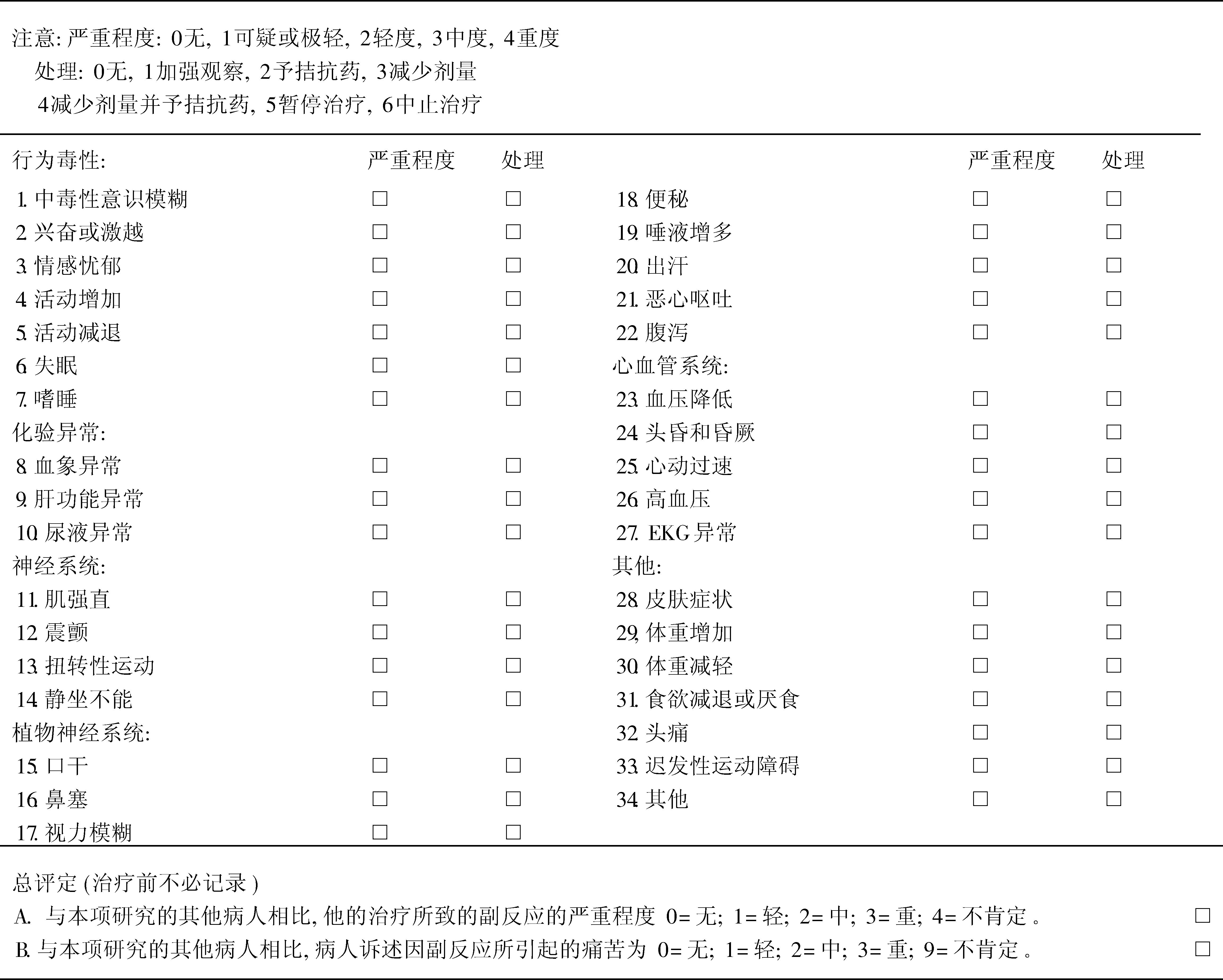 治疗时出现的症状量表(treatment emergent symptom scale,TESS) 国内一般简称为:“副反应量表”。由美国NIMH编制于1973年。在同类量表中,项目最全,覆盖面最广,既包括常见的不良症状和体征,又包括若干实验室检查结果。 【项目、定义和评定标准】 TESS原版本要求对每项症状作三方面的评定:严重度,症状和药物的关系以及采取的措施。其中“症状和药物关系”栏分为:无关;基本无关;可能有关;很可能有关和肯定有关等5个等级(量表协作组经应用后,删除了这一栏,规定只有可能或肯定和治疗有关的症状才予以评定)。“采取措施”栏,评定针对副反应所作处理,分成0~6分7个等级:(0)不需任何处理;(1)加强观察;(2)予拮抗药;(3)改变剂量;(4)改变剂量并予拮抗药;(5)暂停治疗;(6)终止治疗。 “严重度”栏,评定症状的严重水平(0~4):(0)无该项症状;(1)极轻或可疑;(2)轻度,指不影响功能活动,病人因之稍有烦恼,只有模棱两可的证据证明症状存在,或完全基于病人的报告;(3)中度,一定程度的功能影响,但对生活无严重影响,病人因而感到不舒服或不安,可直接观察到症状的存在;(4)重度,严重影响病人的活动和生活,就具体症状而言,有些症状只要肯定存在,其严重度至少达到中度。原版本提出了一份用于成人的严重度评定指南,简介于下(有些项目的评定标准,原版中缺如,由量表协作组补定,以*号标出)。 1.中毒性意识模糊:(3)仅见于晚上,短暂;(4)持续至白天。 2.兴奋激越:(2)有焦虑或恐惧;(3)有非持续性的激越性运动行为;(4)持续激越,如捶首,顿足和搓手等。 3.情绪抑郁;(2)问出来的心境抑郁;(3)主动诉述抑郁绝望,易哭;(4)伴阻滞的符合诊断标准的重症抑郁发作。 4.活动增加:(2)非持续性,能自行控制;(3)持续性,不需外力控制;(4)持续,需他人干涉。 5.活动减退:(2)主动活动减少;(3)需外力推动才活动;(4)木僵或亚木僵。 6.失眠:(2)比平时睡眠减少2小时;(3)减少3~6小时;(4)减少6小时以上。 7.嗜睡:(2)白天嗜睡或睡觉2小时;(3)白天睡眠3~8小时;(4)白天睡8小时以上。 8.*血象异常:(3)血象化验异常,如白细胞减少;(4)严重异常;如白细胞缺乏。 9.肝功能:(3)化验异常;(4)黄疸。 10.*尿化验异常:(3)化验结果为肯定异常;(4)严重异常。 11.肌强直:(2)肌张力轻度增高,不影响活动;(3)肌张力明显增高(未用拮抗药);(4)肌张力极高,即使使用拮抗药亦不能逆转。 12.震颤:(2)自觉有震颤感,或闭目平伸双手有轻度震颤;(3)明显可见的震颤,影响精细活动;(4)震颤严重,影响生活,如无法进食。 13.扭转运动:(2)有,但不影响活动;(3)影响活动但不影响生活;(4)影响生活。 14.静坐不能:(2)自觉心烦,缺乏耐心,能自控;(3)因缺乏耐心,会谈时或工作中起立行走;(4)无法静坐,无法完成任务,不能自控。 15.口干:(2)主诉口腔黏膜干燥;(3)或(4)可明显查出的口腔黏膜干燥。 16.鼻塞:(2)自感鼻塞;(3)或(4)可见或可证实的鼻塞(如说话的声音)。 17.视力模糊:(2)只是主诉;(3)影响视力的清晰度;(4)累及日常活动,如绊倒东西等。 18.便秘:(2)便秘36小时以上;(3)4天以上的便秘;(4)需手通大便。 19.唾液增加;(3)唾液增多;(4)淌口水。 20.出汗;(2)或(3)汗比平时多,或阵阵出汗;(4)面部大汗淋漓。 21.恶心呕吐:(3)恶心;(4)呕吐。 22.腹泻:(2)一天2次,(3)一天3~5次;(4)一天5次以上。 23.血压降低:(3)比平时低10%以上;(3)降低20%以上;(4)低至难以测出。 24.头昏和头晕;(2)有头昏头晕感,(3)伴失平衡感的头昏和头晕;(4)晕厥,失去知觉。 25.心动过速:(2)心率90~100次/分;(3)100~120次/分;120次/分以上。(清晨起床前的测量结果。) 26.血压升高:(2)140/90mmHg以上;(3)160/100mmHg以上;(4)200/120mmHg以上(指治疗前无高血压者)。 27.*心电图(ECG)异常:(2)有异常,但无临床意义;(3)具临床意义的异常;(4)伴严重后果的异常。 28.皮肤症状:(2)日光过敏;(3)暂时性的发痒或红斑;(4)过敏性皮炎。 29.体重增加:(2)一月内增加5磅;(3)增加6至10磅;(4)增加10磅以上。 30.体重减轻:(2)一月内减轻5磅;(3)减轻6至10磅;(4)减轻10磅以上。 31.食欲减退和厌食:(2)每天食量仅相当于两餐的数量;(3)相当于一餐的数量;(4)不进食。 32.*头痛:(2)仅为主诉;(3)有痛苦感;(4)因而丧失功能或无法活动。 33.*迟发性运动障碍(TD):(2)由检查引出的TD症状;(3)自发的TD症状;(4)明显影响功能或活动。 第34~36项,供填入未能包括在以上项目中的症状,其严重度按前述基本原则评定。 最后两项为总评。A为严重度总评。B为痛苦程度总评。均为和同一研究的其他病人比较的结果(0~3):(0)无;(1)轻;(2)中;(3)重。 【评定注意事项】 1.评定员应为经量表训练的精神科医师。 2.评定员应根据病人报告,体格检查结果以及实验室报告作出评定,有些项目,还应向病人家属或病房工作人员询问。 3.有些项目无具体评定标准,可按前述严重度的评定原则评定。 4.评定时间:治疗前及治疗后2周、4周和6周各评定一次。 5.用于评定各种精神药物引起副作用的成年病人。 6.有些症状较轻,难以判断是否系治疗所致,为谨慎计,宜将可能与治疗有关者也加以评定,并在表格中注明,分析时再定取舍。 7.在评定中发现B栏与药物的关系,颇难评定,且带主观性。例如,在研究某一新药,要判断某一项症状与该药物的关系,感到十分困难,因而,在实际应用中,仅取A栏与C栏。 【统计指标和结果分析】 1.TESS结果,可得到A栏和C栏的单项分和总分,以及总评的单项分。最常见的统计指标为A栏(严重度)的单项分和总分。这些症状可以按系统分为