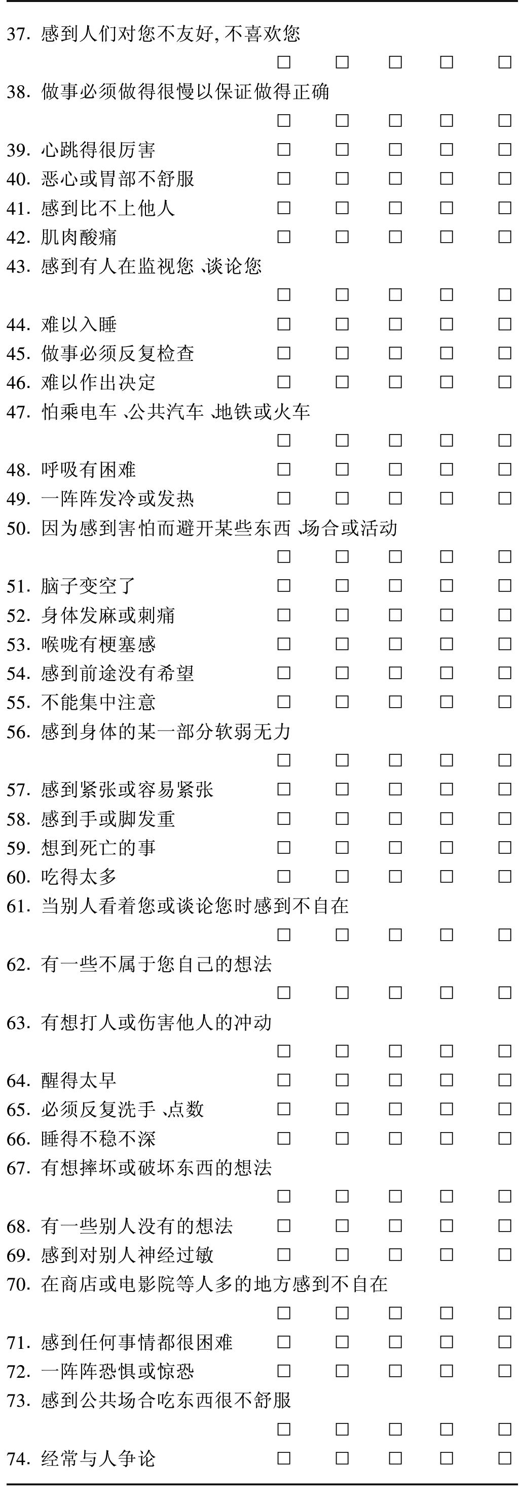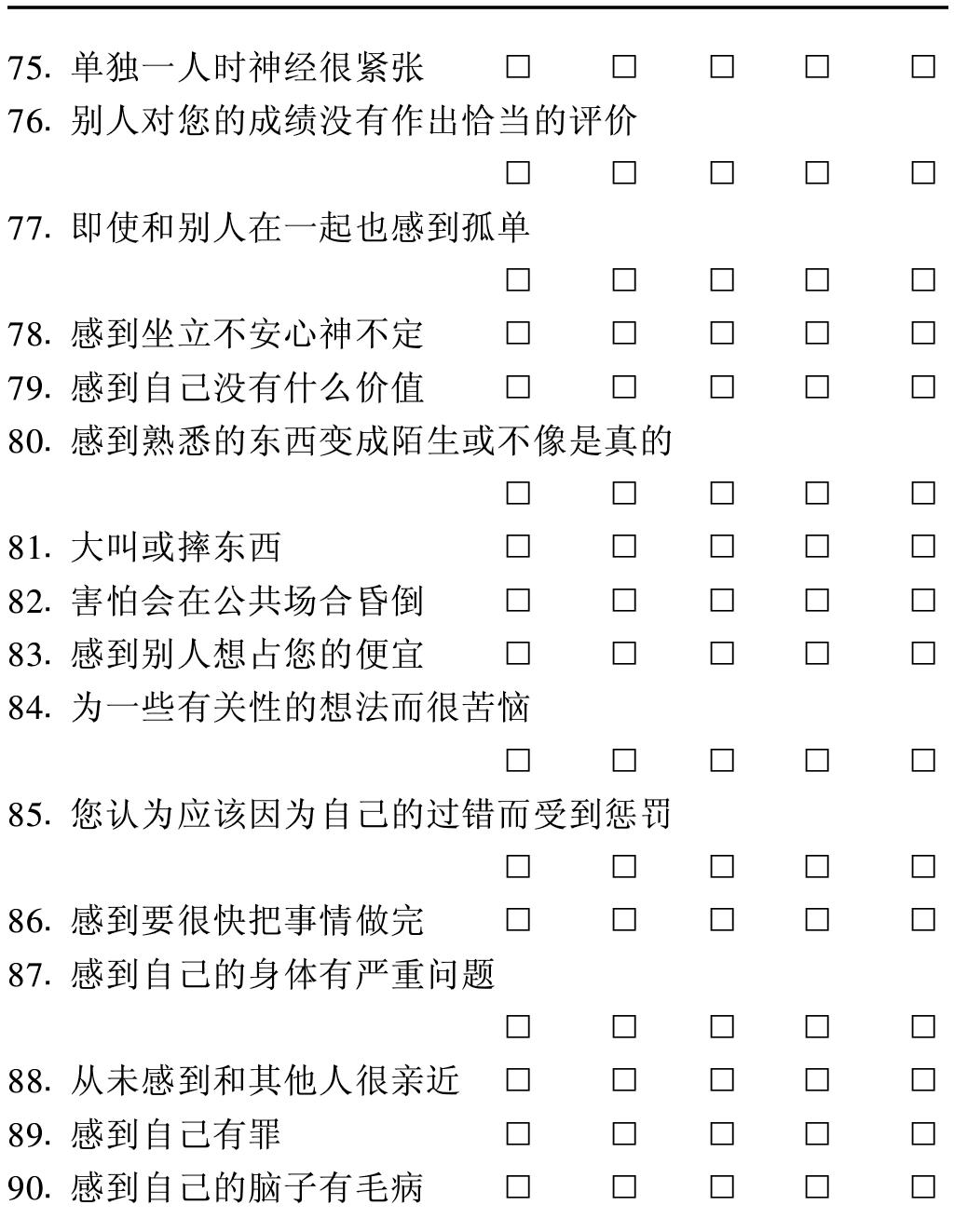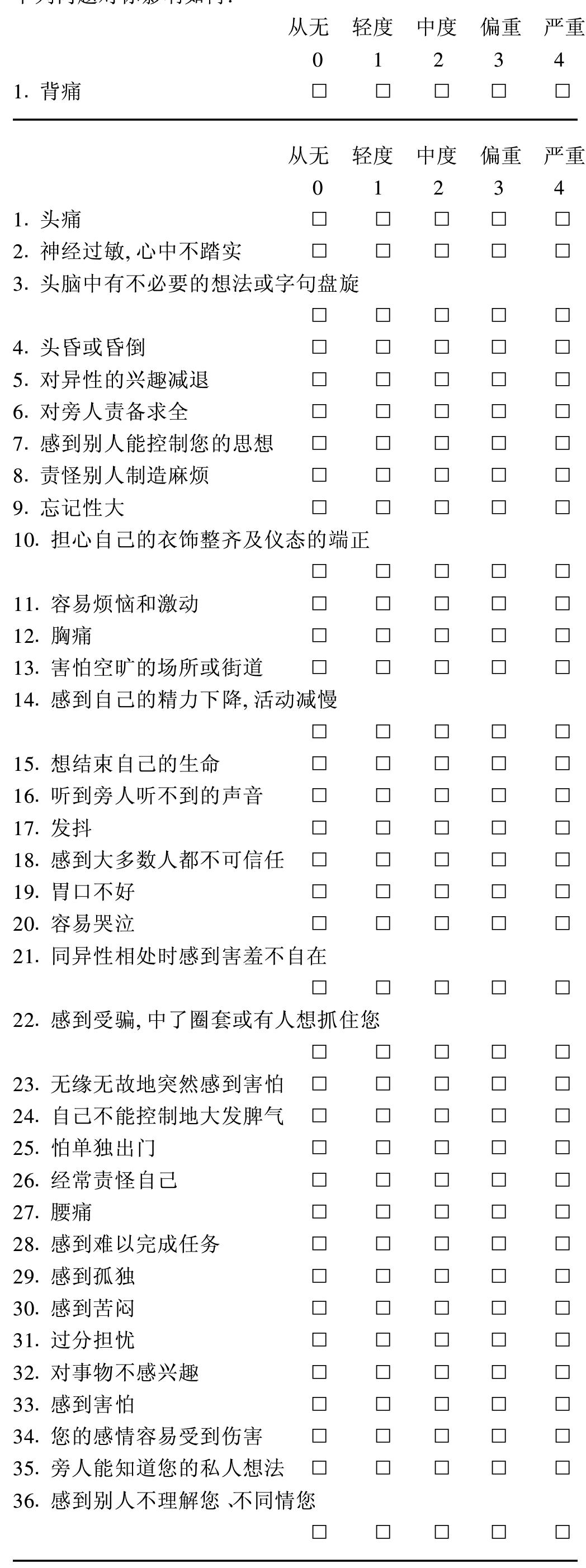 一、症状自评量表 症状自评量表(symptom checklist 90,SCL-90) 此表由Derogatis,L.R.编制(1975),表的制订可追朔到在Cornell Medical Index(CMI)基础上,由Parloff,M.B.制订的评定心理治疗并经Frank,J.D.修改的不适量表(Discomfort Scale)。后来Derogatis以他编制的Hopkin症状清单(HSCL,1973)为基础制订SCL-90。此表包括90个项目。曾有58个版本,此处介绍90个项目的SCL-90,此表包含比较广泛的精神病症状学内容,如思维、情感、行为、人际关系、生活习惯等。 【评定时间】 可以评定一个特定的时间,通常是评定一周以来的时间。 【评定方法】 分为五级评分(从0~4级),0=从无,1=轻度,2=中度,3=相当重,4=严重。有的也用1~5级,在计算实得总分时,应将所得总分减去90。SCL-90除了自评外,也可以作为医生评定病人症状的一种方法。 【分析统计指标】 (一)总分 1.总分是90个项目所得分之和; 2.总症状指数(General Symptomatic Index),国内称总均分,是将总分除以90(=总分÷90); 3.阳性项目数是指评为1~4分的项目数,阳性症状痛苦水平(Positive symptom distress level)是指总分除以阳性项目数(=总分÷阳性项目数)。 (二)因子分 SCL-90包括9个因子,每一个因子反映病人某方面症状的痛苦情况,通过因子分可了解症状分布特点 因子分= 9个因子含义及所包含项目为: 1.躯体化(Somatization):包括1,4,12,27,40,42,48,49,52,53,56,58共12项,该因子主要反映身体不适感,包括心血管、胃肠道、呼吸和其他系统的主诉不适,和头痛、背痛、肌肉酸痛,以及焦虑的其他躯体表现。 2.强迫症状(Obsessive-Compulsive):包括了3,9,10,28,38,45,46,51,55,65共10项主要指那些明知没有必要,但又无法摆脱的无意义的思想、冲动和行为,还有一些比较一般的认知障碍的行为征象也在这一因子中反映。 3.人际关系敏感(interpersonal sensitivity):包括6,21,34,36,37,41,61,69,73共9项。主要指某些个人不自在与自卑感,特别是与其他人相比较时更加突出。在人际交往中的自卑感,心神不安,明显不自在,以及人际交流中的自我意识,消极的期待亦是这方面症状的典型原因。 4.抑郁(depression):包括5,14,15,20,22,26,29,30,31,32,54,71,79共13项。苦闷的情感与心境为代表性症状,还以生活兴趣的减退,动力缺乏,活力丧失等为特征。以反映失望,悲观以及与抑郁相联系的认知和躯体方面的感受。另外,还包括有关死亡的思想和自杀观念。 5.焦虑(anxiety):包括2,17,23,33,39,57,72,78,80,86共10项。一般指那些烦躁,坐立不安,神经过敏,紧张以及由此产生的躯体征象,如震颤等。测定游离不定的焦虑及惊恐发作是本因子的主要内容,还包括一项解体感受的项目。 6.敌对(hostility):包括11,24,63,67,74,81共6项。主要从三个方面来反映敌对的表现:思想,感情及行为。其项目包括厌烦的感觉,摔物,争论直到不可控制的脾气暴发等各方面。 7.恐怖(Photic anxiety):包括13,25,47,50,70,75,82共7项。恐惧的对象包括出门旅行,空旷场地,人群,或公共场所和交通工具。此外,还有反映社交恐怖的一些项目。 8.偏执(Paranoid ideation):包括8,18,43,68,76,83共6项。本因子是围绕偏执性思维的基本特征而制订:主要指投射性思维,敌对,猜疑,关系观念,妄想,被动体验和夸大等。 9.精神病性(psychoticism):包括7,16,35,62,77,84,85,87,88,90共10项。反映各式各样的急性症状和行为,有代表性地视为较隐讳,限定不严的精神病性过程的指征,此外,也可以反映精神病性行为的继发征兆和分裂性生活方式的指征。 此外还有19,44,59,60,64,66,89共7个项目未归入任何因子,分析时将这7项作为附加项目(additional items)或其他,作为第10个因子来处理,以便使各因子分之和等于总分。当得到因子分后,便可以用轮廓图(profiles)分析方法,了解各因子的分布趋势和评定结果的特征。 【应用评价】 此量表在国外已广泛应用,在国内也已应用于临床研究,特别是精神卫生领域,已广为应用。如对医学生考试应激的心身影响研究中,SCL-90总分由考试前24.05±20.62增加到42.80±31.27(P<0.01),各因子分均值亦皆有不同程度升高。除人际关系敏感及恐怖两个因子外,其余因子在考试前后均有显著差异(P<0.05~0.001)。考试前后SCL-90总分与生活事件总分,人格部分均呈显著正相关。与应对方式相关分析,发现消极的应对方式,如自闭自责,听天由命等,与考试后SCL-90增分呈显著正相关;而与积极的应对方式,如寻求社会支持,着重争取有利方面等则呈显著负相关(P<0.05~0.01)。若将SCL-90总分均值为界限,分为高症状组与低症状组,观察其PHA诱发的淋巴细胞转化反应,发现高症状组的淋巴细胞转化反应降低较显著(唐宏宇等,1992)。 用于痴呆病人照顾者的研究,发现SCL-90评分均高于对照组,其中总痛苦水平(GSI),阳性症状痛苦水平(PSDL)的均分以及抑郁、焦虑、敌对、偏执、精神病性等因子的痛苦水平与对照组相比,差异有显著性(P<0.05~0.01)。SCL-90与亲属应激量表(RSS)评分之间有显著正相关。症状自评量表(SCL-90) 指导语:以下表格中列出了有些人可能有的病痛或问题,请仔细阅读每一条,然后根据最近一星期以内(或过去 )下列问题影响你或使你感到苦恼的程度,在方格内选择最合适的一格,划一个钩,如“ ”。请不要漏掉问题。 举例 下列问题对你影响如何?