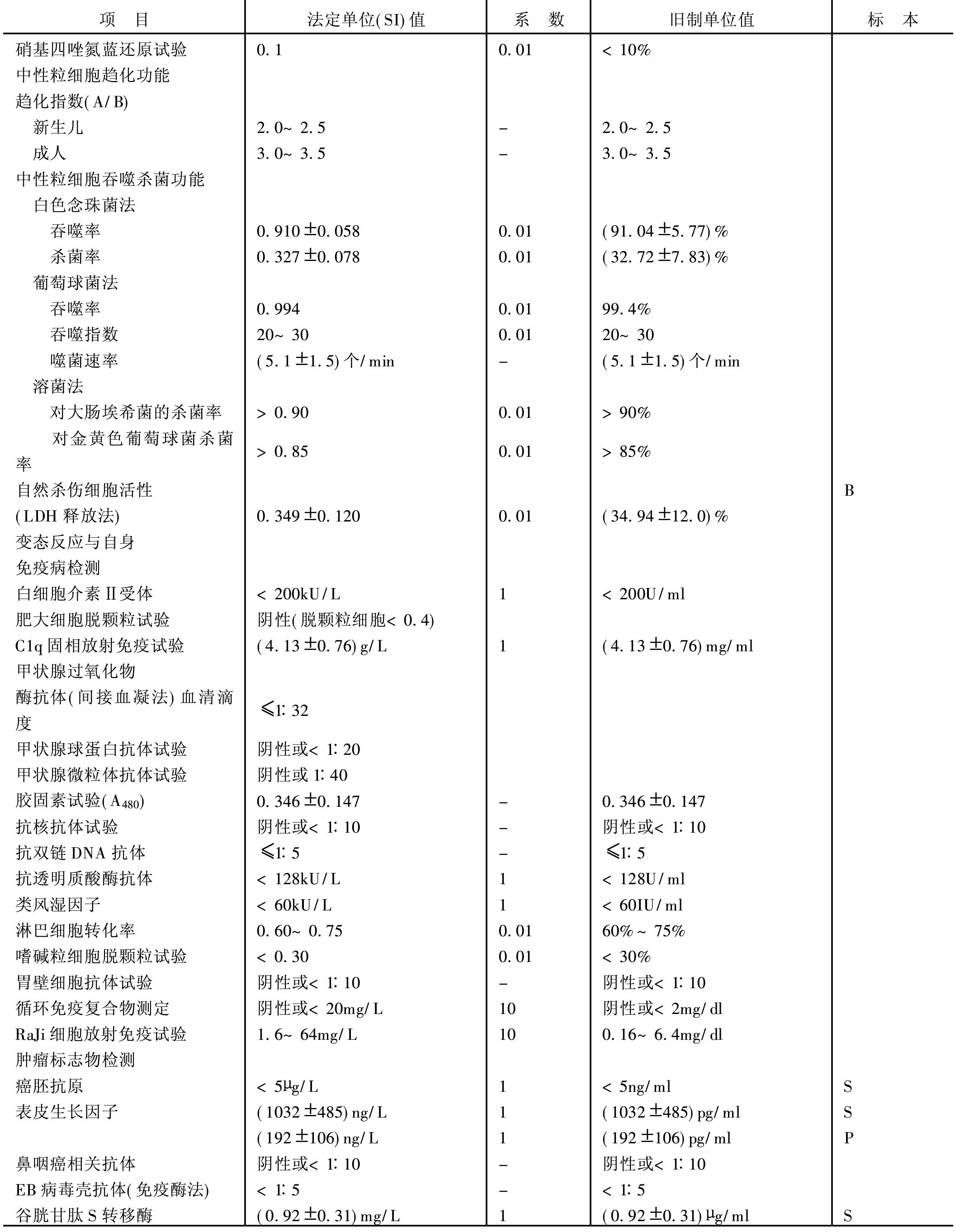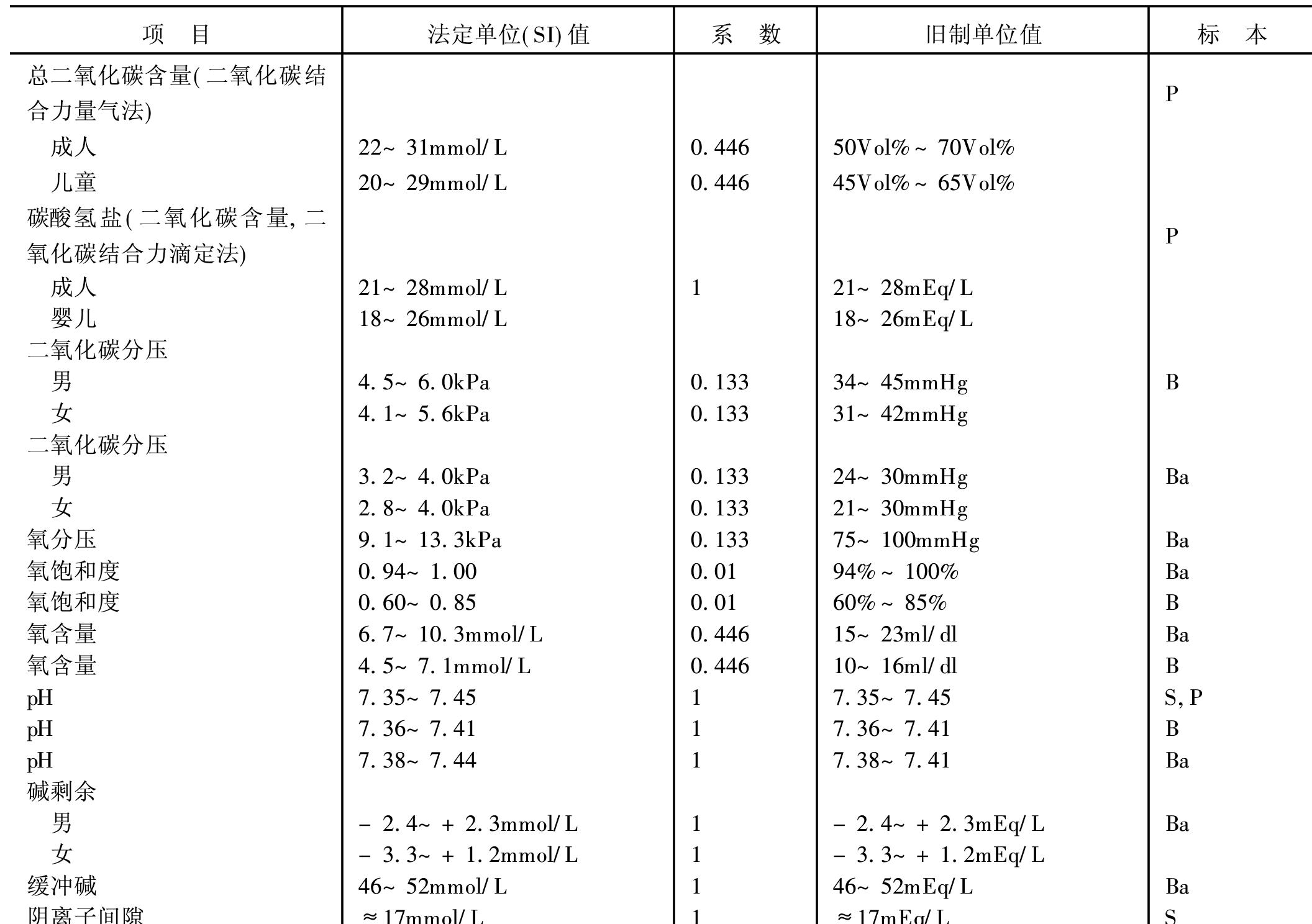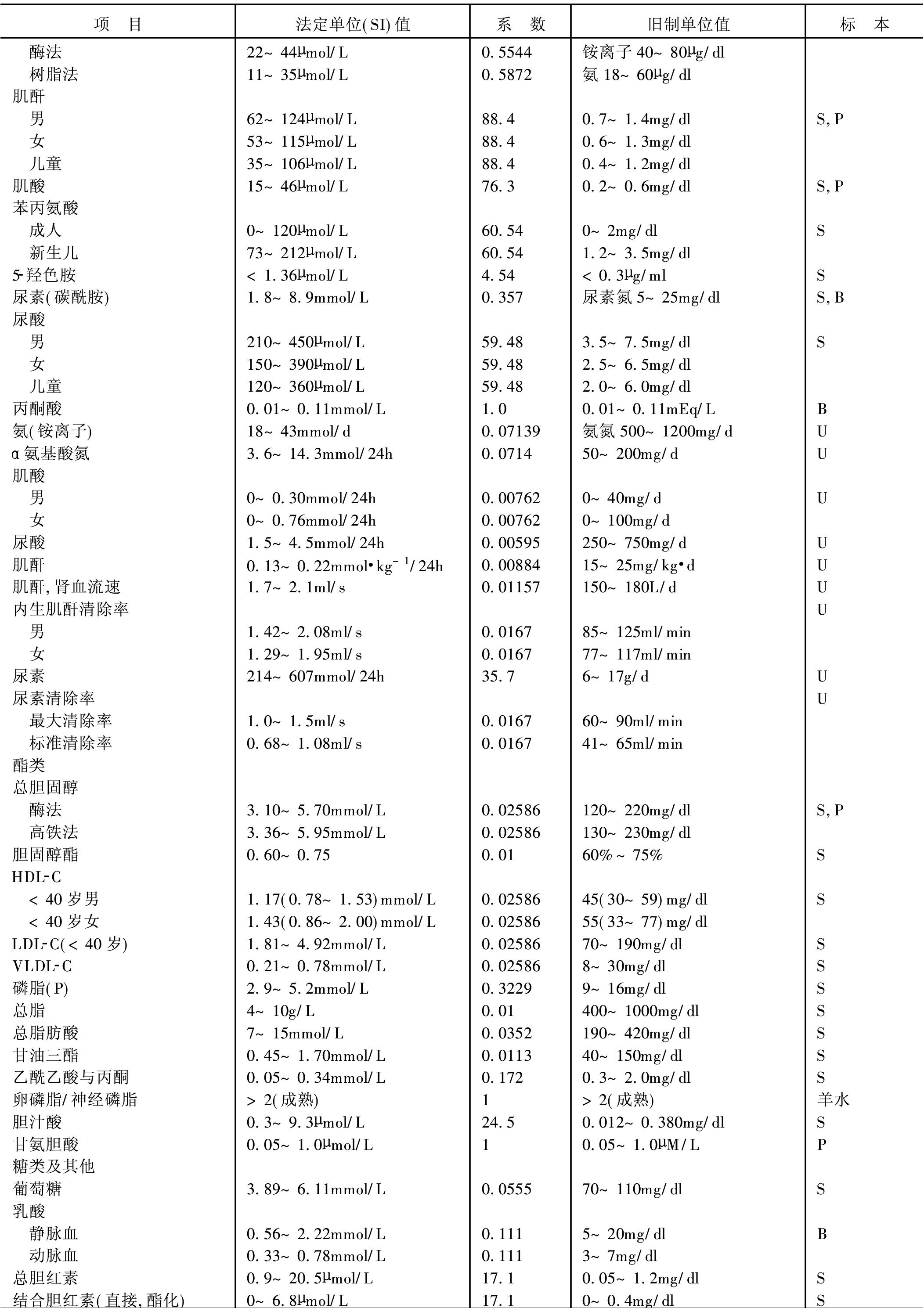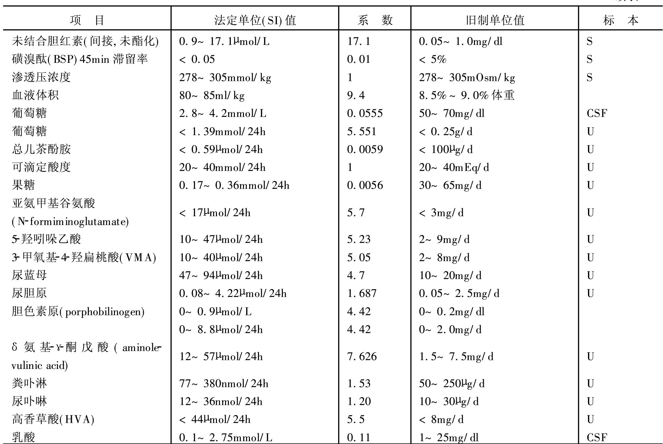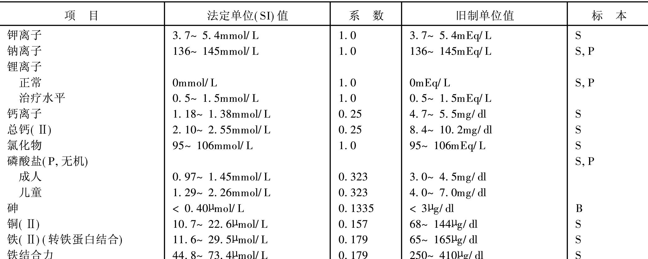 注:①法定单位值=系数×旧制单位值。 ②标本符号:B=静脉全血;Ba=动脉全血;S=血清;P=血浆;CSF=脑脊液;U=尿液;RBC=压实红细胞;WBC=白细胞。 ③Hb=血红蛋白。续表