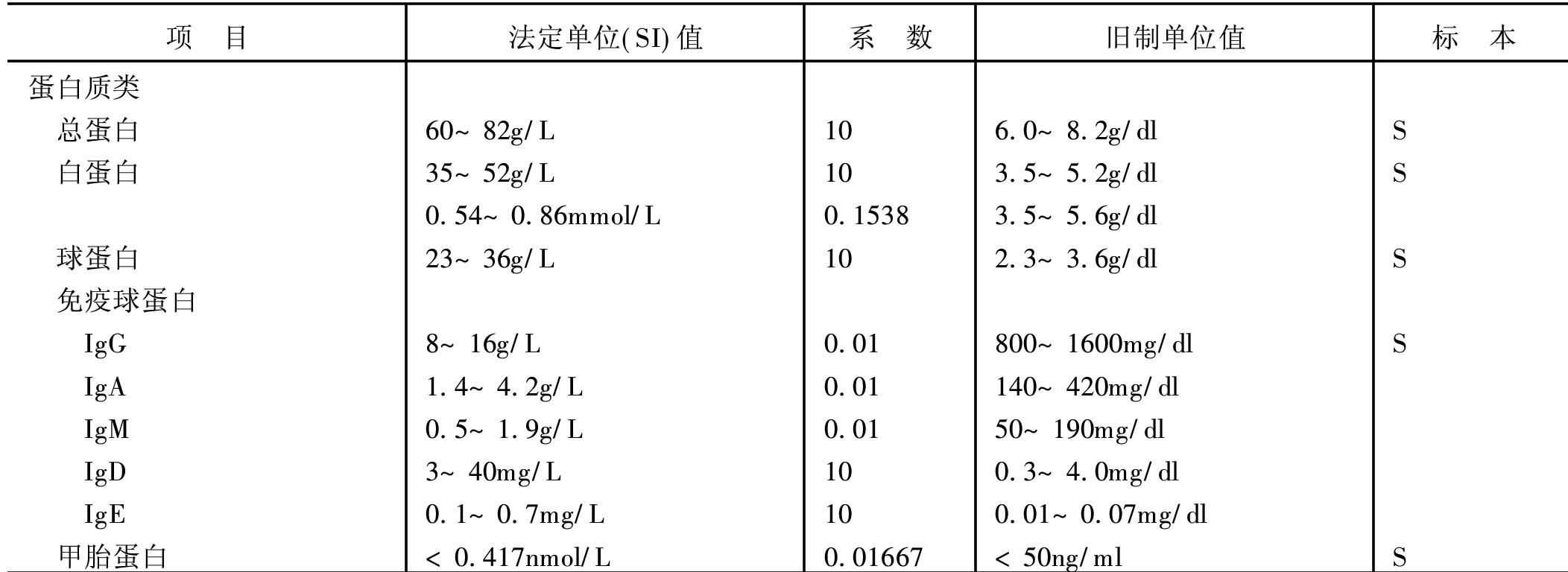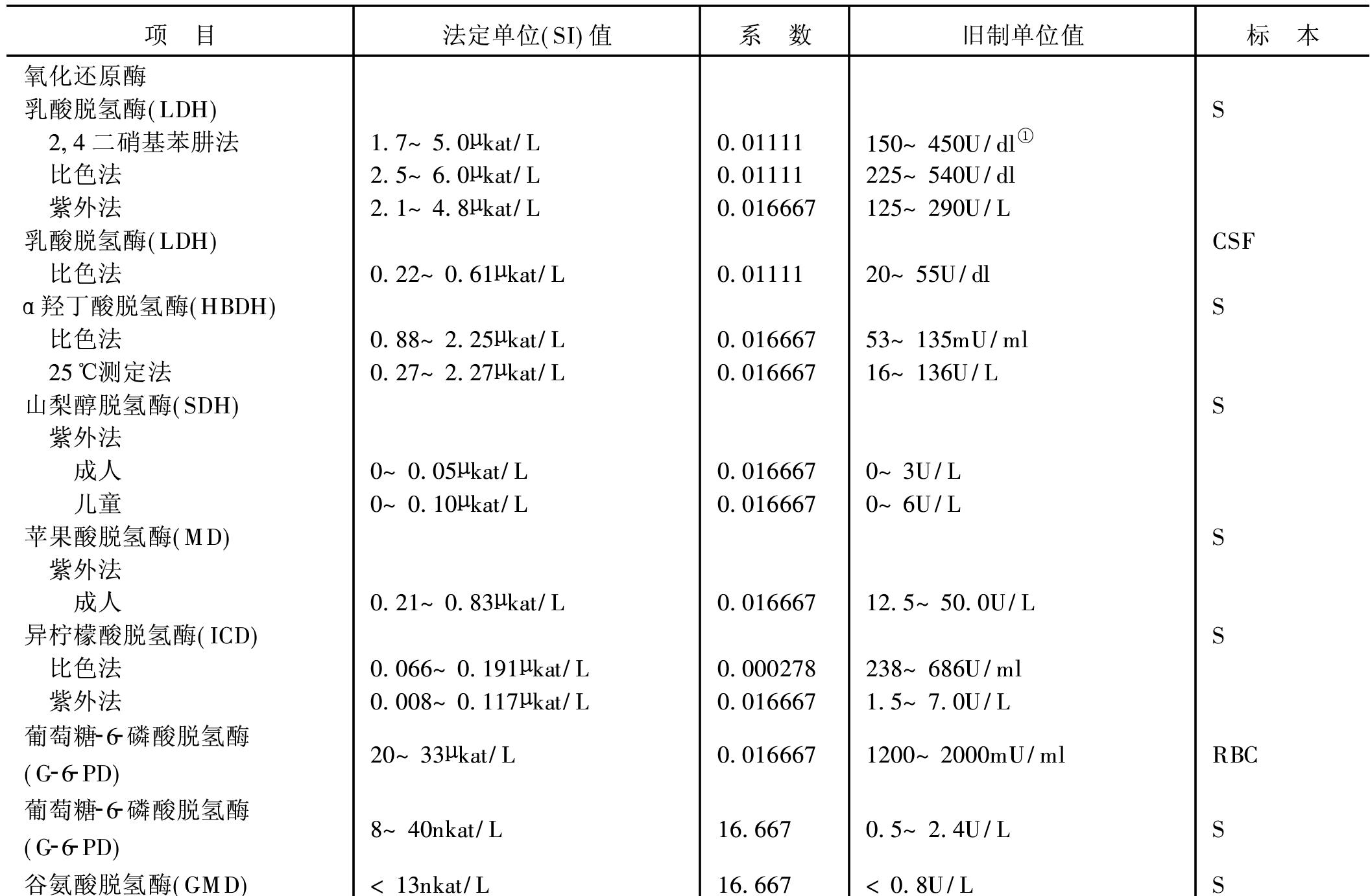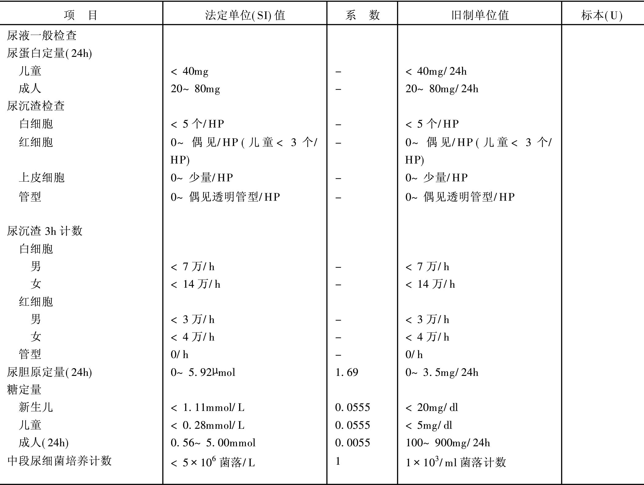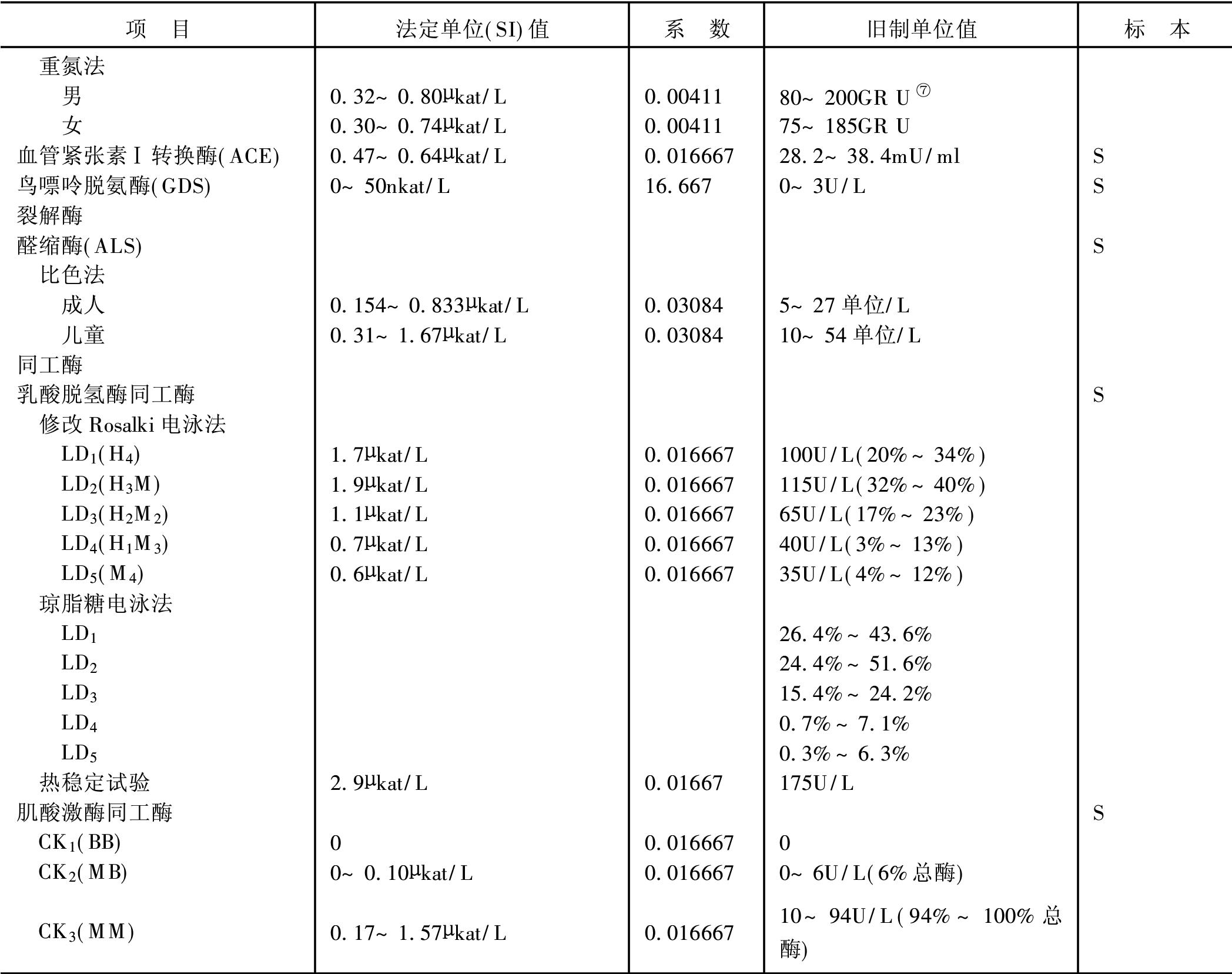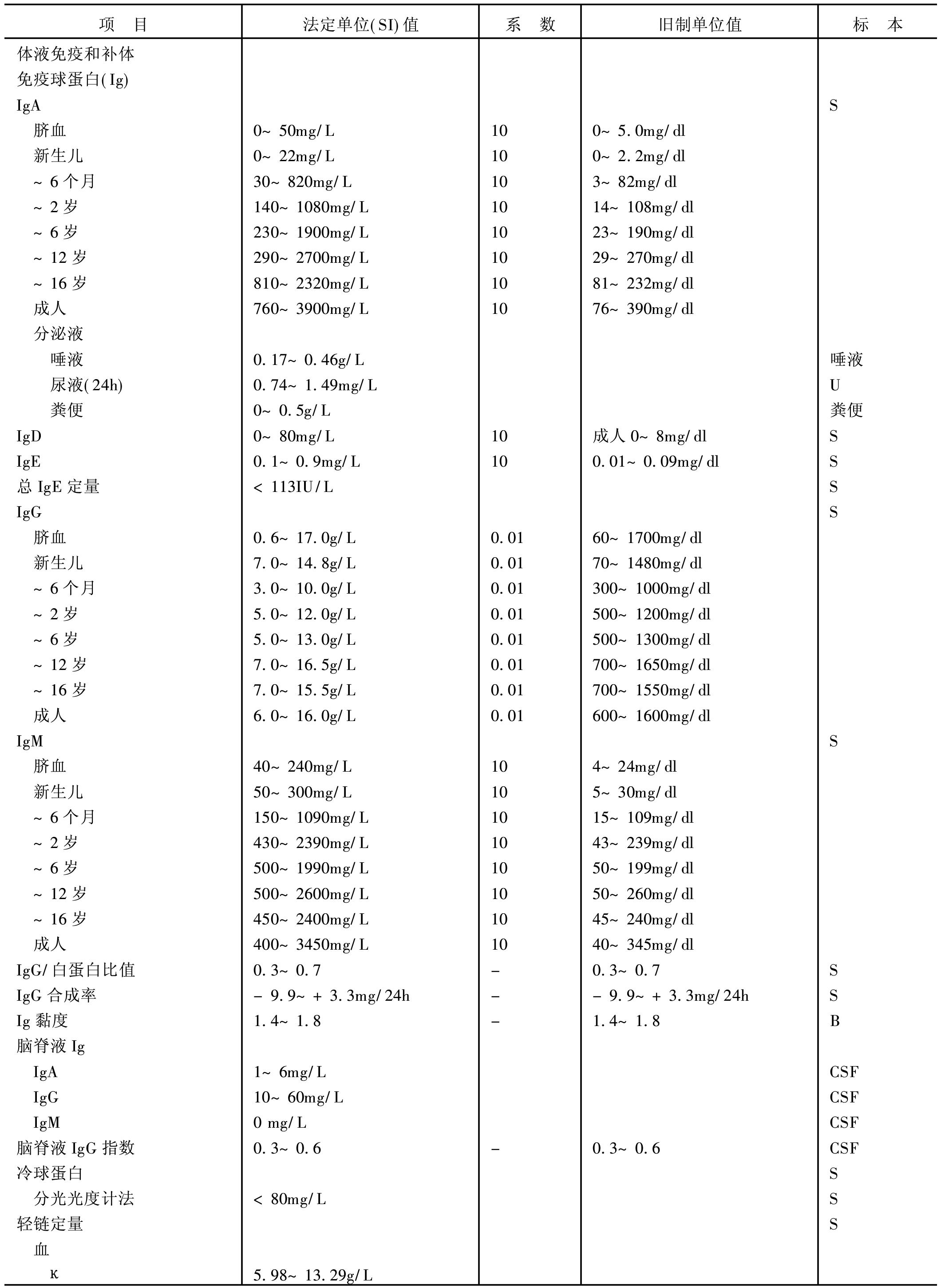 注:①法定单位值=系数×旧制单位值。 ②标本符号:B=静脉全血;Ba=动脉全血;S=血清;P=血浆;CSF=脑脊液;U=尿液;RBC=压实红细胞;WBC=白细胞。 ③Hb=血红蛋白。续表