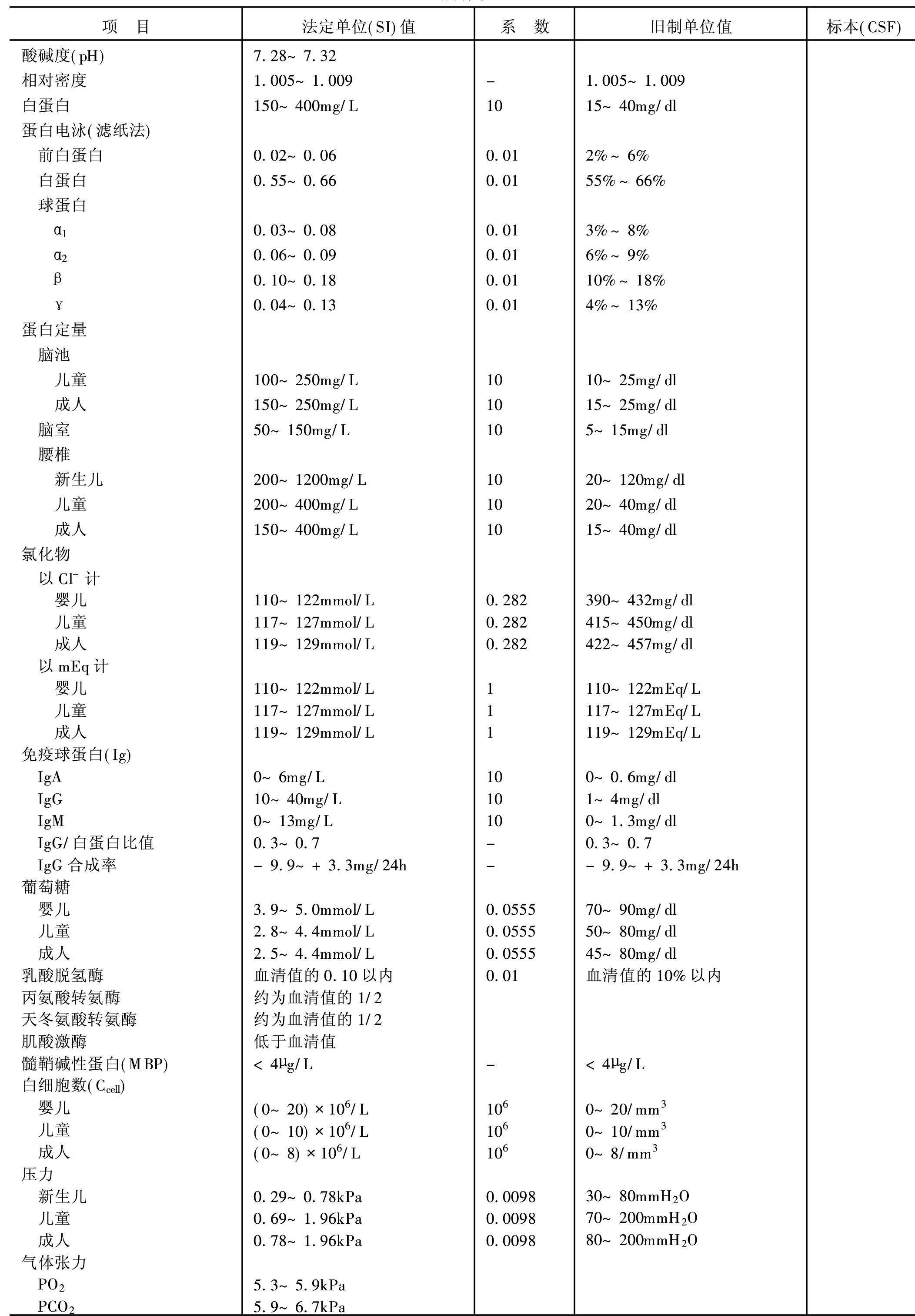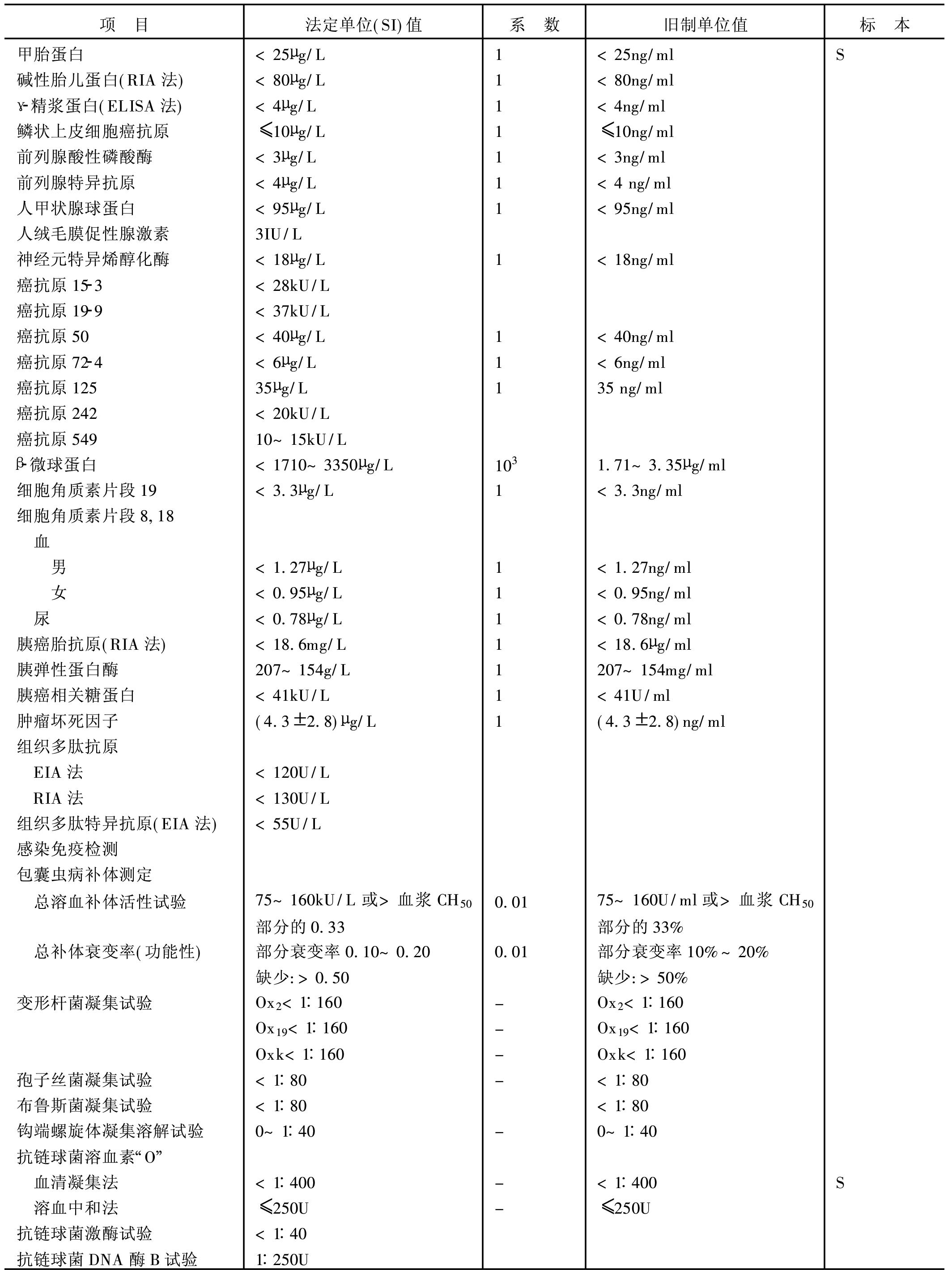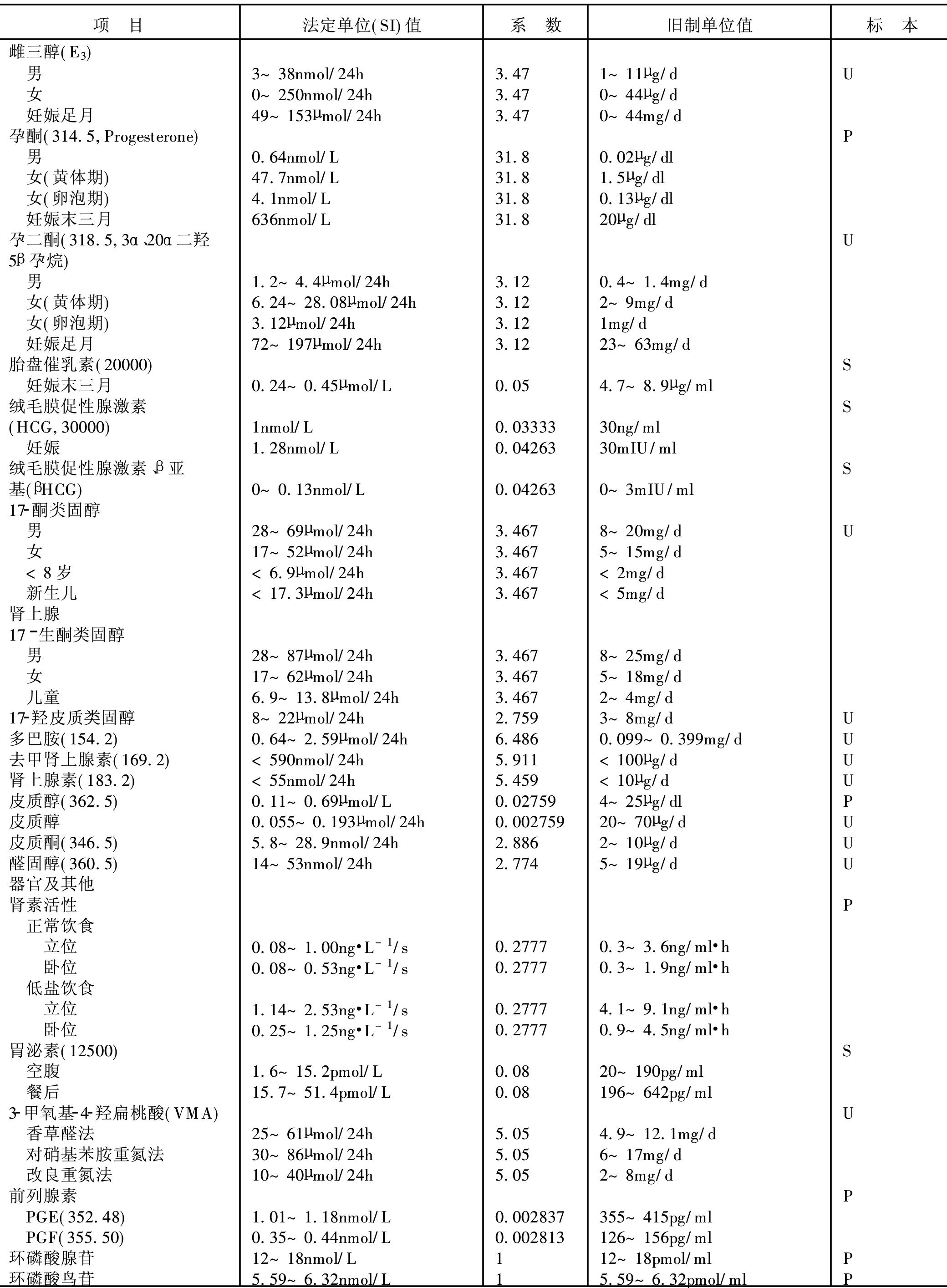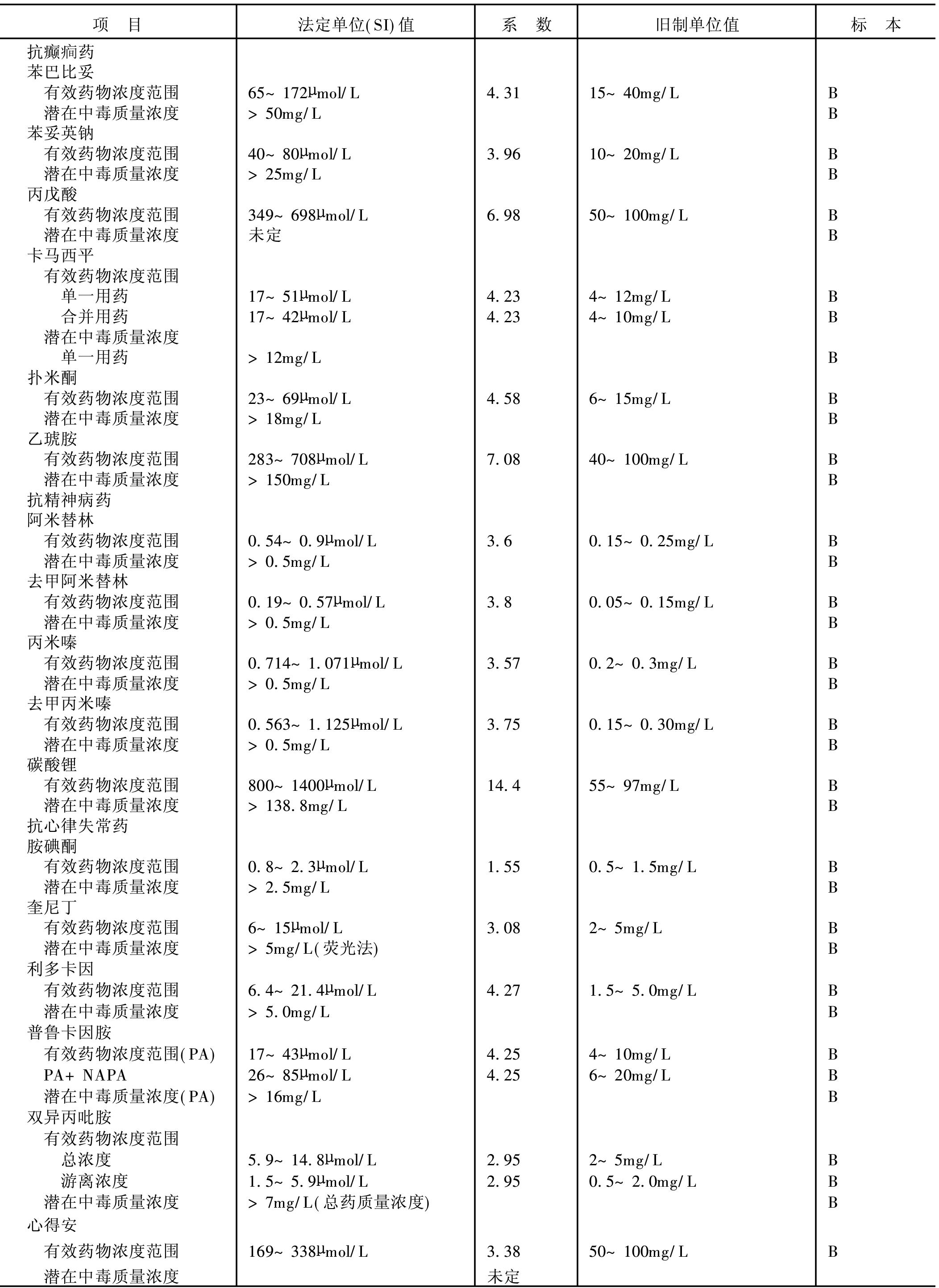 注:①法定单位值=系数×旧制单位值。 ②标本符号:B=静脉全血;Ba=动脉全血;S=血清;P=血浆;CSF=脑脊液;U=尿液;RBC=压实红细胞;WBC=白细胞。 ③Hb=血红蛋白。续表