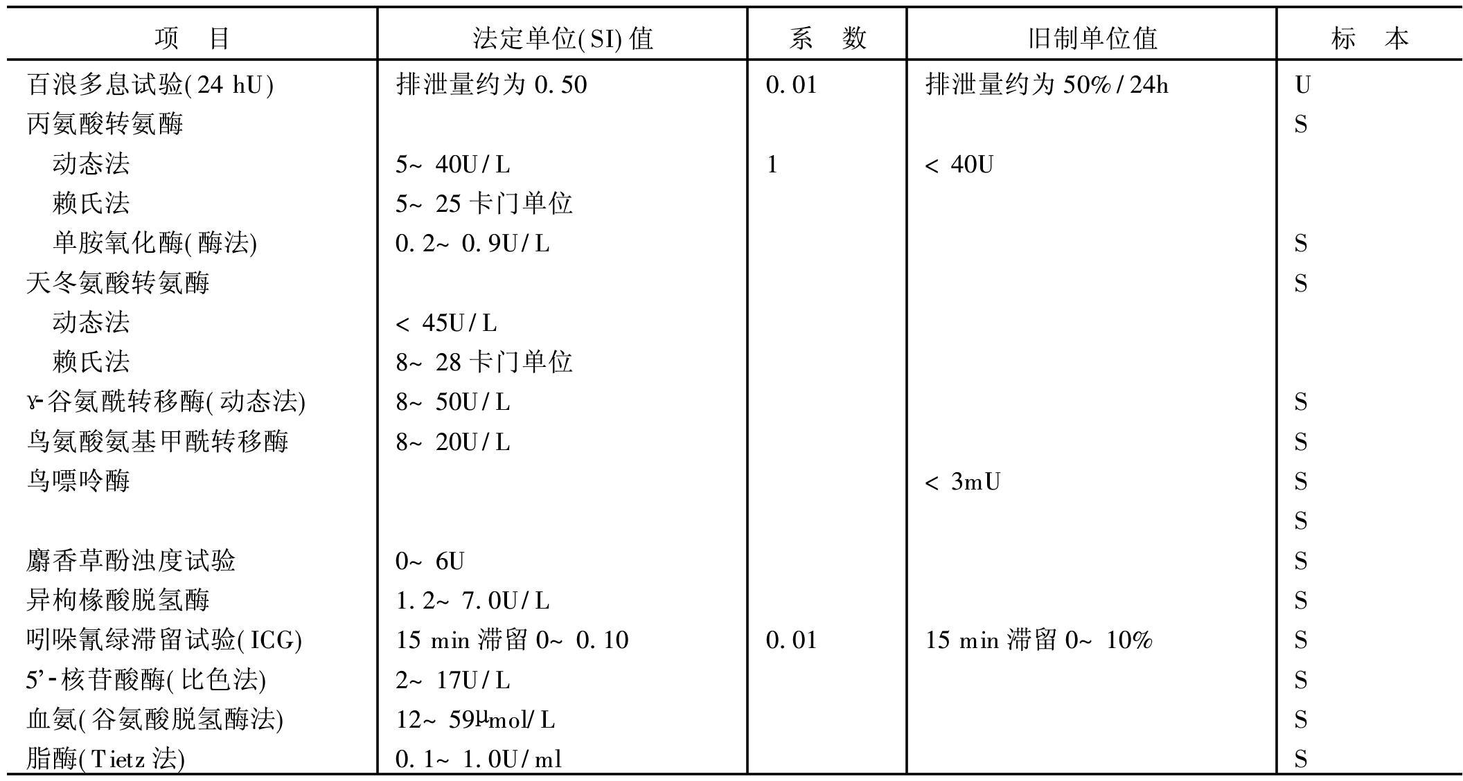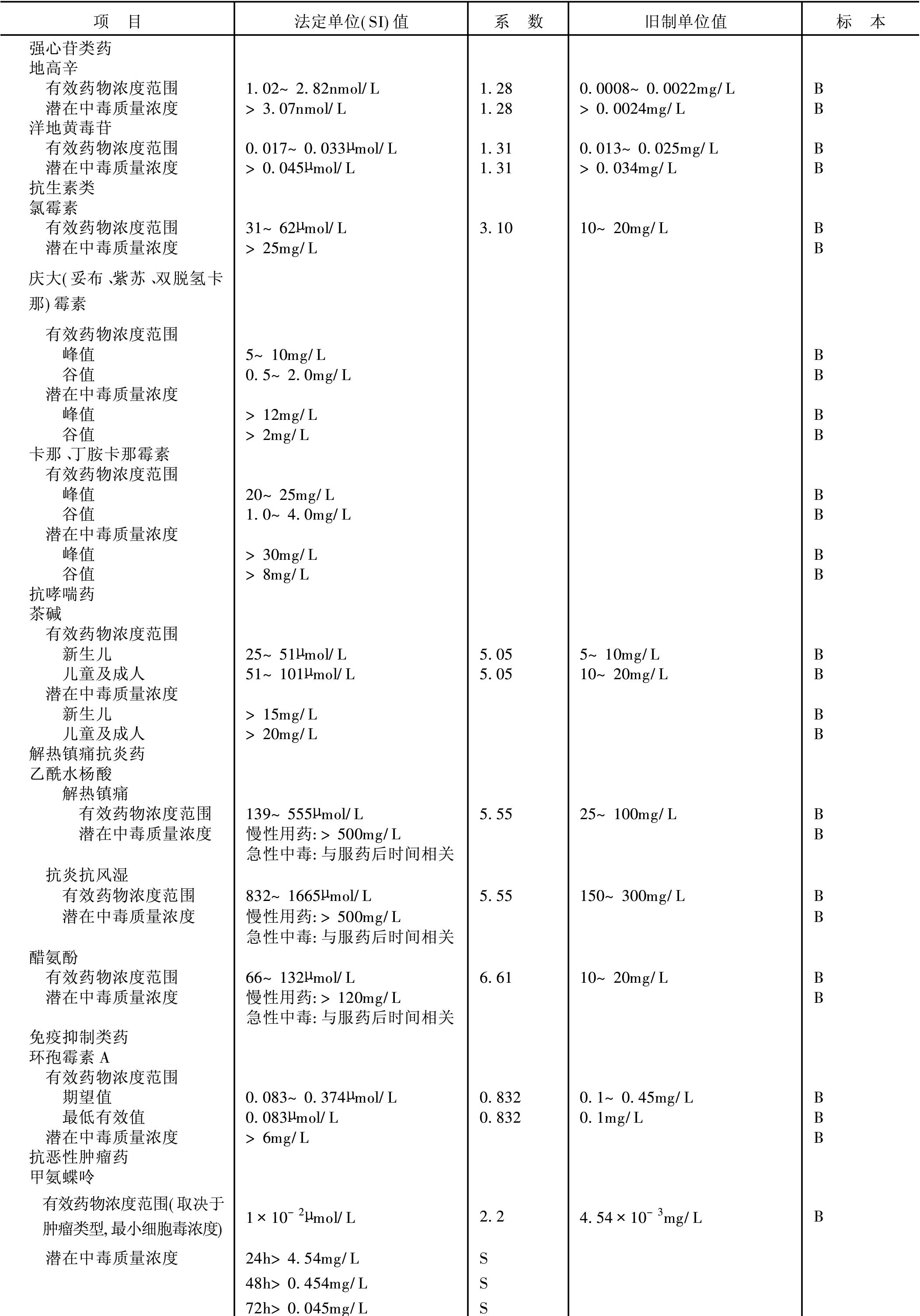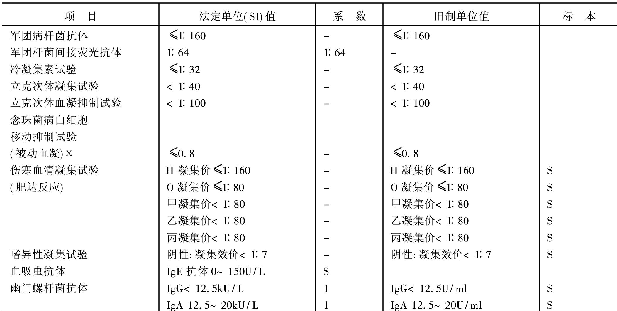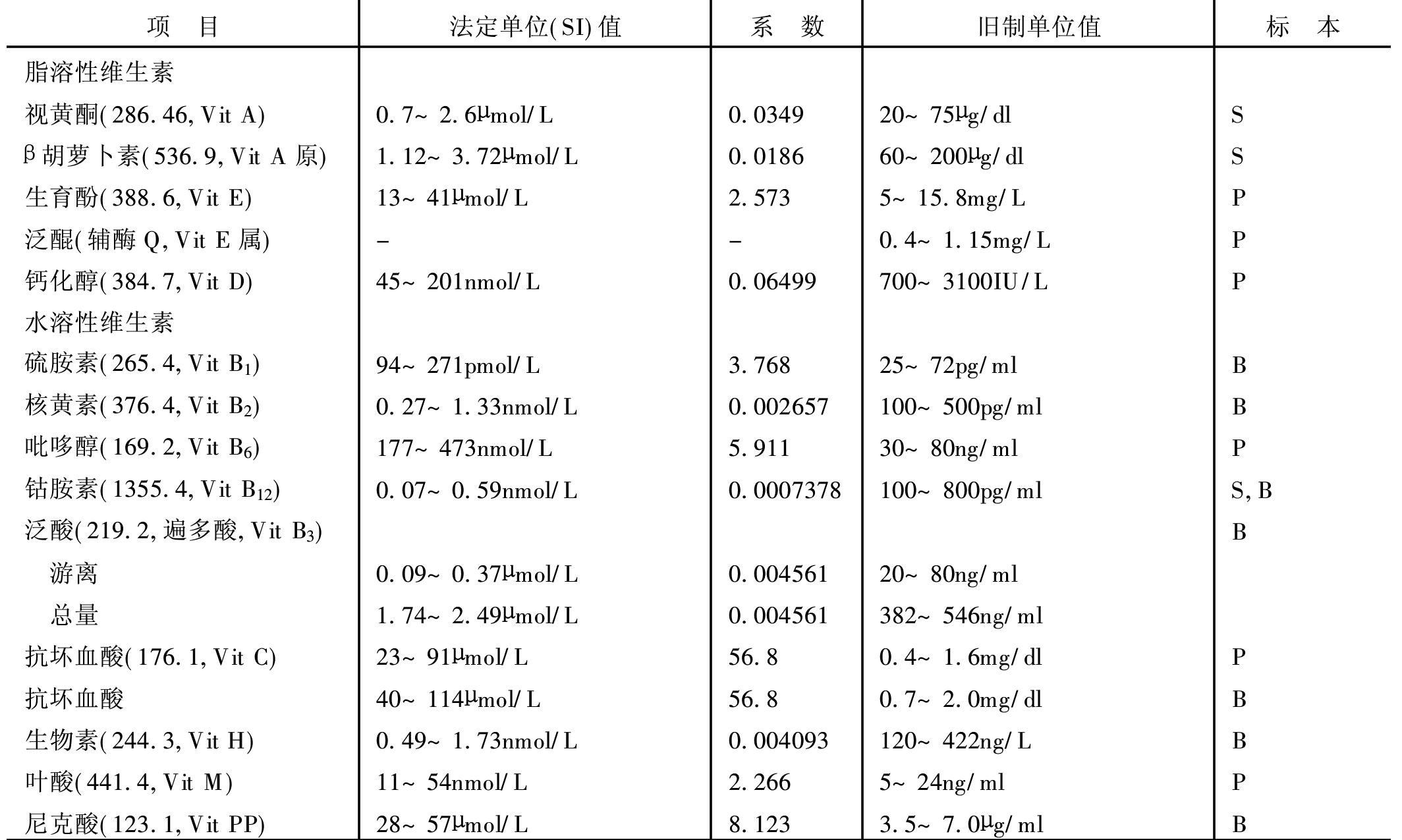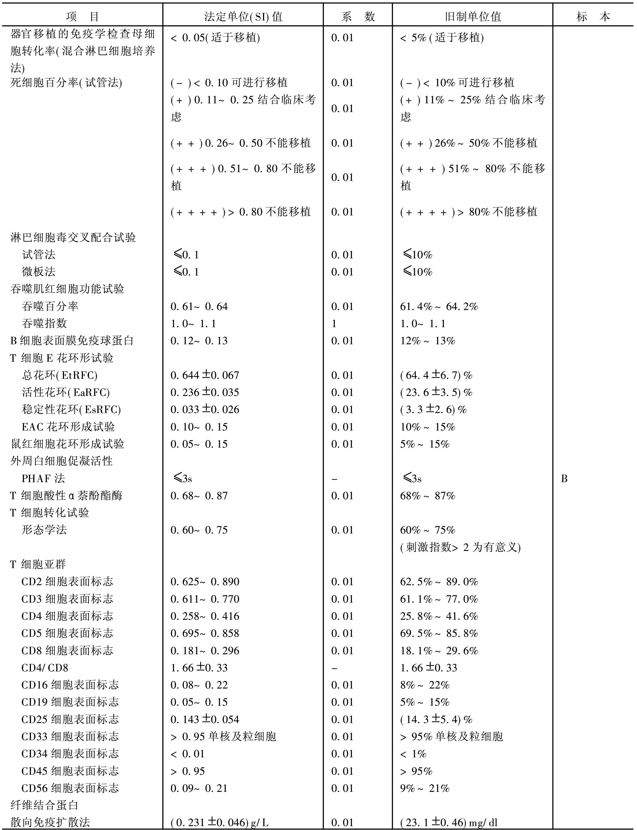 注:①法定单位值=系数×旧制单位值。 ②标本符号:B=静脉全血;Ba=动脉全血;S=血清;P=血浆;CSF=脑脊液;U=尿液;RBC=压实红细胞;WBC=白细胞。 ③Hb=血红蛋白。续表