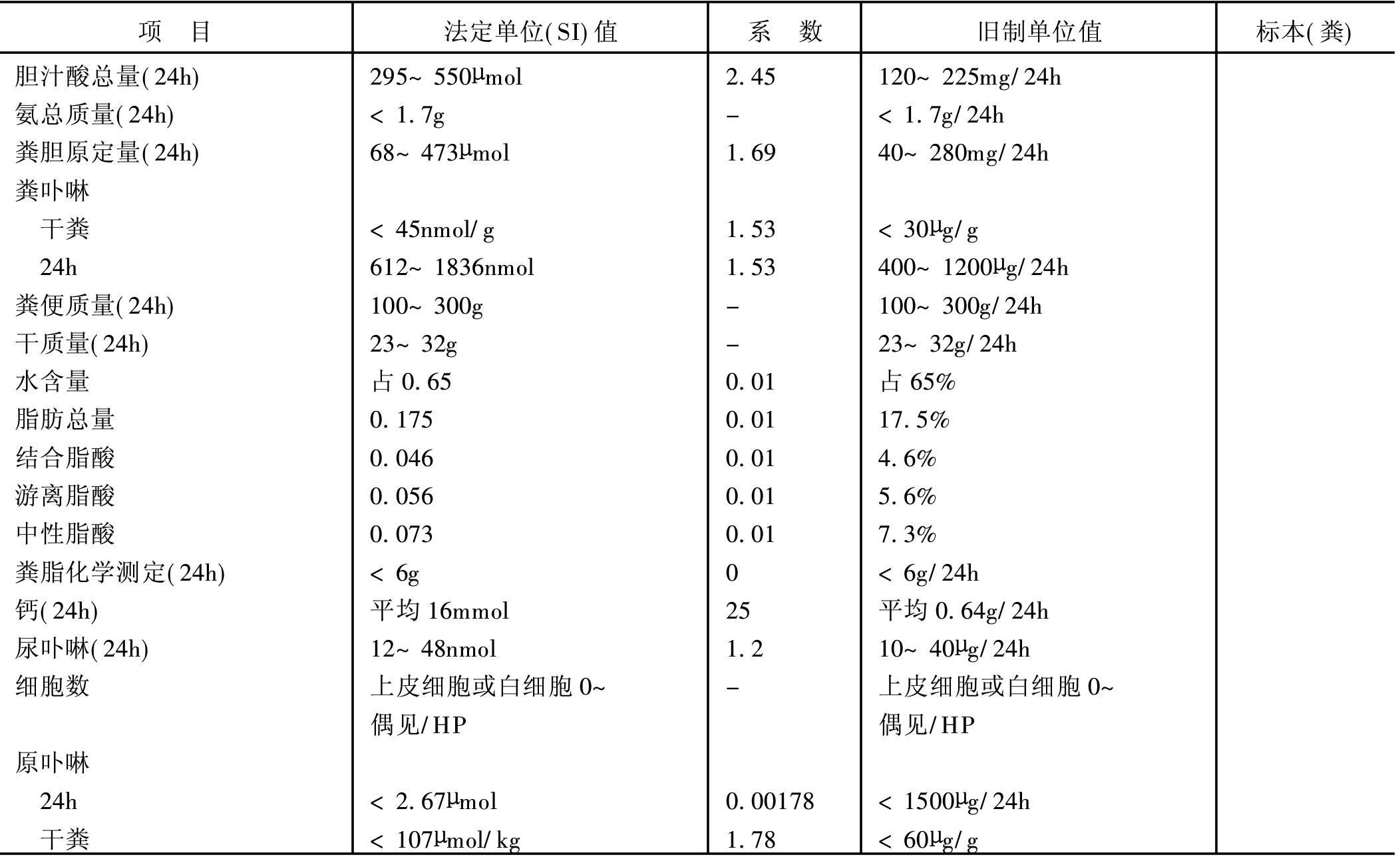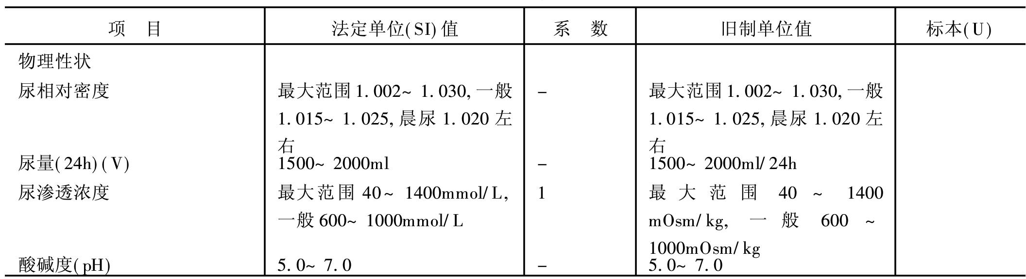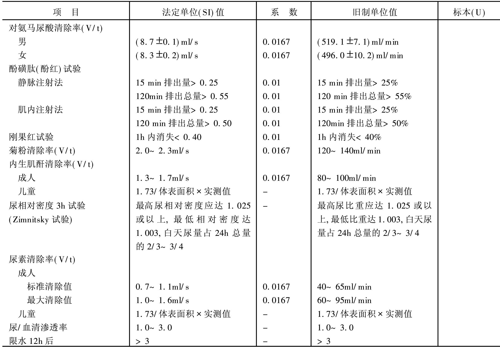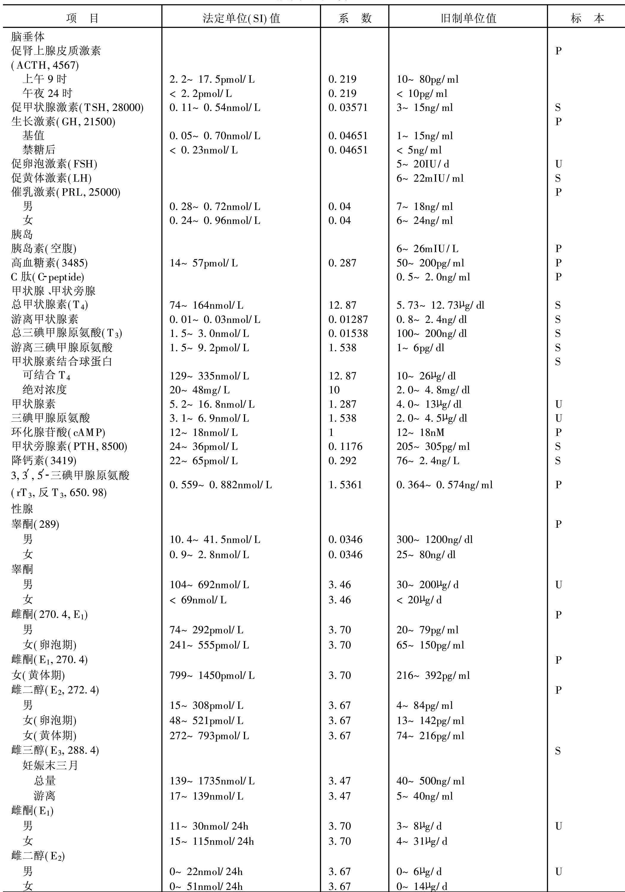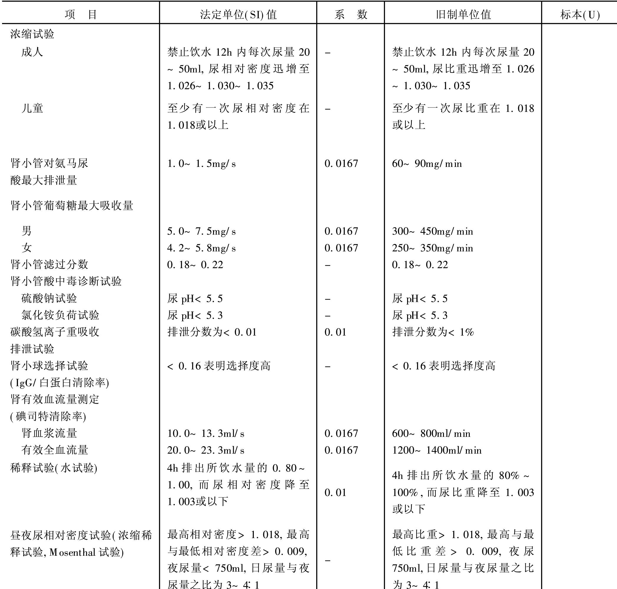 注:①法定单位值=系数×旧制单位值。 ②标本符号:B=静脉全血;Ba=动脉全血;S=血清;P=血浆;CSF=脑脊液;U=尿液;RBC=压实红细胞;WBC=白细胞。 ③Hb=血红蛋白。续表