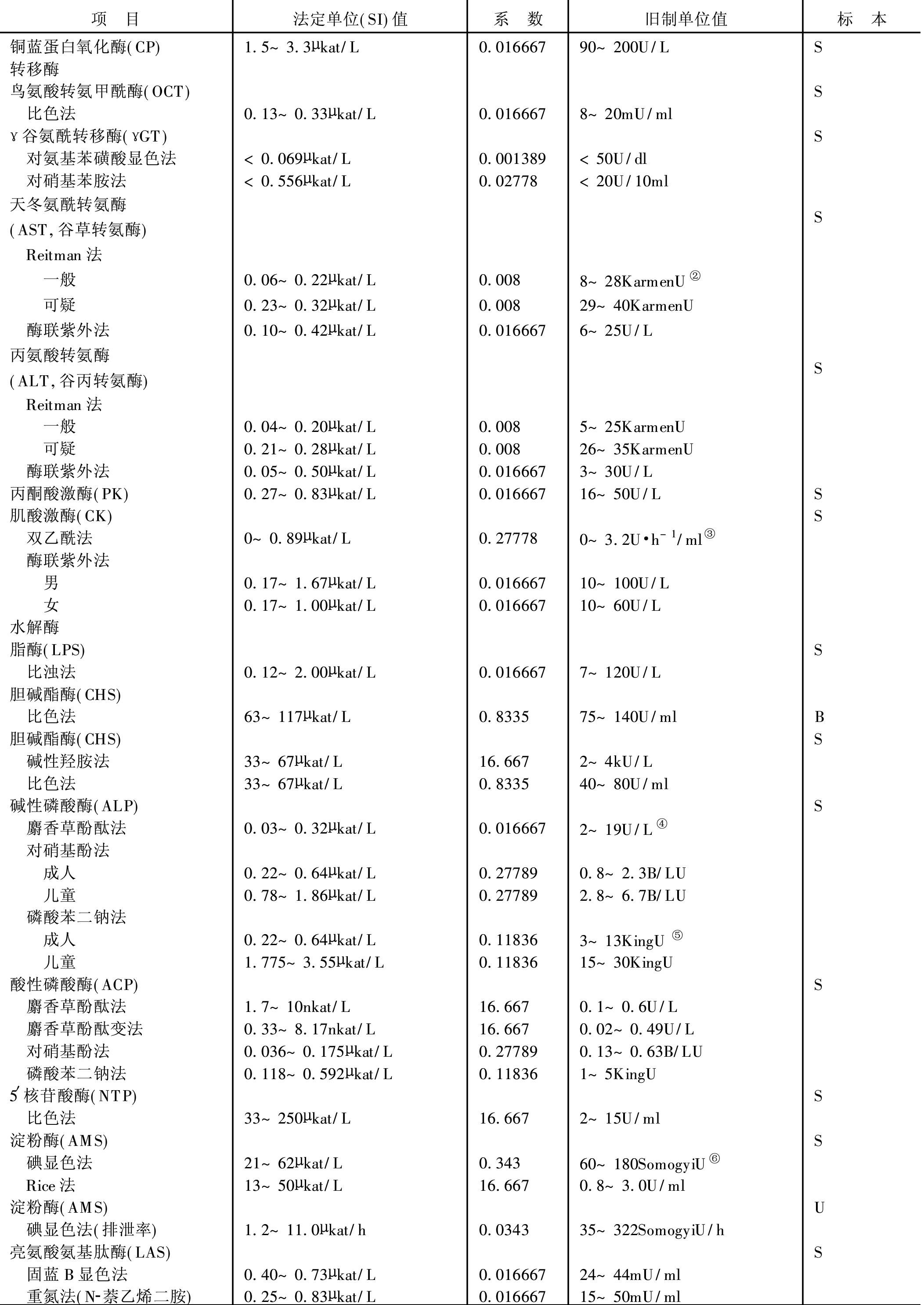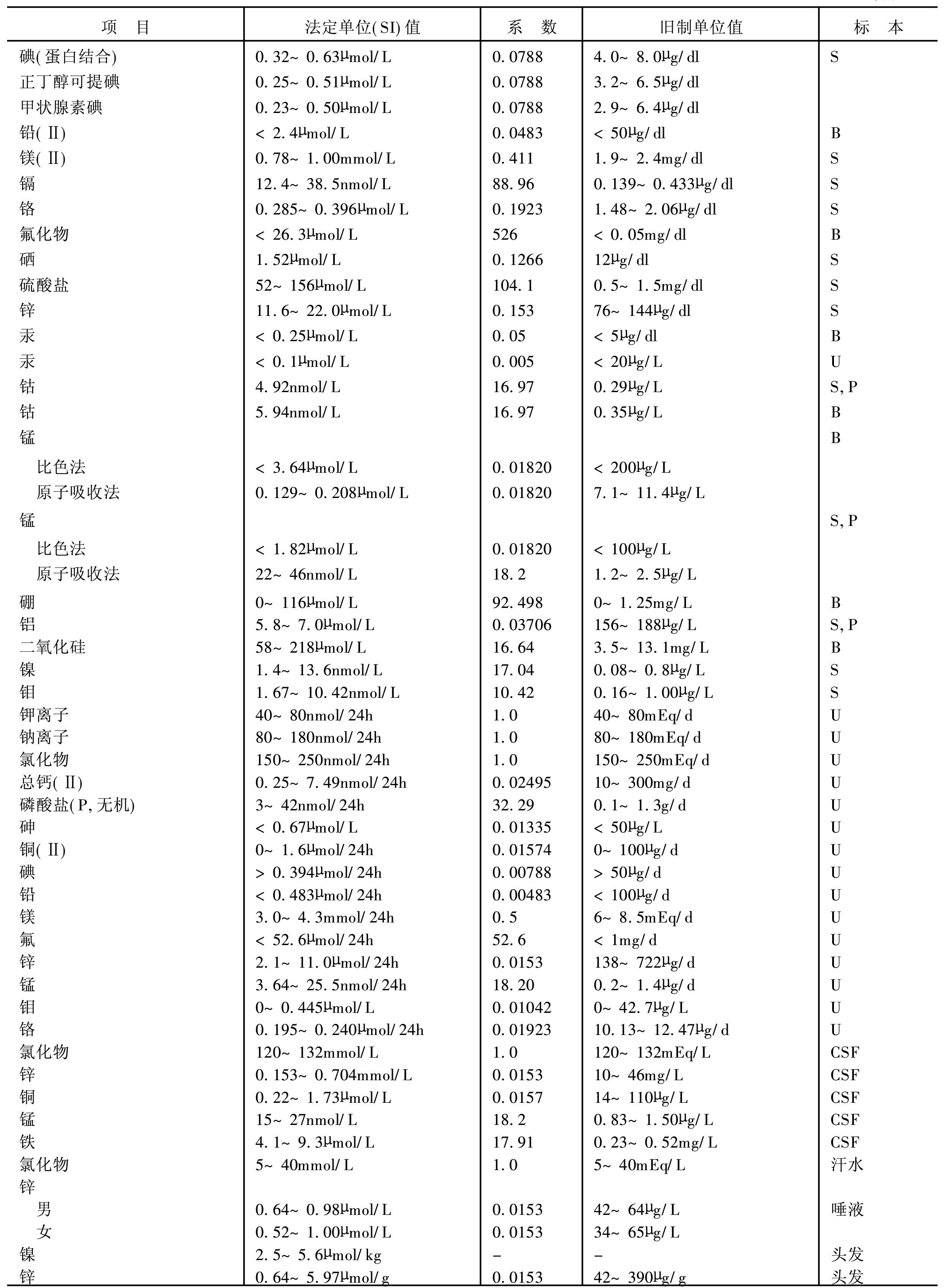 注:①1U=1μmol·min-1=0.01667μmol·s-1=0.01667μkat。 ②Karmen单位定义为:血清1ml(总反应量3ml),光径1cm,340nm波长,25℃1min还原型辅酶Ⅰ(NADH)每下降0.001A为1单位。 ③双乙酰法的单位定义是:血清1ml,37℃作用1h形成1μmol肌酸为一个单位。 ④每1L血清37℃1min产生1μmol麝香草酚酞为1单位。 ⑤King单位为:100ml血清,能产生1mg的酚的酶活力单位。King单位×7.1=mlU。 ⑥每100ml血清37℃15min水解淀粉5mg(30.86μmol)为1 Somogyi(苏木杰)单位。 ⑦每0.02ml血清,在37℃2h,生成1/12μgβ-萘胺为一个GR单位,相当于0.24mlU/ml。无机元素检验参考值