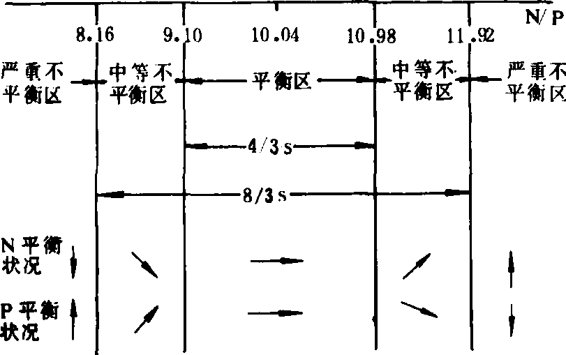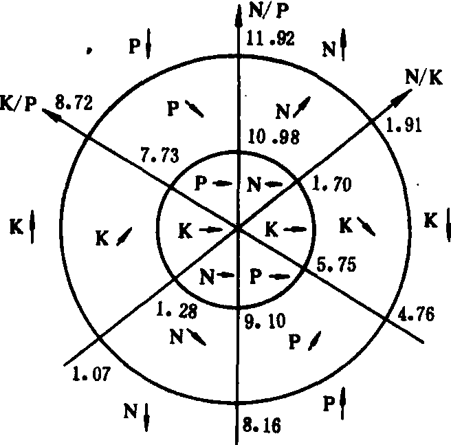 A为点疏散区;B为点密集区 诊断程序 DRIS的工作程序是:❶收集有产量及叶片养分分析的多套资料,其中高产资料套数不少于总数的10%。资料容量尽可能多,要取自随机。 ❷确定高、低产的产量分界水平,并把产量数据分成高产群和低产群。 ❸计算各种养分表现形式(见表1)的平均值、标准差、变异系数及方差。 ❹以低产群体方差为大变量,高产群体方差为小变量,进行显著性测定,以确定重要元素比值。未达到极显著水平的可认为是不重要的,不作考察。 诊断方法 在完成上述数据处理后,可根据需要采用下述两种方法中的一种进行诊断。 图示法 以高产群差异显著的养分表现形式均值为圆心,±4/3S(标准差)和±8/3S为半径作两个同心圆,以N/P、N/K、K/P的坐标轴平分圆(图2),构成坐标系。在坐标系中,处于±4/3S的圆内(内圈)区域是植株养分平衡的区域,以平衡箭头“→”表示;外圈区域是稍不平衡区域。它以坐标轴分成两个副区,一个是元素较富区,一个是元素较缺区。分别以与水平成45°角的箭头“↗”和“↘”表示;圈外区域是显著不平衡区域,同样分为两个副区。一个极丰富,一个极缺。分别以垂直箭头“↑”和“↓”表示。以表1玉米N/P为例(玉米N/P高产群均值),图示如下: 表1 玉米叶片分析结果及其统计参数