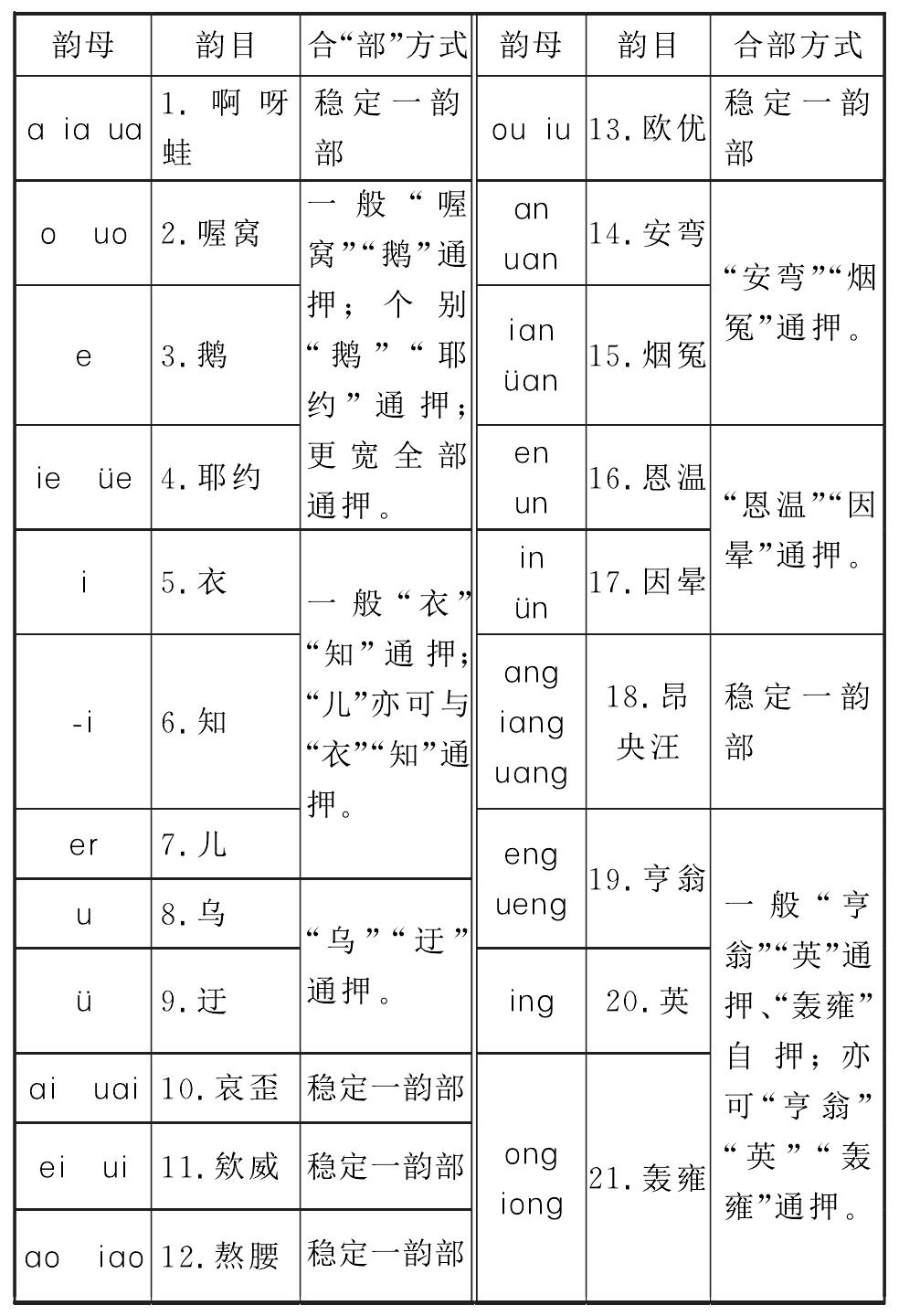诗韵汇鉴︱通韵新编(合部21韵)说明 通韵新编(合部21韵)说明 《通韵新编》为普通话音系韵书。根据《汉语拼音方案》以及韵部与韵母关系的统计分析结果(参见本书附录《试行和完善〈中华通韵〉 传承与发展中华诗词》一文),采用“有分有合,可严可宽,分‘韵’从严,合‘部’从宽”的韵部划分方式,按“小类”分为21“韵”,每“韵”既可独用自押,又可按“大类”让相关“韵”同用通押,进而合为若干“部”。鉴于本韵书之特色,可称之为“合部21韵”。不同的合“部”方案,可与通行的相关韵书兼容。用“韵”或是用“部”,诗词曲创作者可根据创作体裁与习惯自主选择。本韵书的韵部划分如下表所示: 《通韵新编(合部21韵)》韵部划分表