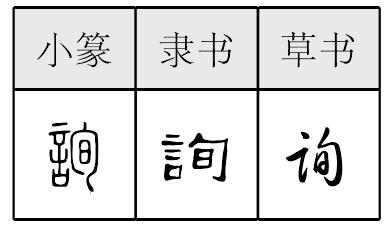 释义 | 询 询xún征问,谋划。《小雅·皇皇者华》五章: “载驰载驱,周爰咨询。”毛《传》:“亲戚之谋为询。”朱熹《集传》:“询,犹度也。”《大雅·皇矣》七章:“询尔仇方,同尔兄弟。” 马瑞辰 《通释》:“《后汉书》伏湛言;文王受命伐五国,必先询之同姓。然后谋于群众。”朱熹《集传》:“仇方,雠国也。兄弟,与国也。”与,盟。 ☚ 诡随 详 ☛ 询读音x·ün(ˊ),为ün韵目,属en-in-un-ün韵部。相伦切,平,谆韵。 上一条: 荀 下一条: 詢 询〔xun〕 ![]() ![]() 询詢xún询问 询问:~问︱查~︱探~︱征~︱咨(zi)~︱质~︱垂~。 询xún询问:查询︱咨询。 询xun询查 询访 询问 查询 探询 征询 咨询 询谋佥同1 询事考言2 询于刍(chu)荛3 (rao) 询(同)讯 问 诘 询xún询答、应;问、询○答dá(动)回答:~复|~辩|~疑|~话|~词|~案|~卷|~数|回~|应~|解~|笔~|奉~|问~|一问一~|~非所问|对~如流 ○应yìng(动)回答:~答|~对|答~|回~|呼~|互相呼~|其~如响|遥相~和|一呼百~。 ●问wèn(动)提出问题:~讯|~答|~题|~事处|反~|试~|查~|追~|盘~|责~|喝~|垂~|提~|发~|请~|疑~|~道于盲|刨根~底|追踪~迹|入国~禁|入境~俗|无人~津|质疑~难|不耻下~|反躬自~|扪心自~|明知故~|答非所~。 ●询xún(动)询问:~问|问~|问~处|~问病状|~问道路|问~公司情况|探~对方意见。 询xún〖动词〗 询xún❶ 询问,咨询。《诗经·大雅·板》:“先民有言,~于刍荛。”(刍荛:割草打柴之人。)刘开《问说》:“舜以天子而~于匹夫。” 询*詢xunD1AF 查考 查考询(询究) 考案 追考 检坐 质究 钩校 究度 究诘 检详 体度 按省 按寻 按试 稽核 稽酌 考稽 考究 另见:调查 研究 考核 证实 说明 ☚ 查考 考证 ☛ 确实 确实实(实落;实实;实确;实然;定实;着实;端实;煞实;其实;信实) 委(委是;委实) 谅 底 恂 询 洵(~属可贵) 的(的的;的确;的真;的当;的实;端的;委的) 凿(凿凿;凿然) 固诚(~非所料;~有其人) 谌 镌(~如所言) 真(真个;真是;真成;真正;真来;当真;认真) 展(~也有成) 良 允(允洽) 确乎 确切 确核 确然 明白(援证~) 道地 不假 另见:证据 凭证 是 正确 无错 结论 ︱虚假 ☚ 确实 非常确实 ☛ 询问 询问询(询叩;访询;咨询) 讯(讯问;讯诘;讯访;访讯;考讯) 诹(诹询) 诘 请 叩(叩问;叩咨) 问(问取;问话;问询;问语;问审;问道;顾问;说问;展问;取问;攀问;言问;讥问;寻问) 闻 谉 谘白 谇候 另见:征询 征求 打听 意见 ☚ 反问 问事 ☛ 询詢xún相伦切,平谆。 询xún询问,征求意见。如:探询,查询,咨询。 询(詢)xún (询问) ask; inquire: 查 ~ make inquiries (about); 征 ~ seek the opinion of; consult 询詢xún(8画) *询(詢)xún8画 言部 征求意见;探问: 探~|咨~|质~。 询詢xún秦代竹简有询(詢)字。两汉、六朝继承。古书《尔雅》《诗经》都有,也或用恂字(信心义),或用洵字(本指㳡水的别支。假借为诚然,实在义)。《说文》漏收(宋初徐铉《说文·新附》有),但梁代《玉篇》,宋初《广韵》等都有。询是从讠(言)、旬声的形声字。《玉篇》说询是咨询义;即询问,求教义;也有问,征求意见义。如:探询|查询。组词如:询问|咨询(现咨询的咨规范作咨,《通用字表》不收谘(諮)字。《新华字典》等以諮为咨的异体)。又有谋,查考义。 询詢★繁◎常★常xún詢,形声,从言,旬声,本义为问、征求意见,引申为查考。《简化字表》类推简作“询”。 【辨析】 询/讯/问 这三个字都表示问,区别在于:“询”多用于请教和查考,“讯”多用于审问,“问”的使用范围最广,指一般的询问,也可以指审问。 |
