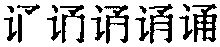 诵 诵sòng❶诗篇。《小雅·节南山》十章:“家父作诵,以究王讻。”朱熹《集传》: “究, 穷。家父自言作为此诵,以穷究王政昏乱之所由。” 《大雅·崧高》八章:“吉甫作诵,其诗孔硕。”郑《笺》:“吉甫为此诵也,言其诗之意甚美大风切。” ❷讽谏。《说文》:“诵,讽也。”《大雅·桑柔》十三章:“听言则对,诵言如醉。”朱熹《集传》:“王使贪人为政,我以其或能听我之言而对之。然亦知其不能听也,故诵言而中心如醉。”马瑞辰《通释》: “诵言即讽谏之言也。” ☚ 说怿 祛 ☛ 诵读音s·ong(ˋ),为ong韵目,属eng—ong—iong—ueng韵部。似用切,去,用韵。 ❶背诵。 ❷朗诵。 ❸述说;称述。 上一条: 淞 下一条: 誦 诵〔song〕dux; nieab。 诵读 〔song du〕 nieab: ~书本。nieab bent ndeud. 诵誦{}三4482动穿。闽语。福建福州。魏应麒《福州歌谣甲集自序》:「妈妈仅排班,今日~夹仔,明旦红裙重紫衫。」   诵誦sòng❶朗读 △ 吟~|~经。 ❷述说 △ 广为传~。 ❸背诵 △ 过目成~。 诵❶念;读出声音来:~读︱背~︱吟~︱朗~︱讽~。 ❷背诵:记~︱过目成~。 ❸述说:传~丨称~。 诵sòng❶ 朗读:朗诵│诵诗。 ❷ 述说:传诵。 ❸ 凭记忆念出来:背诵│熟读成诵。 诵sòng押韵而便于吟咏的诗文。也是诗歌的另一个说法。《诗经·大雅·烝民》:“吉甫作诵,穆如清风。”郑玄笺:“吉甫作此工歌之诵,其调和人之性如清风之养万物然。”作诵,即作诗。《九辩》:“自压桉而学诵。”学诵谓学诗。 诵song诵读 背诵 传(chuan)诵 讽诵 记诵 朗诵 默诵 吟诵过目成诵 熟读成诵 诵sòng诵sòng旧时北京古书店通学斋货价暗码,谓数目一。参“诵、诗、闻、国、政、讲、易、见、天、心”条。 诵sòng〖动词〗 一、诵读,朗诵(8)。《相州昼锦堂记》:余虽不获登公之堂,幸尝窃诵公之诗,乐公之志有成,而喜为天下道也。——我虽然不能登上公的昼锦堂,幸而曾经私下诵读过公的诗,高兴公的志向得以实现,因而愉快地向天下人称道公的事迹。《辨奸论》:今有人,口诵孔、老之言,身履夷、齐之行。——如今有人,口里诵读孔子、老子的词句,亲身实践伯夷、叔齐的行为。《前赤壁赋》:举酒属客,诵《明月》之诗,歌《窈窕》之章。——举起酒怀劝朋友们喝酒,朗诵《明月》诗,高唱《窈窕》章。 二、传诵,称诵,诵扬(4)。《游侠列传序》:跖蹻暴戾,其徒诵义无穷。——跖、庄蹻残暴凶狠,他们的党徒传诵他们的义气义却没有穷尽。《游侠列传序》:而布衣之徒,设取予然诺,千里诵义,为死不顾世。——那些平民中的游侠,重视取舍和应允,千里之外都称诵他们的义气,为人而死不顾世人的议论。《太史公自序》:臣下百官,力诵圣德,犹不能宣尽其意。——臣下百官,竭力诵扬圣德,还不能说尽他们的心意。 三、述说(1)。《与于襄阳书》:愈之诵此言久唉,未尝敢以闻于人。——我述说这些话已经很久了,却不曾把这话告诉别人。 诵sòng❶ 背诵,朗读。《孔雀东南飞》:“十五弹箜篌,十六~诗书。”宋濂《送东阳马生序》:“坐大厦之下而~诗书,无奔走之劳矣。” ❷ 陈述,述说。《孟子·告子下》:“子服桀之服,~桀之言,行桀之行,是桀而已矣。”《史记·秦始皇本纪》:“群臣~功,请刻于石。” ❸ 诗篇。《诗经·小雅·节南山》:“家父作~,以究王讻。” ❹ 通“讼”。公开。《汉书·高后纪》:“平阳侯驰语太尉(周)勃,勃尚恐不胜,未敢~言诛之。” 诵*誦songCBD0 ❶朗读,读出声音来:~读/~诗/朗~/背~/吟~/~《诗》三百。 ❷背诵:过目成~/熟读成~/群书万卷常暗~(杜甫诗)。 ❸述说:传~/称~/~其所闻。 ❹<文>诗篇:家父作~,以究王讻(《诗经》)。 背诵 背诵背(~文;~词) 诵(诵读;理诵;覆诵;倍诵;暗诵) 讽(讽诵;讽念;倍讽) 倍读 背诵念过的书:背书 讽书 诵书 背诵书文:倍文 背诵经艺:讽术 能够背诵:成诵(即目~) 默记背诵:记念 记诵 谙诵 刻苦地学习,不停地背诵:口不绝吟 熟练地背诵:熟背 熟记,背诵:谙 读书或背书流利纯熟:滚瓜烂熟 烂泥酱熟 背诵得很熟练:琅琅成诵 背得非常熟练:滚瓜溜油 记得很牢、背诵极熟、极流利:倒背如流倒诵如流 背诵停顿或漏字:踬字 背诵并熟习:诵习 背诵并记住:诵忆 刻苦学习,不停背诵:口不绝吟 (凭记忆念出读过的文字:背诵)