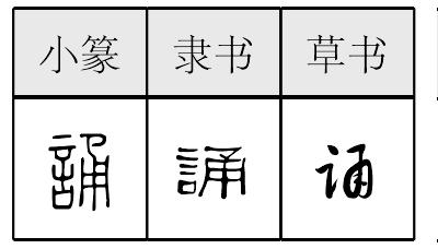 【提示】讠,2画,第二笔一笔连写,不要错分成两笔。用,位于字或部件的下面时,起笔的竖撇改竖; 中间的两横,宋体与左右两边相接,楷体与左右两边相离。 *诵(誦)sòng9画 言部 (1) 朗读;读出声音来: 朗~|吟~。 (2) 述说: 传~。 (3) 背诵;凭记忆念出读过的文字: ~记|暗~|过目成~。 诵誦sòng小篆以来的形声字。从讠(言),甬(yǒng,古代钟柄名)声。声母古代归舌尖音,如甬桶通、滕送、妥绥例。指用有高低抑扬的腔调念。如:朗诵|诵诗。引申为称述,述说。 诵誦★繁◎常★常