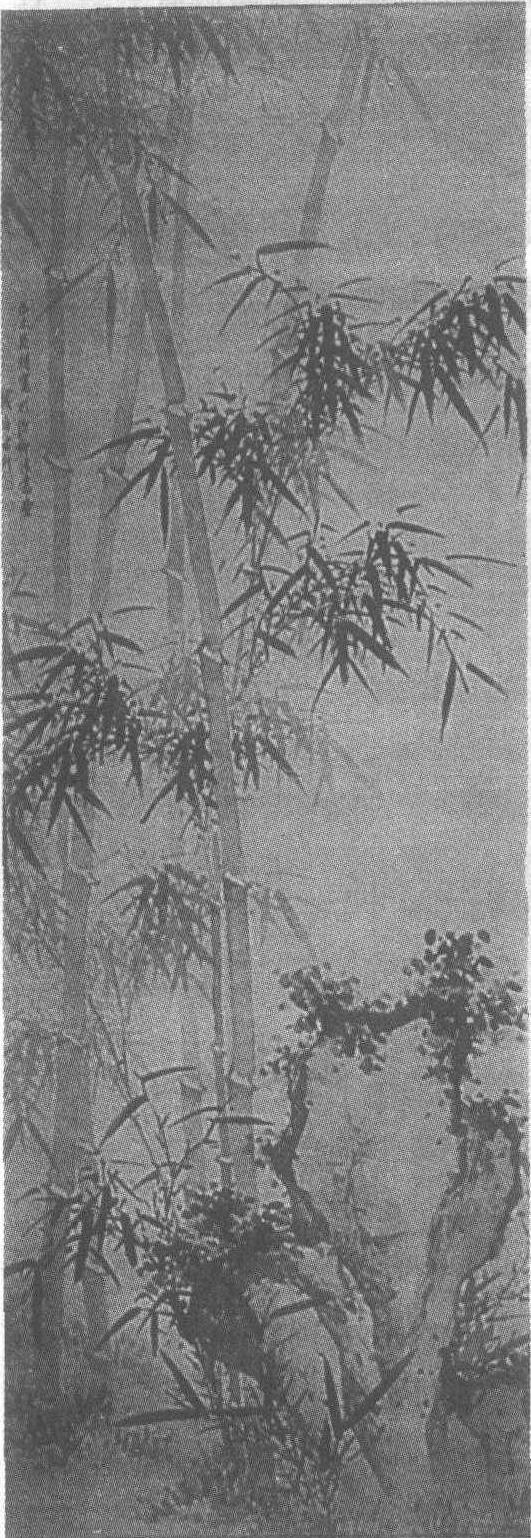 清。诸升绘。绢本水墨。纵195厘米,横69.7厘米。山东省泰州市博物馆藏。诸升(公元1617—?年),字日如,号曦庵,仁和(今浙江杭州)人。善画兰竹石,亦长于山水。下笔劲利,出笔潇洒不凡,所绘翠竹发竿劲挺秀拔,横斜曲直,不失法度,其中雪竹尤为驰名。图中绘墨竹五枝,取其自然生长之态,旁逸斜出,互相交错,以淡墨写竹竿,竹叶则浓淡相间,墨色层次分明,表现出叶子的阴阳向背。作者笔墨老劲,技巧纯熟,竹姿潇洒婉约,清丽而生动,具有晨风薄雾中飘举摇曳之感。竹丛下苔藓小草密布,富有生气。画面右侧绘一巨石,石下小竹丛生,秀健活泼,既平衡了画面,又丰富了内容,意境秀逸清幽。款题:“己未花朝写于深柳读书堂,钱塘诸升。”