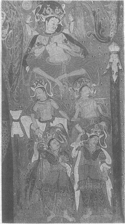 释义 | 诸天图壁画 诸天图壁画西魏。纵180厘米,横110厘米,甘肃省敦煌县莫高窟第285窟西壁主龛南侧壁画。图中上为毗瑟纽天(又名那罗延天),三头六臂,手障日月,持贝、轮等各种法器。上身赤裸,衣带飞舞,腰系过膝裙,深浅两种线条相间,褐缘,十分素雅。中为二力士,穿着与毗瑟纽天类似。再下为二天王,头戴宝冠,铠甲披身,手持兵器,一幅战将的姿态。 ☚ 化生图壁画 诸天菩萨图壁画 ☛ |