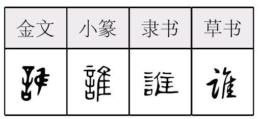 誰,形声,从言,隹声,本义读shéi,代词,表示疑问,相当于“什么人”,引申为代词,表示虚指,不确定的任何人,相当于“某人”,又引申为代词,表示任指,无论什么人,常跟“也、都、无论、不管”等搭配。又读shuí。《简化字表》类推简作“谁”。 |