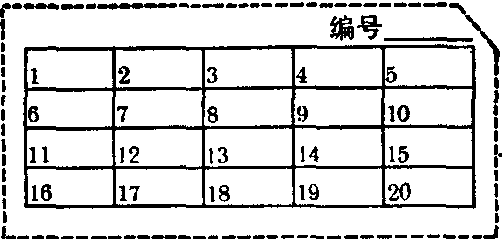 ❷分卡法就是直接把原始记录卡分别归入各组,经过核对,然后清点每组卡片的张数,就是该组的观察单位数。此法易于核对和检查错误,常用于观察单位数较多,调查项目较复杂的资料归组。如果调查表为一览表时,须先将分析项目的原始记录转抄到“过录卡片”(如图)上,然后再用分卡法归组。图中的“编号”系转抄调查表的编号,1、2、3、…每格固定转抄一个分析项目。如以过录表1为例,可规定“1”格为县名,“2”格为男或女,“3”格为死时实足年龄(岁)等。卡片右上方有缺角,更便于整理,只要一叠卡片的缺角对齐,则倒顺、反正全部一致了。