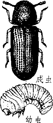 释义 | 蛀虫 蛀虫粮食、物品的蛀虫:蠹(蠹虫;蠹蝝) 蛀(蛀虫) 虫蝨 ☚ 各种害虫 吸人血的虫 ☛ 谷蠹lesser grain borer蛀食粮粒的重要贮粮害虫。学名Rhizopertha dominica (Fabri-cius)。鞘翅目,长蠹科。亚热带、热带地区发生最多,中国除西藏、新疆未发现外,其他省区均有发生。稻谷、小麦、大米受害最烈,还为害禾谷类种子、豆类、干果、粉类等。 谷蠹lesser grain borerRhizopertha dominicaFabricius,昆虫纲,鞘翅目,长蠹科。分布于热带,亚热带及部分温带地区;中国除西藏、新疆未发现外,各省区均有分布。为害谷类、豆类、竹木、中药材、图书;以稻谷、小麦为主。成虫体长约3 mm,赤褐色至深褐色,有光泽;头隐于前胸下;前胸背板近圆形,上有许多小瘤突作同心圆排列。末龄幼虫体长3~4 mm,弯曲成弓形,乳白色,头半缩在前胸内,胸部较腹部粗大。具胸足3对,各足大小相等,气门小而不显著。中国一年发生2~5代,以成虫钻入木板、竹器、粮粒,或仓外树皮缝中越冬。成虫耐热、干,常聚集在粮堆较深的部位。卵产于粮粒的蛀孔、缝隙、粉屑中。初孵幼虫钻入粮粒蛀食,直至羽化为成虫后外出,或终生生活在粉屑中。成虫和幼虫均可蛀空粮粒,大量发生时常引起粮堆发热,达40℃以上。以采用将有虫粮隔离贮存及进行药剂熏蒸为主要防治措施。 谷蠹 |