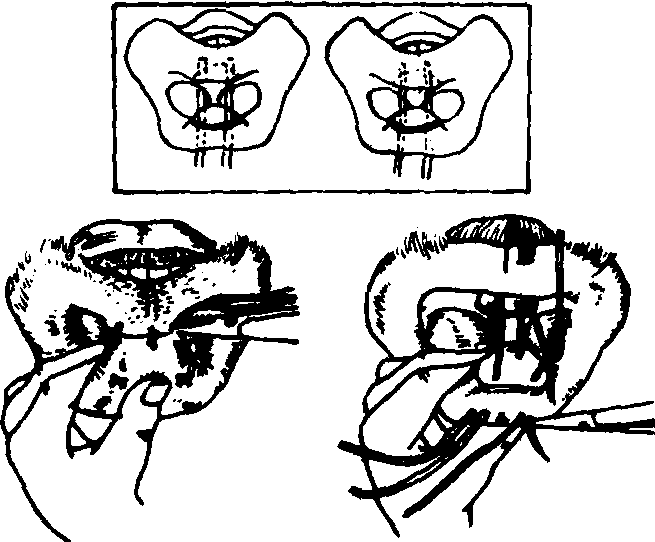 释义 | 豁鼻〈隐〉明清江湖诸行指面条。见《新刻江湖切要·饮馔类》。 豁鼻huō bí一作“千条”。明清江湖社会谓面条。《新刻江湖切要·饮馔类》:“面: 千条; 豁鼻。” 豁鼻lacerated muzzle牛上部鼻端和下端鼻镜分离的病证。役用牛特有。多因穿鼻时位置选择不当,过于靠近鼻中隔前端,拴鼻工具不良,直接用铁丝或粗绳拴牛鼻,在管理和使役中强行牵拉拴牛鼻绳,硬性撕裂鼻中隔等所致。穿鼻时手术不当,牛头保定欠妥也会直接造成豁鼻,使拴鼻工具无处拴系。治宜进行缺损部吻合术。手术取站立保定,眶下孔麻醉。手术时洗净上部鼻端和下部鼻镜。在缺损的上部鼻端约1厘米处,以刀削成蘑菇状的新鲜创面,称为公榫;在缺损的下部鼻镜的游离端削成和公榫形状、大小、长度一样的凹面,称为母榫;两榫相对,吻合密切,即可进行缝合。采用二针埋藏缝合和三针结节缝合。先行埋藏缝合,以鼻中线为准,左右侧各缝一针,在鼻外侧进针, 公榫内侧出针; 继续在母榫内侧相应部分进针,在母榫外侧部出针; 用生理盐水冲洗术部,清除血污,再将缝线收紧打结, 碘酊消毒; 然后在创口结合部左中右各加一针结节缝合。手术后要保持术部清洁, 7天内除吃草饮水外均戴口笼。5天后拆除结节缝合, 8天后拆除埋藏缝合(图)。 豁鼻缝合法 豁鼻laceration of the muzzle钝性磨损、切割、撕裂等引起的一种鼻缺损。常见于役用牛,尤以性情执拗的水牛多发。豁鼻症状明显,基本上分上部鼻端与下部鼻镜两部分。作两侧眶下神经传导麻醉,采用公母榫吻合术。术后加强护理,效果良好。 |