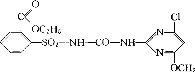 释义 | 豆磺隆chlorimuronethyl又称氯嘧磺隆。磺酰脲类选择性内吸除草剂。化学名称:(4-氯-6-甲氧基-2-嘧啶基)-氨基羰基氨基-2-磺酰基-苯甲酸乙酯。化学结构式如下。纯品为白色结晶状固体,熔点186℃,不溶于水,可溶于丙酮、乙醇等有机溶剂。可被植物的根及叶片吸收,并在体内传导至全株。在敏感植物体内抑制乙酰乳酸酶(ALS),从而阻碍亮氨酸,缬氨酸和异亮氨酸的生物合成,使细胞的分裂和生长受阻。而在大豆体内能很快被代谢而成无毒物。用于大豆田防除多种阔叶杂草和禾本科杂草,如藜、蓼、苋、香附子、苘麻、苍耳、黄花稔、牵牛、葎草、稗草、早熟禾、狗尾草等。在大豆芽前或芽后,使用有效成分7.5~15 g/hm2。对人、畜低毒,大鼠急性口服LD50为4 100 mg/kg,兔急性经皮LD50>2 000 mg/kg。 |