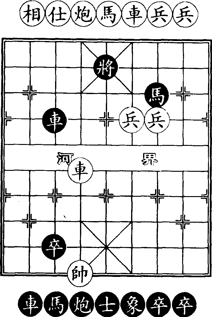 释义 | 象棋棋盘和棋子 象棋棋盘和棋子棋盘系由9道纵直线和10道横线交叉组成,在棋盘上形成90个交叉点。棋盘中间没划通纵直线的地方叫“河界”,双方棋局后中部划有交叉线(使4个格划成米字形)的地方叫“九宫”。棋子总共有32枚,分黑、红,各占16枚,各刻有7种名称。红棋子:帅1枚,车(音ju)、马、炮、相、仕各2枚,卒5枚;黑棋子:将1枚,车、马、炮、象、士各2枚,兵5枚。对局开始前,双方棋子放在棋盘上相应的固定交叉点上,行棋时,按行棋规则棋子可走在90个交叉点上,每个交叉点只允许落1枚棋子。 象棋棋盘与棋子 ☚ 象棋 象棋行棋法 ☛ |
