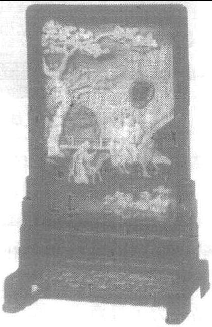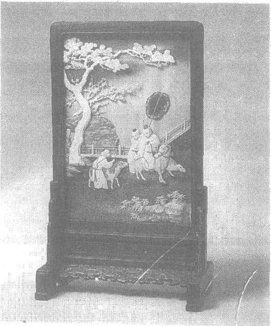 清代宫中室内几案上的陈设品。雍正五年 (1927) 清世宗胤禛命造办处牙匠制作此件插屏。插屏通高60.1厘米,屏心纵46.6厘米,横33.8厘米。“三羊开泰” 是明清书画、工艺品所广泛采用的题材之一,“羊”通“阳”字,意为新春吉祥,为岁首颂祝之吉词。此件象牙雕插屏四周包镶红木框,框下嵌刻兽面牙板,两侧承镂刻方夔纹站牙及回纹支座。插屏屏心以象牙为主体,刻“三羊开泰婴戏图”,三稚童嬉戏于三只白羊之间,或撑扇,或持鞭,或骑羊,神态各异,气氛欢洽,构图灵活,另衬以立体嵌松、竹、梅、石、水仙及栅栏。插屏背面裱洒金黄绢,上书行楷五言诗句: “两洗高秋净,天临大野闲。葱茏清万象,缭绕出层山。日落千峰上,云销万壑间。绿萝霜后翠,红叶两来殷。散彩辉吴甸,分形压悲关。欲寻霄汉路,翘首愿登攀。” 末署 “朱延龄秋山极天净诗”款。这件象牙雕插屏受明末清初 “周制百宝嵌”作法的影响,利用立体拨镂嵌刻、染色等技巧刻制而成,雕工精细,图案层次分明,景物栩栩如生,是清代雍正时期牙雕艺术珍品。