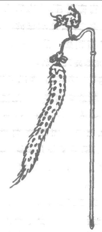 古代名物 > 朝制類 > 儀仗鹵簿部 > 扇幡 > 豹尾旛 豹尾旛 bàowěifān 旛之一種。多爲清代皇帝鹵簿所用。其制:攢竹爲桿,朱漆塗之,長一丈,圍四寸三分,上爲曲項,加塗金龍首,銜金鐶繫豹尾。豹尾長八尺,上銜金葉,冒以緑緑革,綴金鈴四,高二寸五分,徑三寸三分。《清史稿·輿服志四》:“皇帝大駕鹵簿……龍頭旛四,豹尾旛四,絳引旛四,信旛四。” |