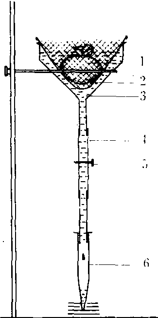 释义 | 贝曼漏斗技术Baermann funnel techniques利用玻璃漏斗分离活跃线虫的方法。由贝曼(Baermann)创用的一种分离方法。所用设备和操作方法简易,沿用历史长,不少实验室至今仍用作分离植物组织内线虫的主要手段。在漏斗柄端接一段橡皮管。管后端用铗子夹紧。分离时将漏斗固定在支架上。将纱布包裹的植物材料或土壤样本放进漏斗内并加水淹没。由于线虫的趋水性和自身重量使其不断脱离植物组织或土粒,通过纱布向水中游动,并沉降至橡皮管末端的离心管水中。这种装置的分离时间常限制在24 h以内,否则线虫因缺氧而死亡。另外分得的线虫悬液往往含有许多土粒。 漏斗分离装置 1.样本 2. 铜筛 3. 水 4.橡皮管 5. 弹簧夹 6. 离心管 |
