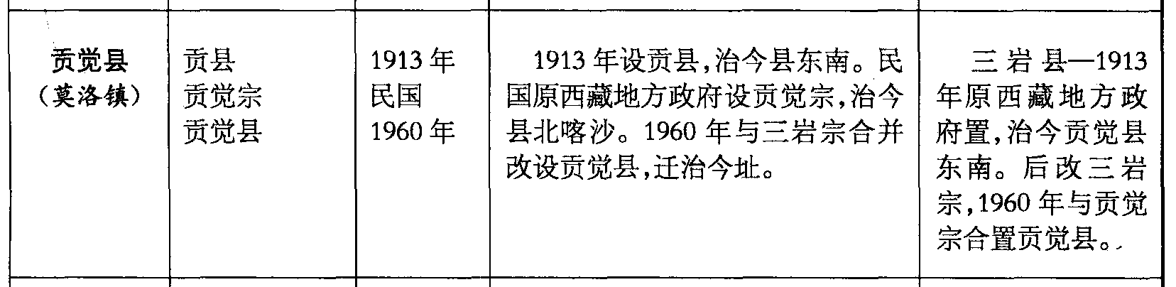 贡觉县(莫洛镇)贡县贡觉宗贡觉县1913年民国1960年1913年设贡县,治今县东南。民国原西藏地方政府设贡觉宗,治今县北喀沙。1960年与三岩宗合并改设贡觉县,迁治今址。三岩县—1913年原西藏地方政府置,治今贡觉县东南。后改三岩宗,1960年与贡觉宗合置贡觉县。