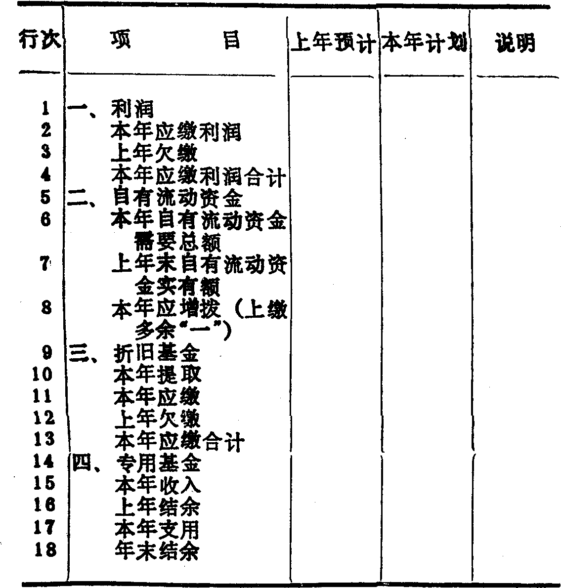 企业汇总反映在计划年度内财务收支情况、财务成果,以及企业与国家之间的缴拨关系等的总表。它是根据利润计划表、自有流动资金计划表、固定资产折旧计划表、和“专用基金计划表” 中的资料,以及上年结转的数字指标汇总编制的。其参考格式如下:
