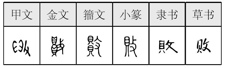 bài敗,表意,从攵或攴,从貝(或二貝),表示手持棍棒击贝壳,本义为毁坏,引申为打败、失败、衰落等。《简化字表》类推简作“败”。败〈动〉倒霉;倒运。 《金》二: 婆子暗道:“来了,这刷子当~。” |