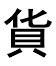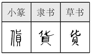 【提示】上右是 , 撇与竖弯钩相交、出头,不要错写成相接、不出头的匕。 *货(貨)huò8画 贝部 (1) 财物: 杀人越~。 (2) 商品: 百~|售~|进了一批~。 (3) 指人(骂人的话): 蠢~|泼辣~。 (4) 〈书〉 卖: ~卖。 货貨huò商代和西周的王用“贝”赏赐,可铸青铜,等。战国时炼铁多,货币大量增多。开始用“化”字作货字的初文。因用其交易,变为各种东西,是变化义。小篆后增贝(貝)旁,“贝”代表钱财;从化,化亦声。韵变如化讹、剐锅例。本指通行的钱币。所以钱币称通货。货币即钱币。引申指货物,商品。如:进货|订货。组词如:货郎。又引申为“卖”。 货貨★繁◎常★常