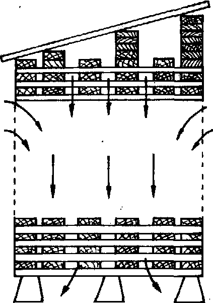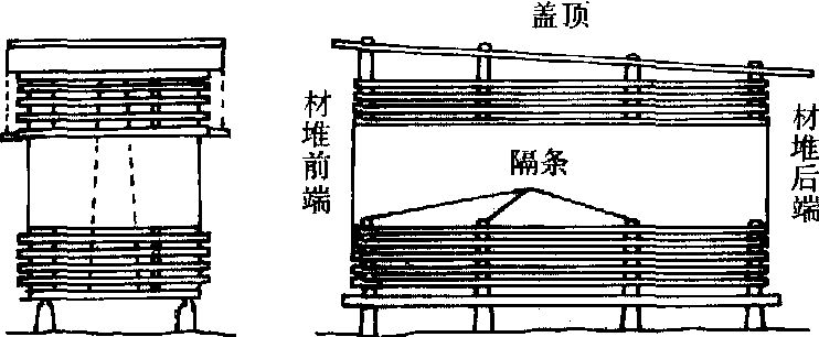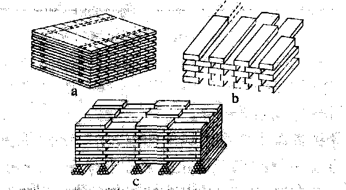 释义 | 贮材场lumber yard制材厂对锯材进行分类、存放、天然干燥和调拨发运的场所。又称板院。贮材场靠近交通线设置,要求周围无密集的高层建筑和树木,与居民区、锅炉房等火源发生地保持较远距离。场地要求地势平坦,土质渗水性好,地下水位较低。 垛积区划分 按垛积锯材的树种、材种和尺寸,可分为中薄板区、枕木(特大方)区、特殊材种区、小规格材和次材区等。为方便装运,对体积和容重较大的材种,如枕木、罐道木、机台木等,一般都在靠近专用线或其他运输线一侧设置垛积区。中薄板在高含水率情况下,水分蒸发面大,宜在场区边缘位置垛积。容易产生开裂、变形缺陷的硬阔叶树锯材的垛积区,一般都设在背主风方向或场区中央。 场区道路布置 视场地面积大小、分区多少、场地运输方式等具体情况而定。采用有轨平车运输,纵道宽度一般为2~3米,但考虑防火需要,应另外加宽3~5米。采用叉车、跨车等运输设备运输,道路宽度在10~12米左右即能满足运输和防火需要。纵向通道以南北向并保持与主风向平行最为适宜。横道,其宽度可在5~8米范围内选定。 贮材场作业 按作业程序可分为锯材分类和合理垛积。 锯材分类 对运进现场的锯材,按不同树种、尺寸、等级进行分类。 合理垛积 将各类锯材按指定的垛积区,分别采用相适宜的垛积方法进行垛积。垛积方法,随场地自然条件和锯材的材种、尺寸及贮存期长短等情况而异,一般分为平垛、竖垛、密实垛、通风垛、纵横交错和三角交叉等垛积方法。❶平垛:又称层积垛。即将锯材分层与地面平行进行垛积。从垛底第一层起,按规定横向依次铺放,板与板之间留一定间隔,然后90°交叉再依次铺放第二层,如此交叉垛积,直到预定高度为止,最后加盖封垛(图1)。此种垛积方法应用比较广 图1 平垛积法 泛。❷竖垛:使锯材纵长方向略微倾斜竖立于地面,上端靠在固定支撑物上进行堆积。竖堆还分为“靠堆”、“交叉斜堆”等多种形式。竖堆一般多为生产规模小,且进行深加工的小型工厂所采用。在中国南方或多雨地区较为常见。 ❸密实垛:与平垛相近。被垛积的锯材不留间隔,不加垫条,纵向或纵横交错块块相接垛积。一般多在场地面积小或锯材贮存期短,不致在保管期间发生变质的情况下采用。中国北方冬季生产时,也常采用此法垛积锯材。 ❹通风垛:又称垫条垛。用特备的干燥垫条衬垫在各垛积层中间,形成水平通风口,以促进干燥。垛内通风口大小,由增减垫条厚度和垫条间隔来调节(图2)。通风垛积法,还可直接用垛内的板、方材代替垫条呈“品”字形或两板交错进行垛积。 图2 通风垛积法 垛堆基础设置 正确选择设置垛积基础,是锯材垛积作业的重要前提。垛积基础分固定式和移动式两种。❶固定式基础:适于垛积期长、材种不经常变换的锯材或垛积在低洼潮湿场地设置时采用; ❷移动式基础:具有随意变动基础的位置和调整基础的间隔、距离的特点,最适于在地势平坦、土质坚实的场地条件设置使用。 垛堆气流循环 空气在垛堆内部循环流动效果好坏,直接影响锯材天然干燥周期的长短和保管质量的好坏。在锯材垛积作业中,通过合理地设置垛基高度及通风口的大小,调节空气在垛堆内的流动效果。垛堆的空气分水平和垂直两个方向流动。水平方向流动是在外界风力的作用下形成的;垂直方向流动是借助合理配置垛堆通风口和正确选用垛堆基础高度等措施来实现。白昼外界温度高,热空气从垛堆顶部及侧面进入垛堆内部与锯材表面接触吸热后,水分开始蒸发,空气温度逐渐降低,随着空气的比重增加,水平方向流动减弱,在通风口作用下,构成垂直气流,最后由垛堆底部流出(图3);夜间,大气温度比垛内下降得快,垛内温度比垛外高,外界冷空气经垛堆基础底部流进垛内,迫使垛内热空气经垛堆顶部向外流出,由此而使空气在昼夜温度差作用下形成反复的循环流动。冷热空气在垛内循环流动过程中,不断使木材蒸发的水分排出垛外而逐渐变干。 图3 昼间气流在垛内 |