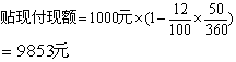例如,一张票据面额为10000元,50天后到期,年贴现率为12%,银行向持票人们付现额为: