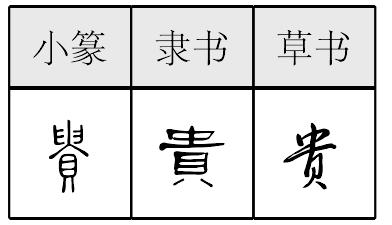 ❹ 达官显贵|都城纸贵|多贱寡贵|夫荣妻贵|降尊纡贵|京师纸贵|屦贱踊贵|洛阳纸贵|难能可贵|亲不敌贵|荣华富贵|物稀为贵|挟长挟贵|雍容华贵|纡尊降贵|知希则贵 贵guì (甲) (篆) 甲骨文、金文为会意字,上部是两只手,中间表示有所持。所持者,似土块,似金属锐器。小篆变为“人“,似“臾”;下部加“贝”。“贝”表义,“臾”为声。“臾”是个多音字,与“蒉”(kuì)通。《论语》中“荷臾而过孔氏之门”的“臾”即“蒉”(一种草编的筐)。“贵”现为“贱”的反义词。作声符生成的字有: guì 櫃(简化为“柜”,橱柜) kuì 溃(崩溃) 馈(馈赠) 篑(功亏一篑) 聩(振聋发聩) 愦(昏愦) 蒉(草编的筐子) huì 缋(《说文》:“缋,织余也。”) wèi 遗(赠送,“一截遗欧,一截赠美,一截还东国”) yí 遗(遗失) 相关链接 “遗”,手中贵重物品丢失了,与“轶”(yì)义相通,故借“轶”之音读为yí。