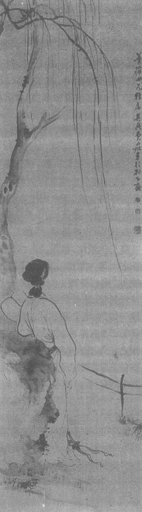 释义 | 费丹旭秋风纨扇图轴 费丹旭秋风纨扇图轴清。费丹旭绘。纸本墨笔。纵149.8厘米,横44.5厘米。上海博物馆藏。费丹旭(公元1801—1850年),字子苕,号晓楼,晚年号偶翁,又号环渚生,乌程(今浙江吴兴)人。曾卖画于江、浙两省,青、中年时居杭州时间较多,晚年寓居上海,终于沪寓。擅长写照,所作肖像画,传神生动,名噪一时。尤精仕女画,笔法秀润,设色淡雅。偶作山水、花卉,清灵秀雅。工书,善诗,著有《依旧草堂遗稿》。此幅是费丹旭仕女画的代表作品。墨色疏淡,补景得宜,意境深远。采用墨笔写意的画法,描绘了一位手执凉扇背立于秋风中的妇女。她倚石而望,左前方一株高大的柳树,光秃的枝条从画面上方无力的垂下,在微风中摇曳,喻示着秋的来临。她面前有几根栏杆,而栏杆外却是空茫一片,不由引人联想,她在看什么?是水影?还是落花?是远处的山?还是浮动的云?富有动感的线条勾出了简单的衣衫,表现了夏衣的轻薄;浓润的墨块点出了头发。仕女画的题材在清代得到了很大的发展。在继承传统的同时,更多的趋向于文学性。这类秋风思归的题材便是文人画家所经常表现的。费丹旭的这幅画无疑是这类题材作品中的佳作。画中疏落的柳枝、人物的背影以及时过景迁却仍持在手的凉扇和栏杆外的一片空茫无不使人感到淡淡的秋意,通过简静而巧妙的构图,准确地表现了主题。 (朱本山水图轴) ☚ 朱本山水图轴 王素钟馗图轴 ☛ |