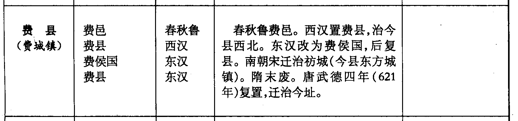 费县(费城镇)费邑费县费侯国费县春秋鲁西汉东汉东汉春秋鲁费邑。西汉置费县,治今县西北。东汉改为费侯国,后复县。南朝宋迁治祊城(今县东方城镇)。隋末废。唐武德四年(621年)复置,迁治今址。