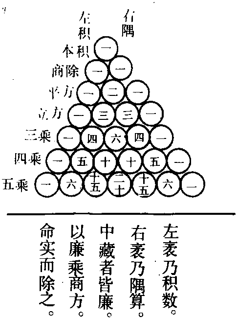 【评】开方作法本源系贾宪首创,今称贾宪三角,西方十七世纪出现的巴斯加三角与此相同。其每一行都是某次幂的二项展开式的系数。增乘方求廉法给出了求各项系数的一般程序,由此可知,贾宪已能求出任意层数的贾宪三角,能开任意高次的方,而且,求廉的增乘方法即随乘随加方法开辟了开方运算的新蹊径。实际上,在中国数学史上,贾宪三角的主要意义不在于开方,而在于垛积。元朱世杰《四元玉鉴》的“古法七乘方图”,用两组分别平行于左斜、右斜的直线将1,1,1,1,……;1,2,3,4,……;1,3,6,10,……;1,4,10,20,……;……连结起来,这些数列恰恰是朱氏所解决的各种垛积的各项,说明朱氏各种垛积公式即高阶等差级数求和问题的解决与贾宪三角有密切关系。在此基础上,清数学家项名达、李善兰等又创造了各种数字三角形,都可以称为增广贾宪三角,清代数学家借此解决了各种更为复杂的垛积问题。