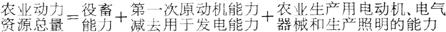 释义 | 农业动力资源总量 指一定时期的机械动力和畜力的总量。 机械动力指各种原动机所提供的动力,除电力原动机外,一律用马力计量。拖拉机的动力按引擎马力计算。电力原动机(包括发电机、电动机)和各种电气器械等的能力,用千瓦为单位,1千瓦=101.9公斤米/秒。 在计算动力资源总量时,须将千瓦换为马力,换算系数是1千瓦=101.9/75米/秒=1.36马力。 畜力指各种役畜的能力,根据各种役畜的平均体重、牵引力与体重间的比率以及每秒行走速度计算。如役马牵引力相当于其体重的14%,马体重为400公斤,马行走速度为4公里/时或1.1米/秒,则马的牵引力=400×14%=56公斤,役马能力=56×1.1=62公斤米/秒,或等于62/75=0.83马力。实际工作中,有关部门统一规定有各类役畜能力的系数,可直接计算。 农业动力资源总量计算公式为: 例如,某国营农场拥有拖拉机5台,其引擎马力200马力,农用汽车2辆80马力,柴油机8台51马力,其中一台用于发电12马力,电动机50台300千瓦,生产照明为20千瓦,役用马、骡20匹每匹0.8马力,役用驴、牛10头每头0.5马力。计算该国营农场的农业动力资源总量如下: (1) 役用能力=(20×0.8)+(10×0.5)=16+5=21 (2) 直接服务于工作机的第一次原动机 319 拖拉机 200 农用汽车 80 柴油机(51-12=39) 39 (3) 电动机和生产照明 435.2 电动机(1.36×300) 408 生产照明(1.36×20) 27.2 代入上式: 农业动力资源总量=21+319+435.2=775.2(马力) |
