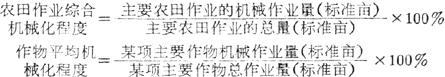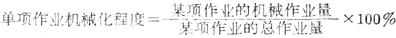 这一指标只能说明某一项作业的机械化程度,,而不能反映一个生产过程、一个生产部门或一个企业的全面机械化程度。 作业综合机械化程度,指农业中主要作业中机械作业量占总作业量的比重。作物平均机械化程度,指某一主要作物生产过程中的机械作业量占总作业量的比重。 这两个指标的计算,先要把各项作业量折算成标准亩作业量。计算公式为: