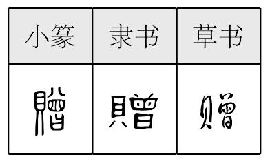释义 | 赠 赠zèng赠送。《郑风·女曰鸡鸣》三章:“知子之来之,杂佩以赠之。”郑《笺》:“赠,送也。我若知子之必来,我则豫储杂佩,去则以送子也。”《秦风·渭阳》一章: “何以赠之,路车乘黄。”毛《传》: “赠,送也。”路车,诸侯之车。乘黄,四马皆黄。《大雅·韩奕》三章:“其赠维何?乘马路车。”郑《笺》: “赠,送也。王既使显父饯之,又使送以车马,所以赠厚意也。” ☚ 𪩩 曀 ☛ 赠读音z·eng(ˋ),为eng韵目,属ing—eng韵部。昨亘切,去,嶝韵。 上一条: 罾 下一条: 贈 赠〔zeng〕 gangs. ![]() ![]() ![]() 赠贈zèng赠送 赠zèng赠把东西无代价地送给别人:~礼︱~品︱~言︱~阅︱~送︱~与︱~答︱敬~︱赙(fu)~︱馈(kui)~︱捐~︱转~︱追~。 赠zèng赠送,送给:赠诗│赠言│赠阅。 赠zeng赠答 赠礼 赠品 赠送 赠言 赠阅 捐赠 馈赠 转赠追赠 采兰赠芍 赠zèng把东西送给别人;赠送:五儿听罢,便心下要分些(茯苓霜)~芳官,遂用纸另包了一半。(六一·1434)只是我与婶婶好了一场,临别~你两句话,须要记着。(十三·271) 古代名物 > 禮俗類(上) > 喪葬部 > 殮具 > 贈1 贈1 zèng 送給喪家助生送死的車馬、衣被、錢物的總稱。《禮記·文王世子》“至于賵賻承含皆有正焉”漢·鄭玄注:“承讀爲贈,聲之誤也。正,正禮也。”孔穎達疏:“賵賻含襚,皆贈喪之物。賵車馬,賻財帛,含珠玉,襚衣服,㧾謂之贈。” 赠赍、馈、授、贻、遗、与、予、赠;受○赍jī(动)把东西送给人:~赏|~送|~书|~黄金千两。 ○馈kuì(动)赠送:~赠|~贻|~贶 |~遗|~生鱼,畜之池。 ○授shòu(动)交付;给予:~予|~旗|~奖|~权|~衔|~人以柄|~人口实|~手援溺。 ○贻yí(动)赠送;给予:馈~|~我彤管|只有形式和内容二者的高度统一,才能~人以最大的享受。 ○遗wèi(动)赠送;送给:~札|~书 |~问 |~语|~赠 |~大投艰。 ○与yǔ(动)给予:付~|交~|施~|赠~|寄~|~民休息|~虎添翼|款待二人,~了赏钱。 ○予yǔ(动)给:给~|赐~|赋~|准~离境|免~处罚 |请~批准|~以协助|授~学位|~人口实|生杀~夺。 ○赠zèng(动)赠送:~阅|~言|~礼|~品|馈~|敬~|捐~|转~|追~|绨袍之~。 ●受shòu(动)接受:~礼|~赏|~贿|领~|承~|~禄|立功~奖|私相授~|逆来顺~|小杖则~,大杖则走。 赠zèng〖动词〗 赠zèng❶ 赠送,送给。《左传·僖公三十三年》:“释左骖,以公命~孟明。”白居易《琵琶行》序:“因为长句,歌之~之。” 赠*赠zengD4F9 赠送 赠送赠(赠与;赠贻;赠赉;赠馈;赠贶;赉赠;遗赠;贻赠) 送(送以;送给;送似;送与;送遗;遗送; 另见:赐予 授予 送物 礼物 贿赂 ☚ 赠送 赠送财物 ☛ 追加 追加死后封赐:追赐 追锡 ☚ 分封 封官 ☛ 赠贈zèng昨亘切,去嶝。 赠zèng把东西无代价地送给别人。如:赠品,赠阅,赠言。 赠(贈)zènɡ (赠送) give as a present; present as a gift: 馈 ~ make a present of sth.; 捐 ~ donate; make financial or other contribution; 遗 ~ leave as a gift; 此砚乃老友所 ~。 This inkstone is a present from an old friend of mine. 赠贈zèng(16画) *赠(贈)zèng16画 贝部 把东西无代价地送给别人: ~礼|~言|~答|捐~。 赠贈zèng甲骨文和两周金文作曾。曾从八从田从甘(或口)。甲骨文只从八、田,象分田义。西周金文即用曾为赠与义。曾是增的本字。《说文》小篆曾字形误,又误释为虚词,另有小篆赠字,从貝从曾,曾亦声。送给义。即把东西无代价地送给别人。如:赠品|赠阅。 赠贈★繁◎常★常zènɡ贈,形声,从貝,曾声,本义为把东西无偿地送给别人,引申为送给。《简化字表》类推简作“赠”。 |