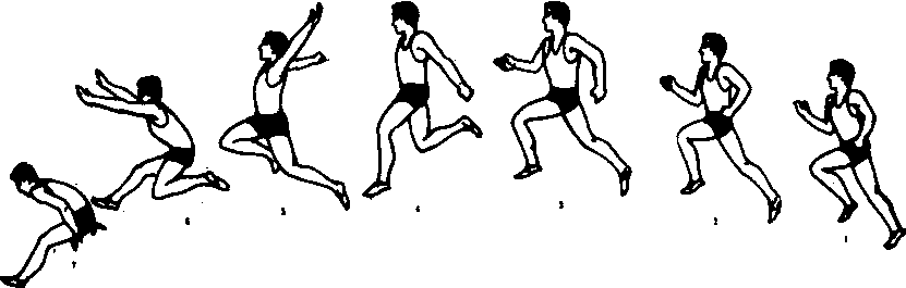 ❷最后半步是摆动腿前摆向起跳腿靠拢,两臂向前、下摆,上体前倾,两腿前伸落地。教学重点: