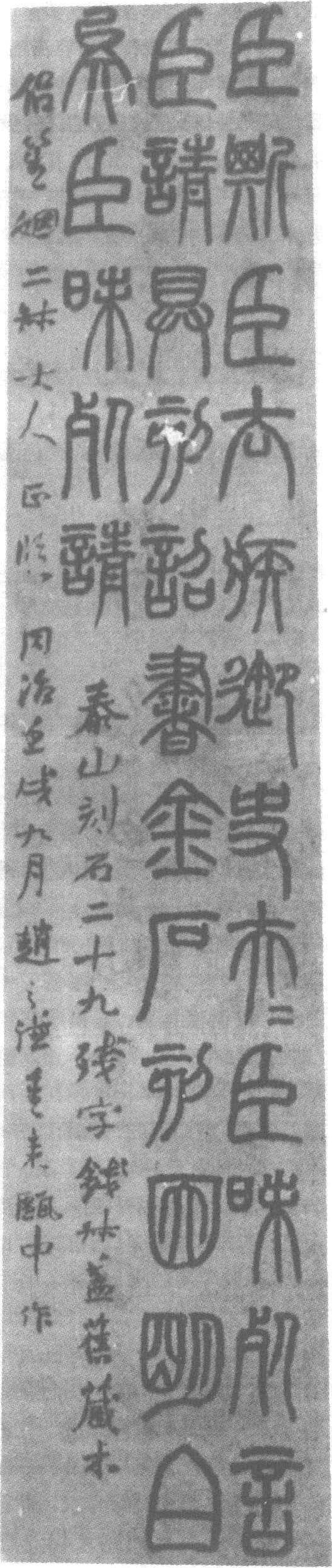 清。纸本。纵130.7厘米,横29厘米。天津市艺术博物馆藏。赵之谦(道光九年—光绪十年,即公元1829—1884年),初字益甫,后改字㧑叔,号冷君、悲盦、铁三、孺卿、梅盦、无闷、憨察、思悲翁等,会稽(今浙江)人。咸丰九年(即公元1859年)举人,历官江西奉新、鄱阳知县。工刻印,师邓石如,工整秀逸,但缺自然古朴之致。擅画,以书法用笔写花卉木石,为清末著名的写意花卉画家。篆书、隶书师邓石如,同时以北碑写行书,不为邓氏所束缚,自出新意。楷书初学颜真卿,后在包世臣的书学理论指导下,改学北碑,继承了北碑的优良传统,加以篆、隶笔法,破晋、唐之风格,创出“颜底魏面”的独特风貌。清康有为《广艺舟双楫》云:“㧑叔学北碑,亦自成家,但气体靡弱。今天下多言北碑,而尽为靡靡之音,则㧑叔之罪也。”近人马宗霍《霋岳楼笔谈》云:“㧑叔书家之乡原也,其作篆隶,皆卧毫纸上,一笑横陈,援之不能起,而亦自足动人。行楷出入北碑,仪态万方,尤取悦众目,然登大雅之堂,则无以自容也。”著有《二金蝶堂印谱》、《悲庵居士诗賸》、《六朝别字》、《补寰宇访碑录》。《泰山刻石》相传是秦代李斯所书,浑圆严整,为小篆正宗。明嘉靖时刻石尚存29字,清乾隆五年(即公元1741年)遇火,现仅存烬余九个半字,在山东泰安岱庙。明代安国藏宋拓165字影印本为最旧。此幅作品是同治元年(即公元1862年)赵之谦34岁时所临写的秦代《泰山刻石》29残字:“臣斯,臣去疾,御史夫,臣昧死言:‘臣请具刻诏书金石,刻因明白矣,臣昧死请。”此用笔和结构融合了周秦的金文与石刻,并参以隶书和北魏的笔意,结体修长,比原刻更具纵势,方折和圆转兼用,使书方圆合度巧逸,笔法流畅婉约,既有《泰山刻石》的意蕴,又具有书家个人的性情和书风。